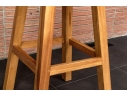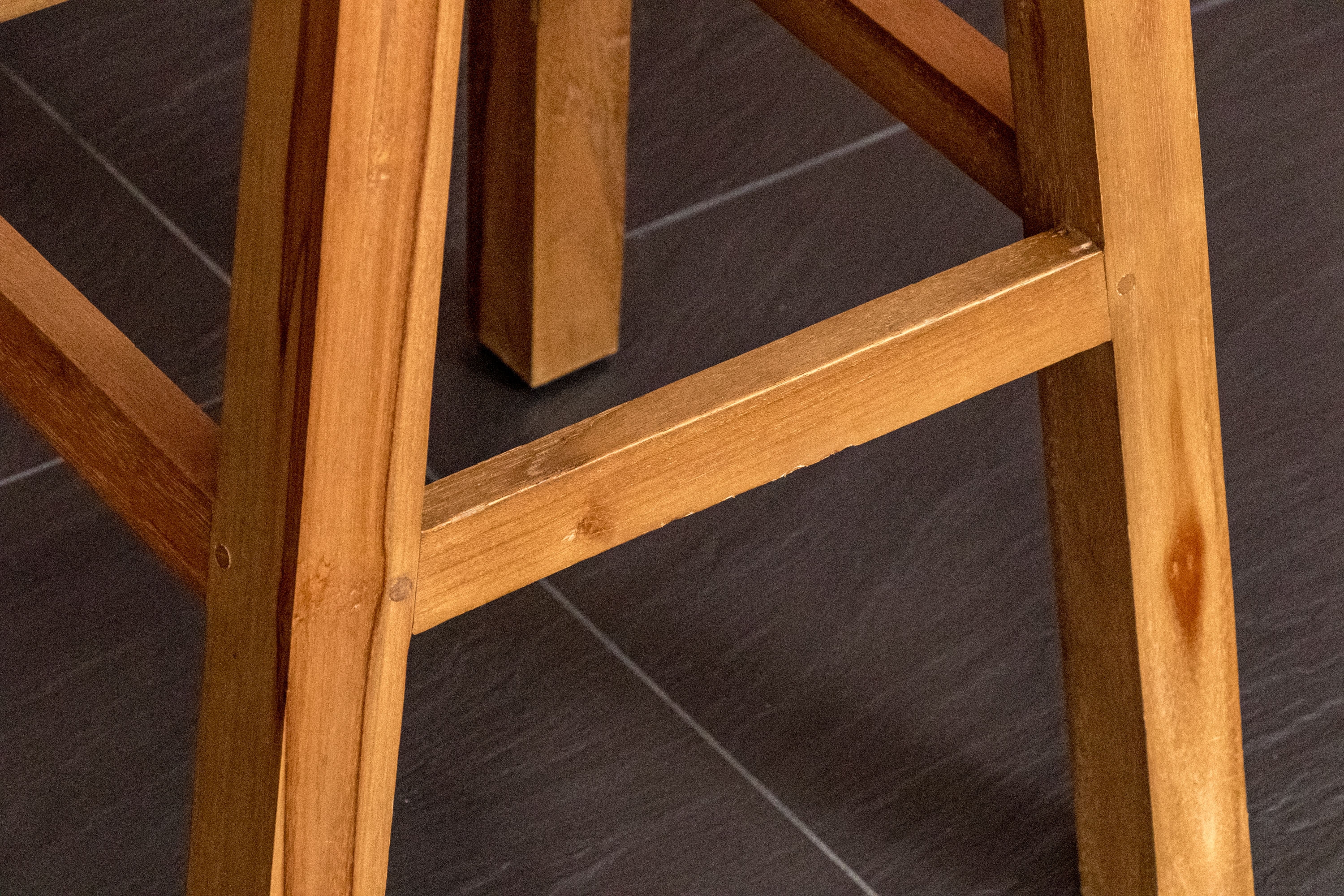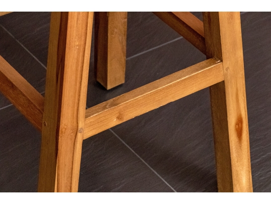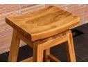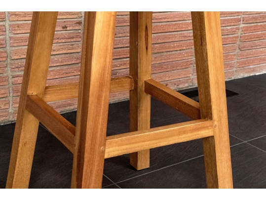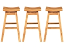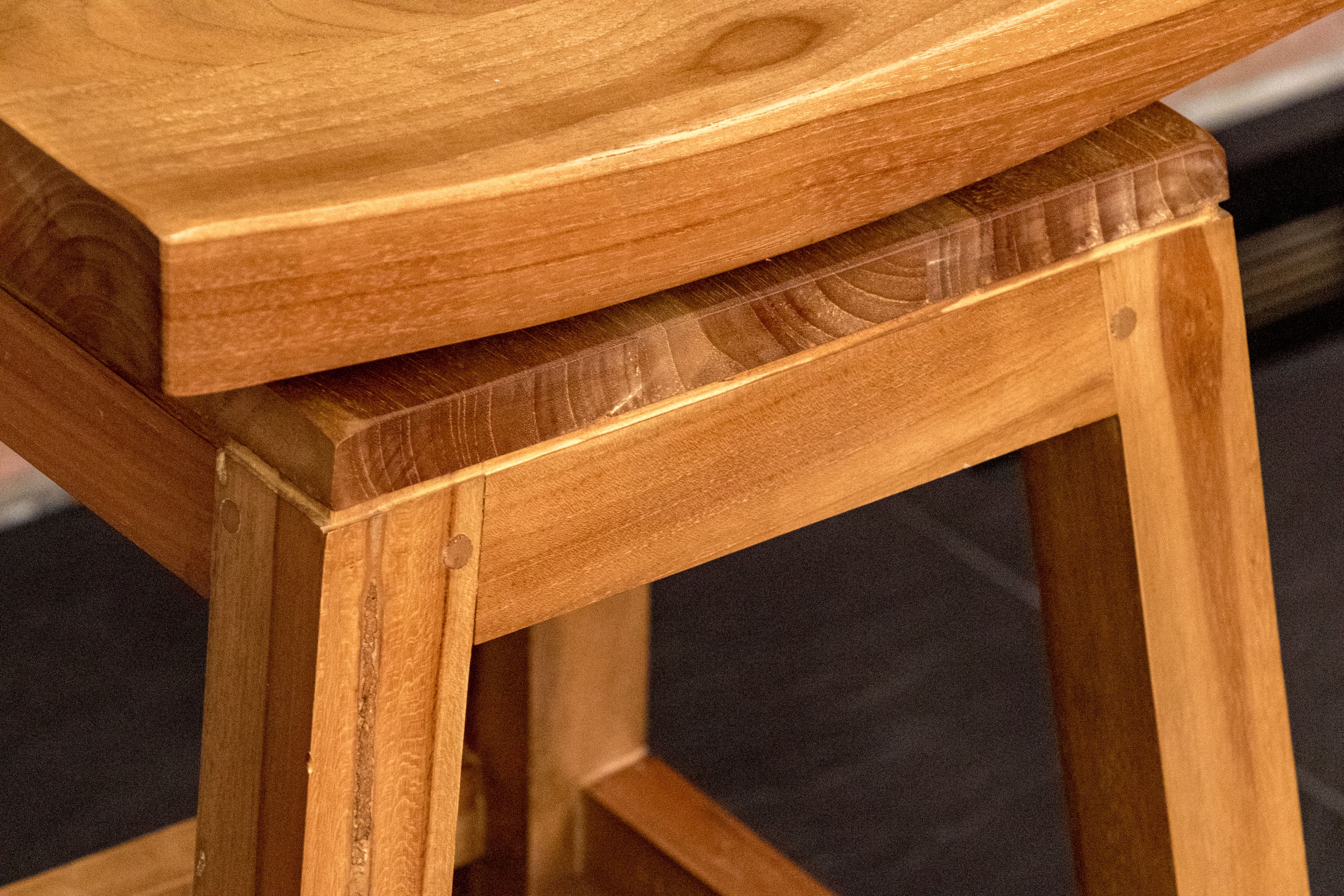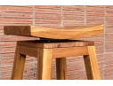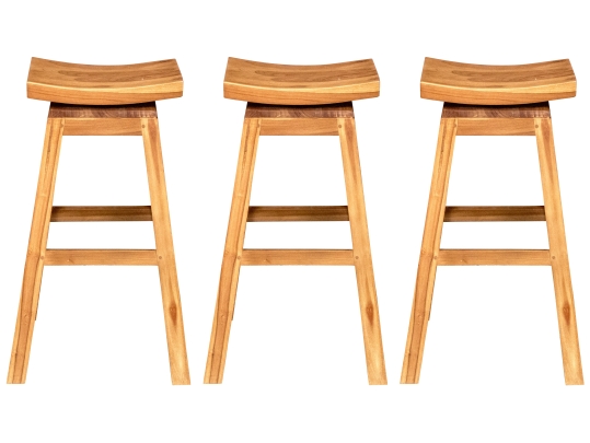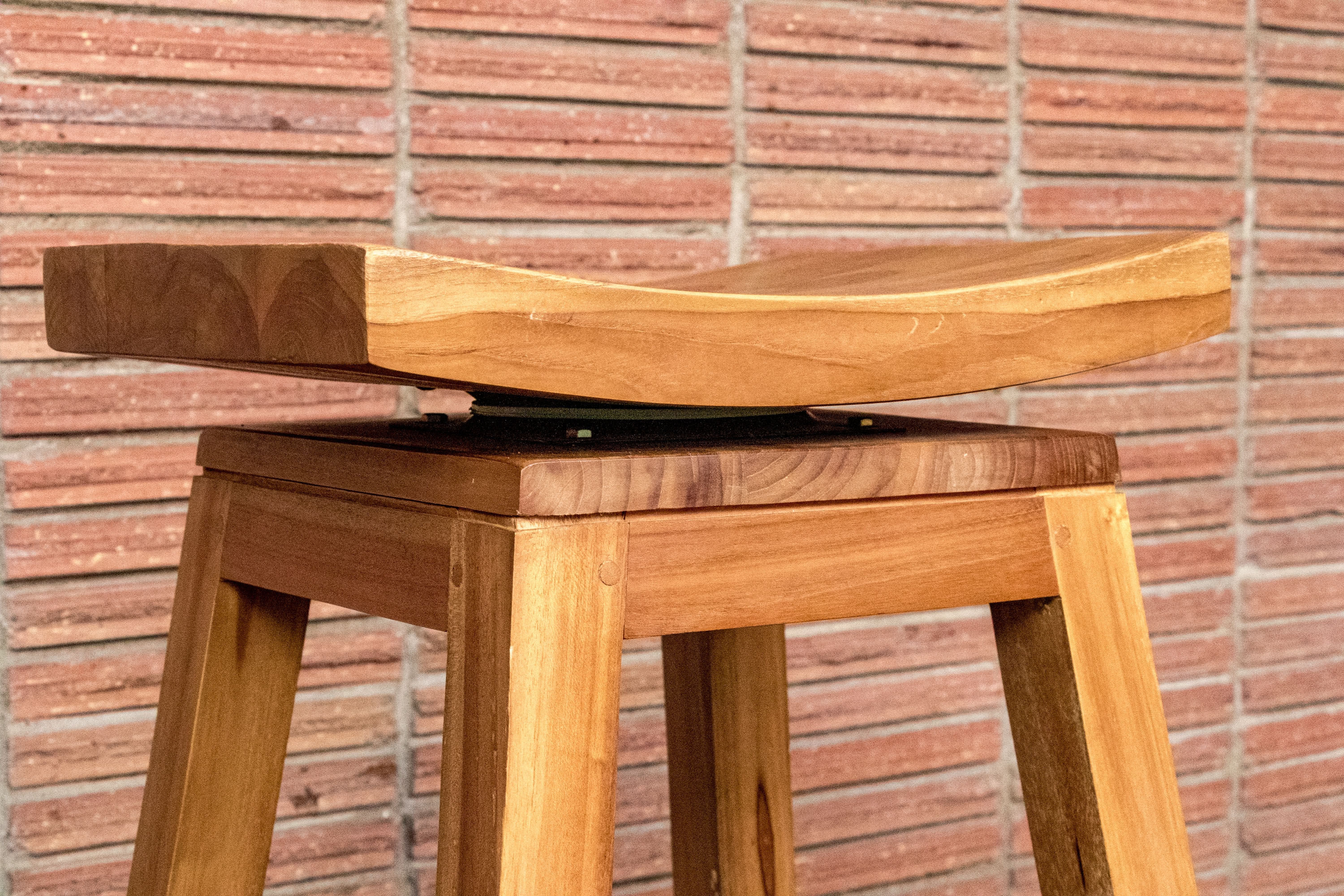 A group of three very solid feeling Teak Bar Stools with comfortable curved seats and simple angled legs with stretchers. Made in Indonesia, the Teak is a warm honey tone and the comfort is notable.