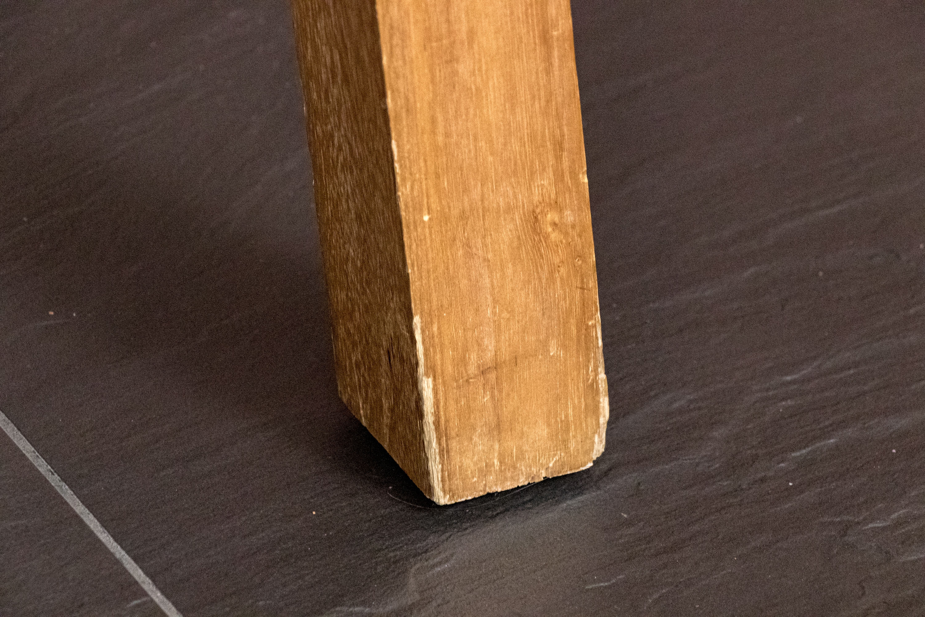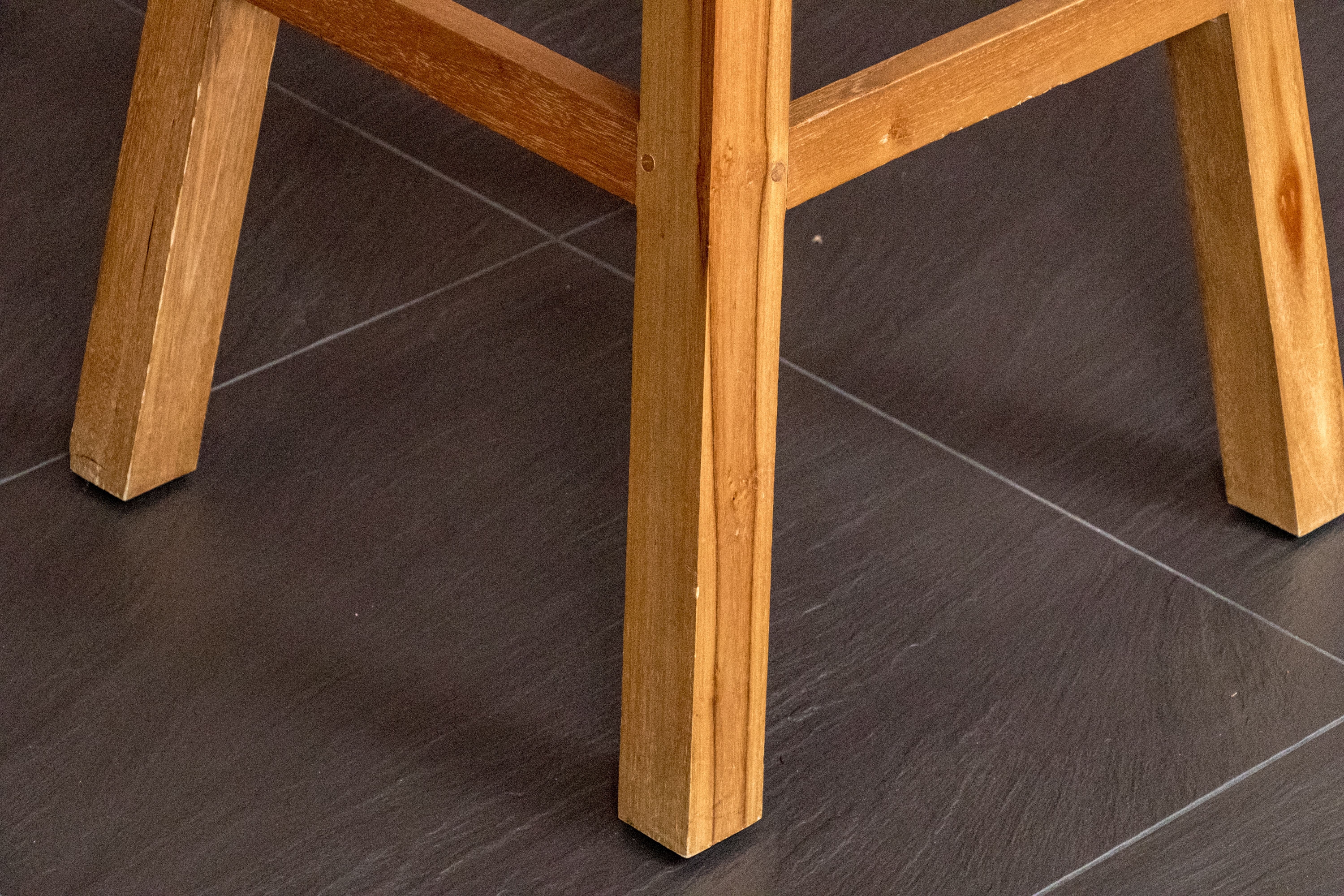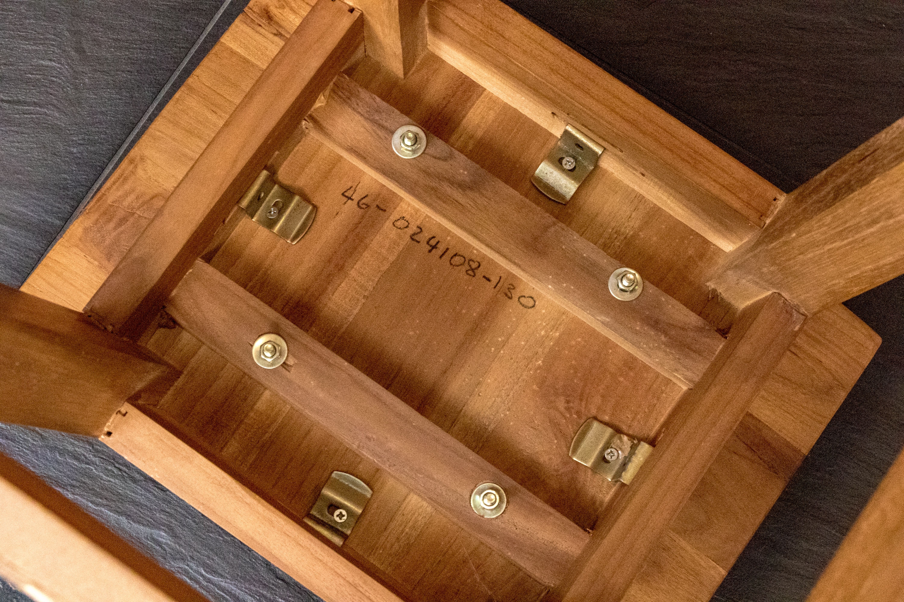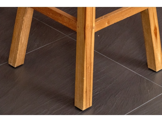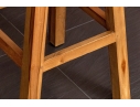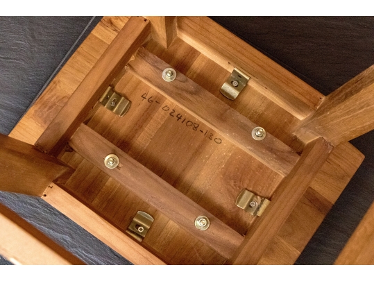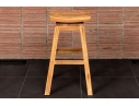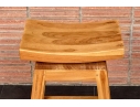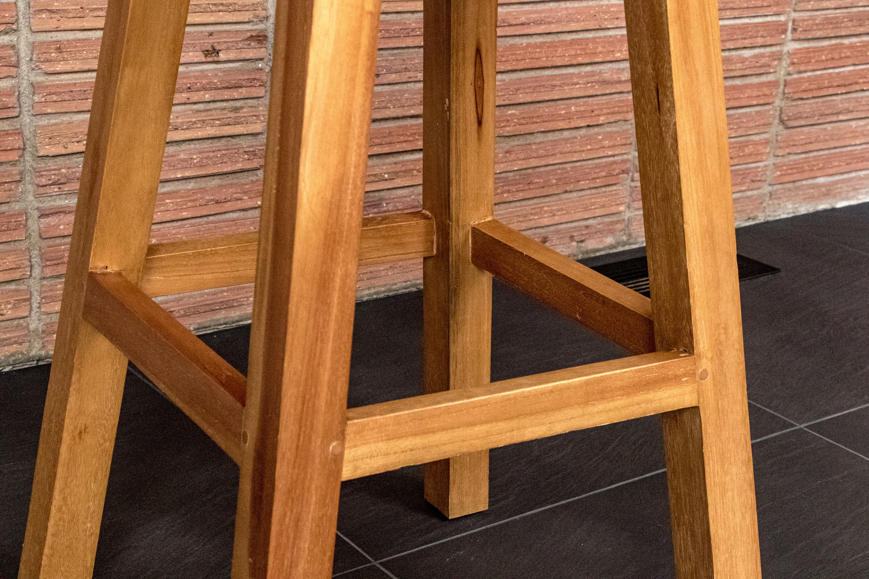 A group of three very solid feeling Teak Bar Stools with comfortable curved seats and simple angled legs with stretchers. Made in Indonesia, the Teak is a warm honey tone and the comfort is notable.
