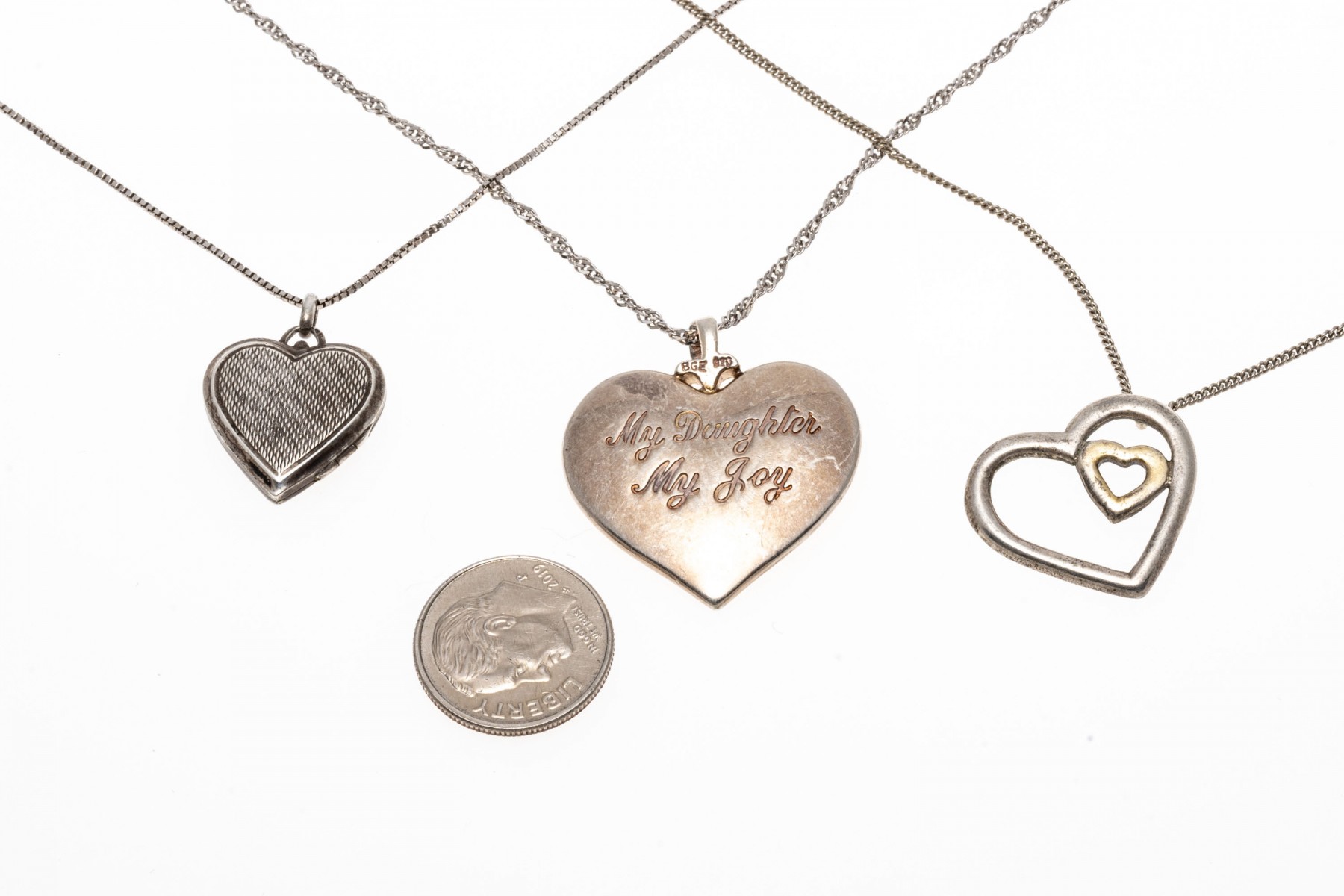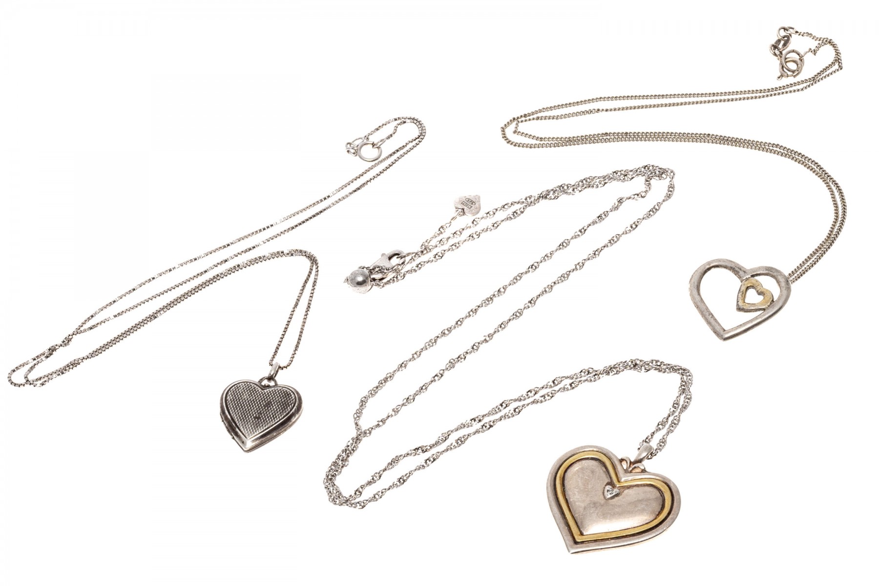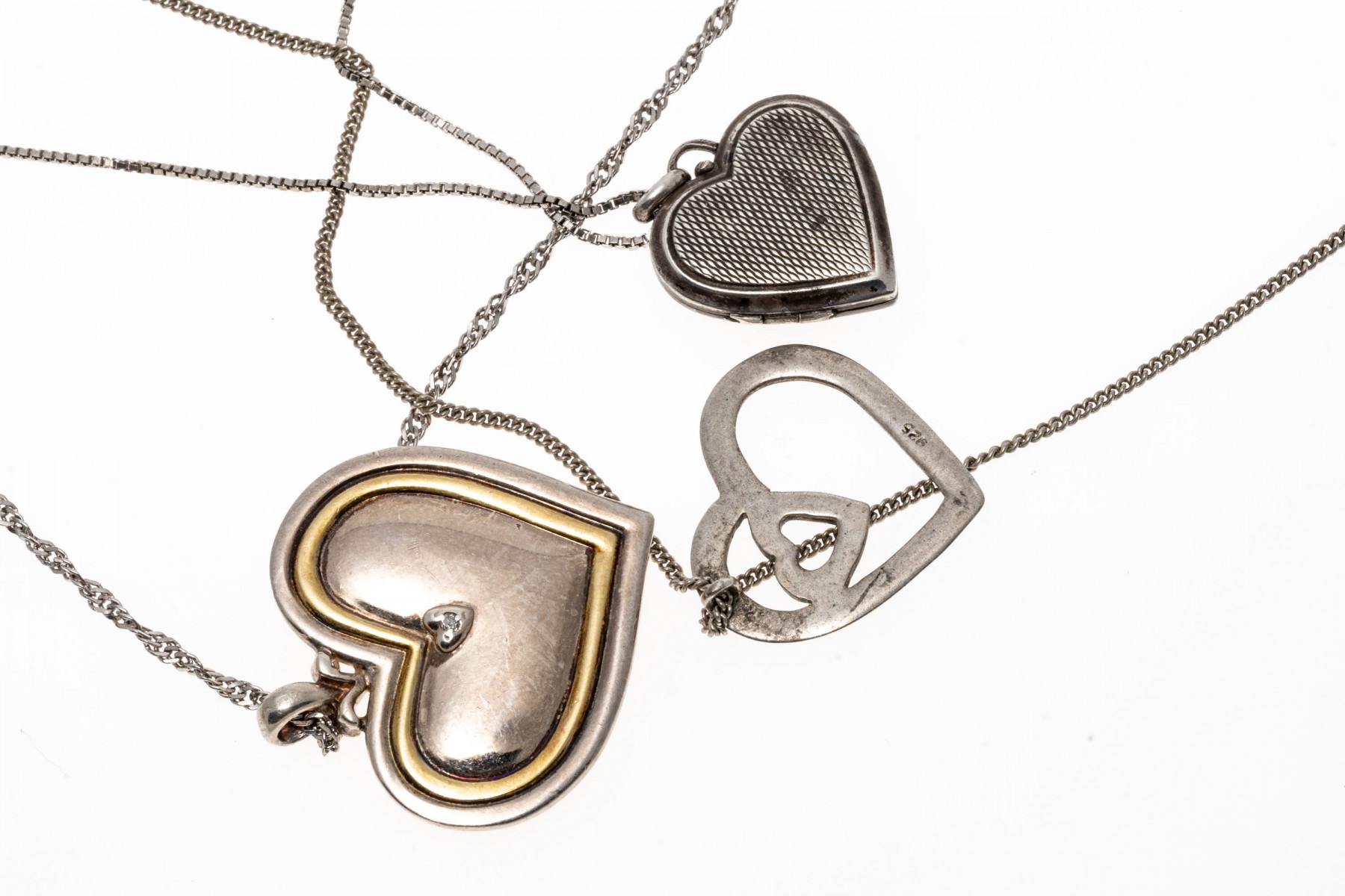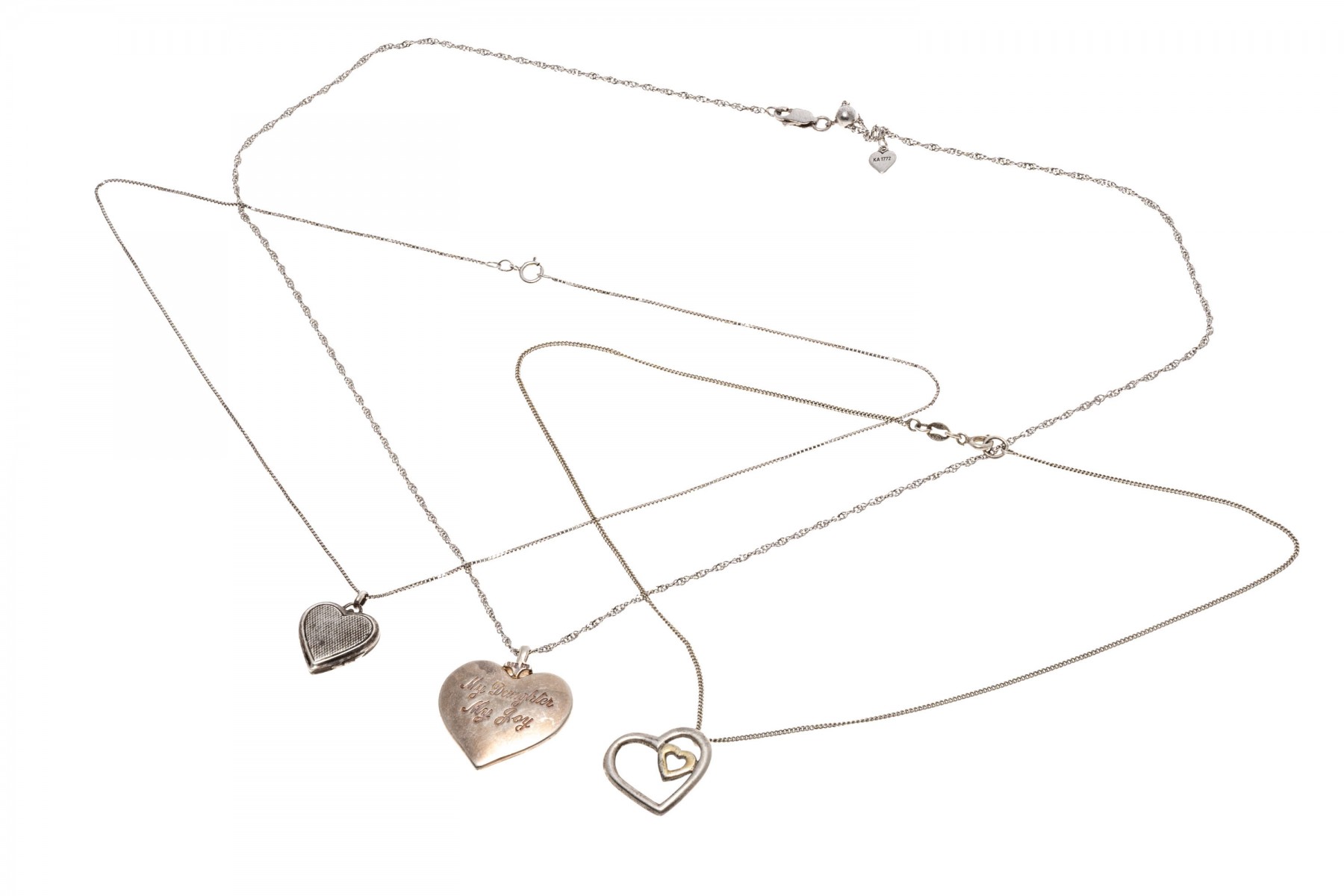 Three sterling silver heart pendant necklaces. The necklace feature a locket, an open design and one heart with engravings. Spring ring clasps.