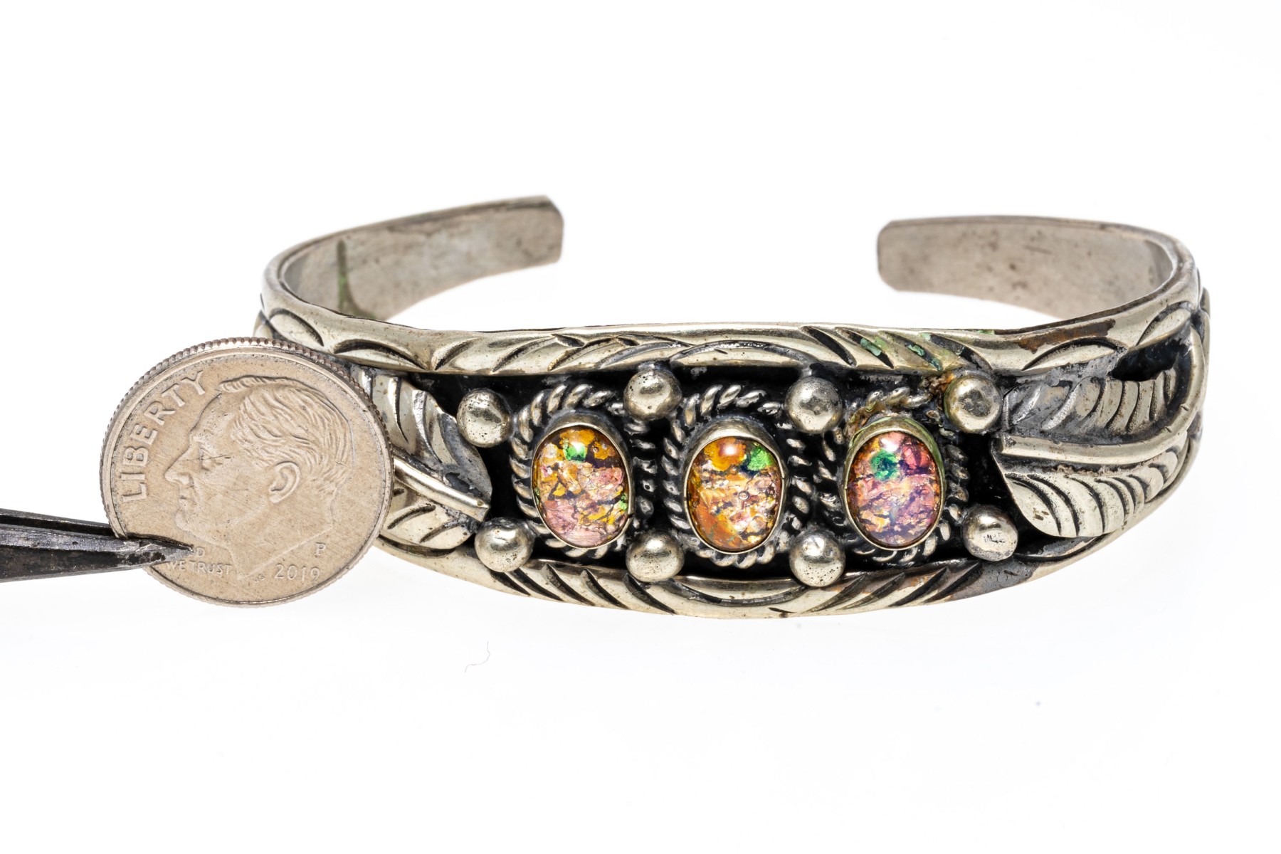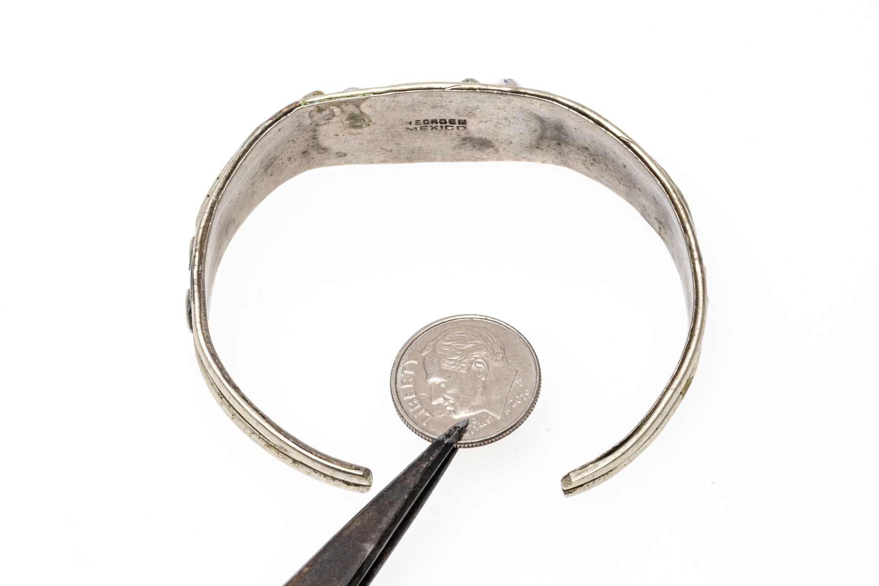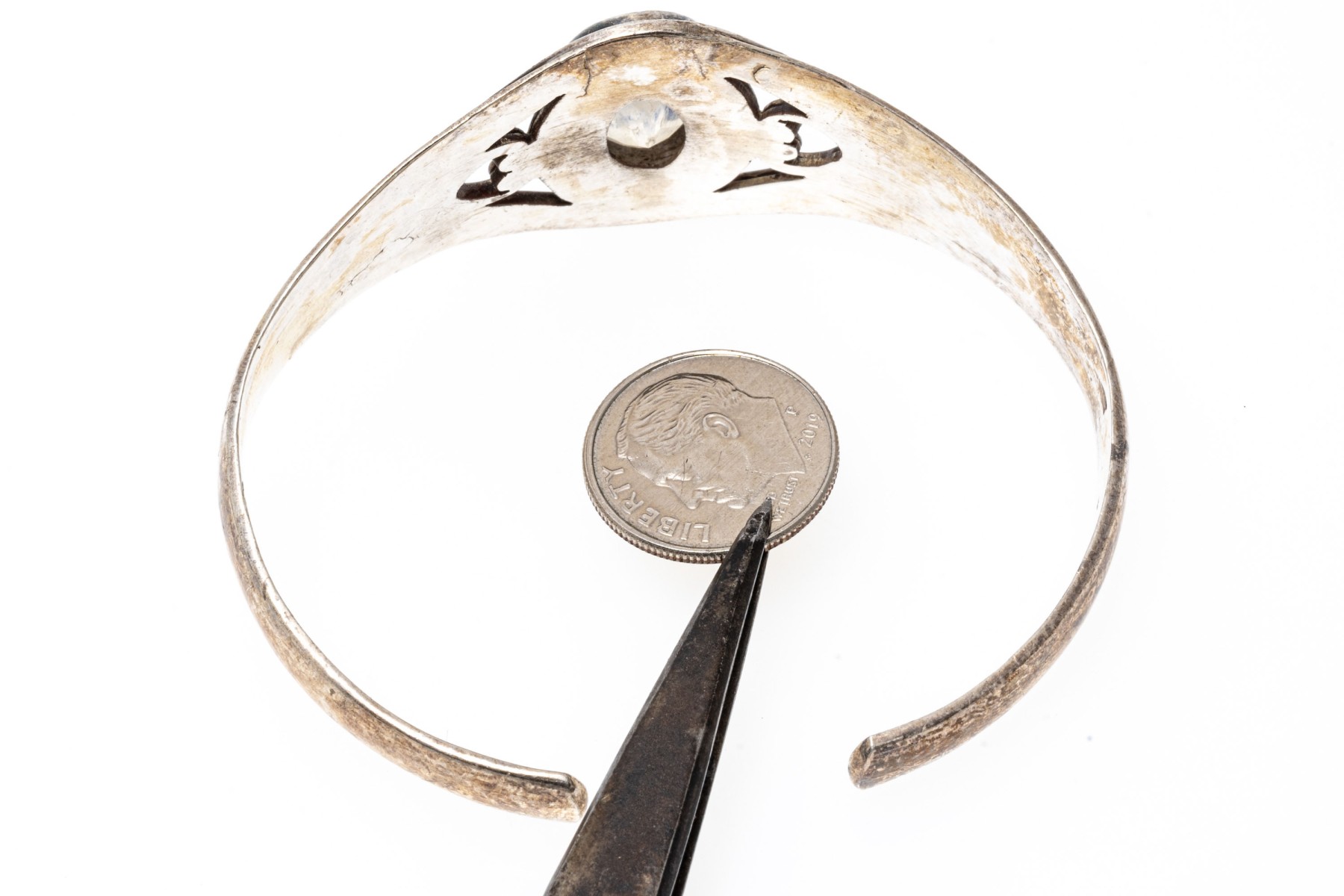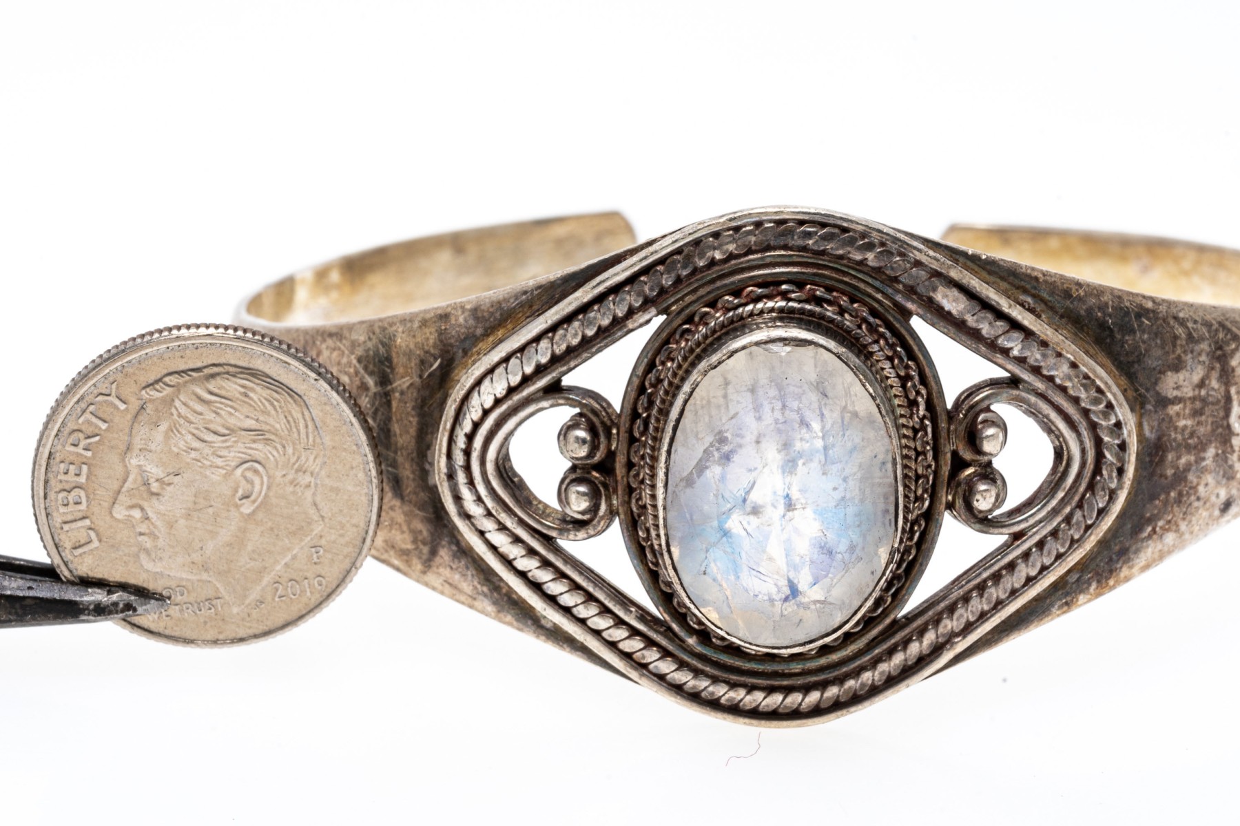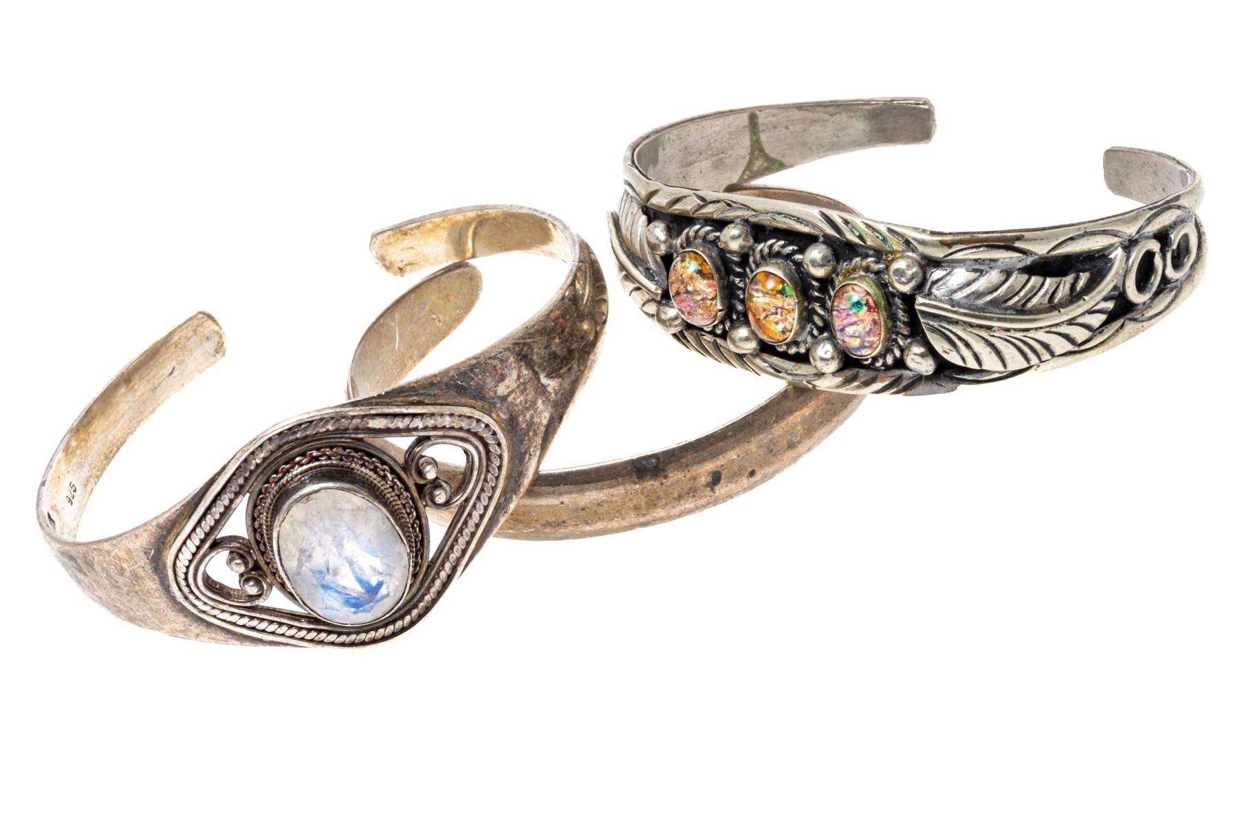 Three sterling silver cuff bracelets. One bracelet is set with a faceted moonstone, the second with simulate stones and the last with a simple band design.
