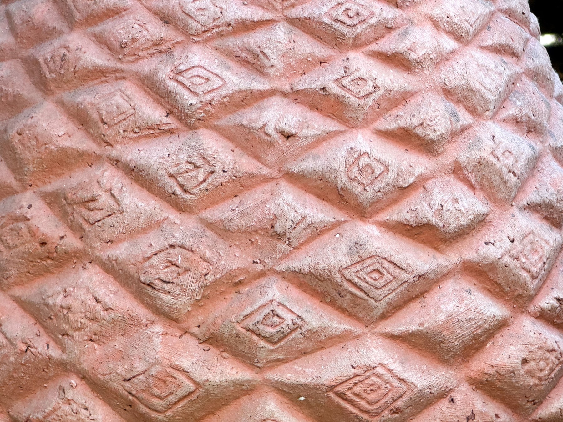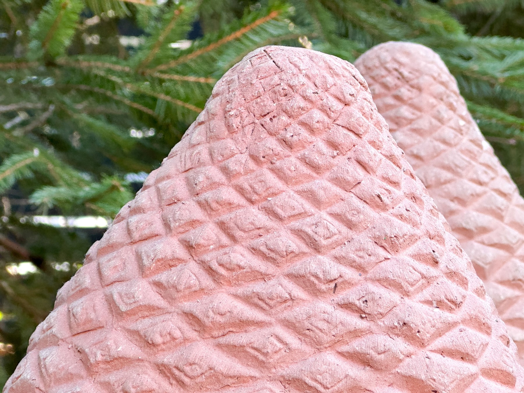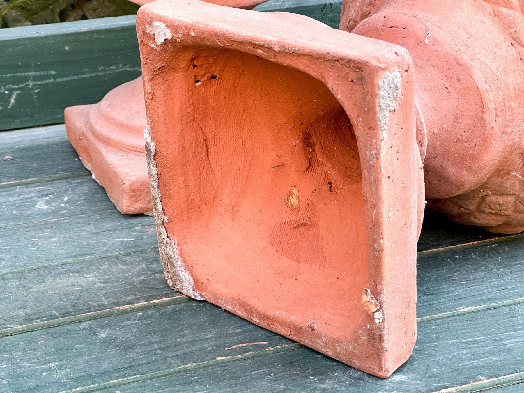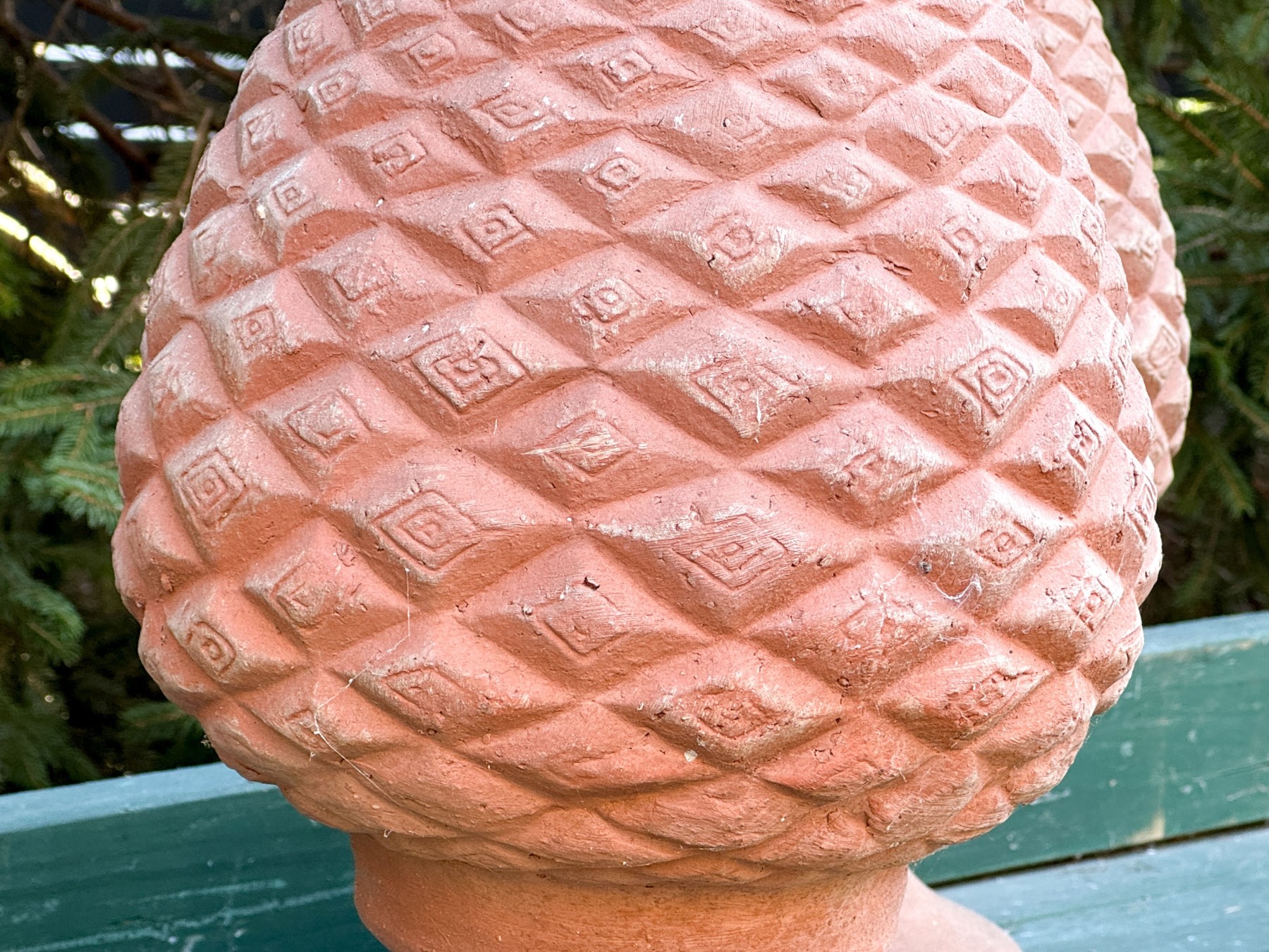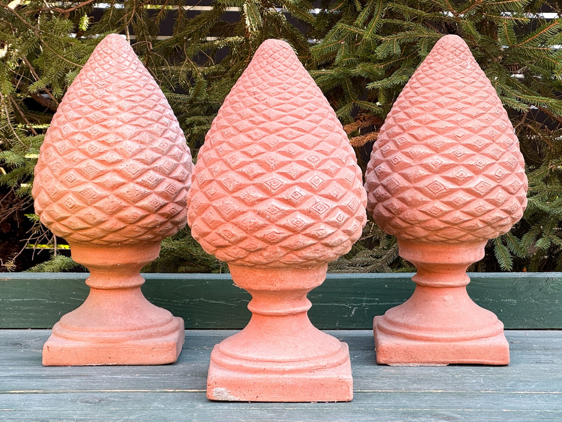 A fabulous trio of large terracotta pinecone form finials sporting square plinth style bases.