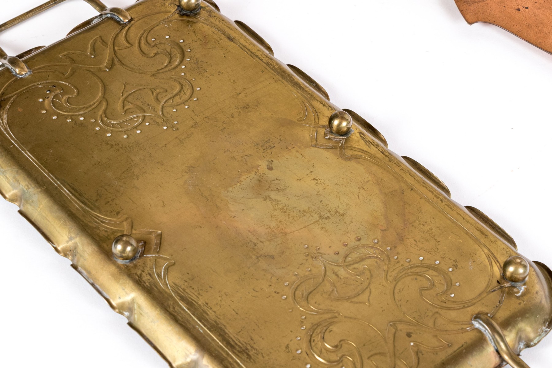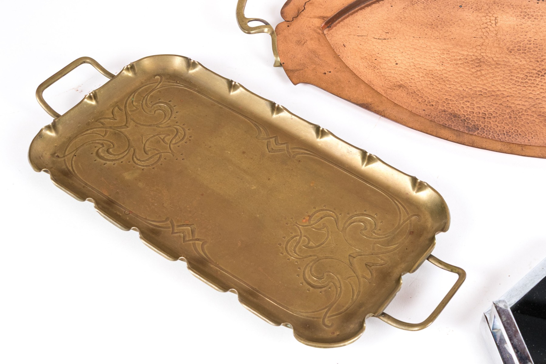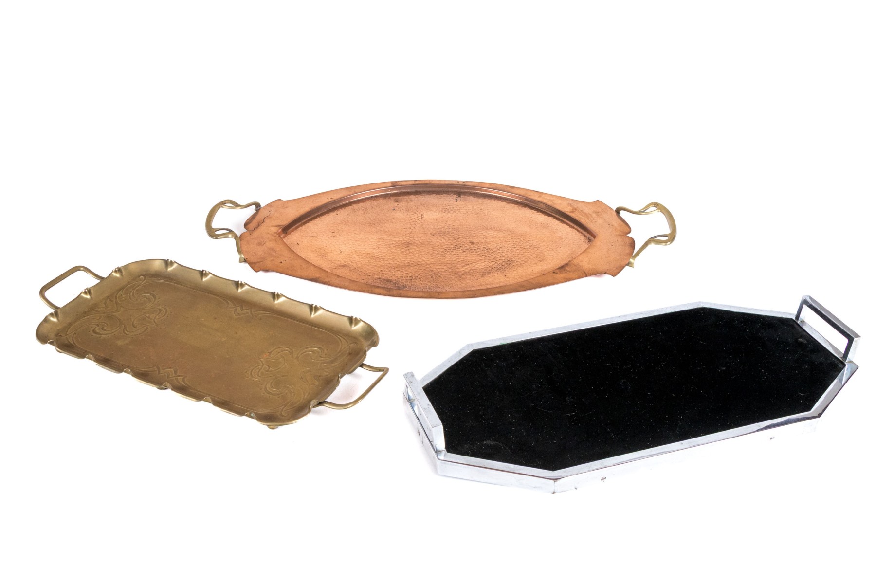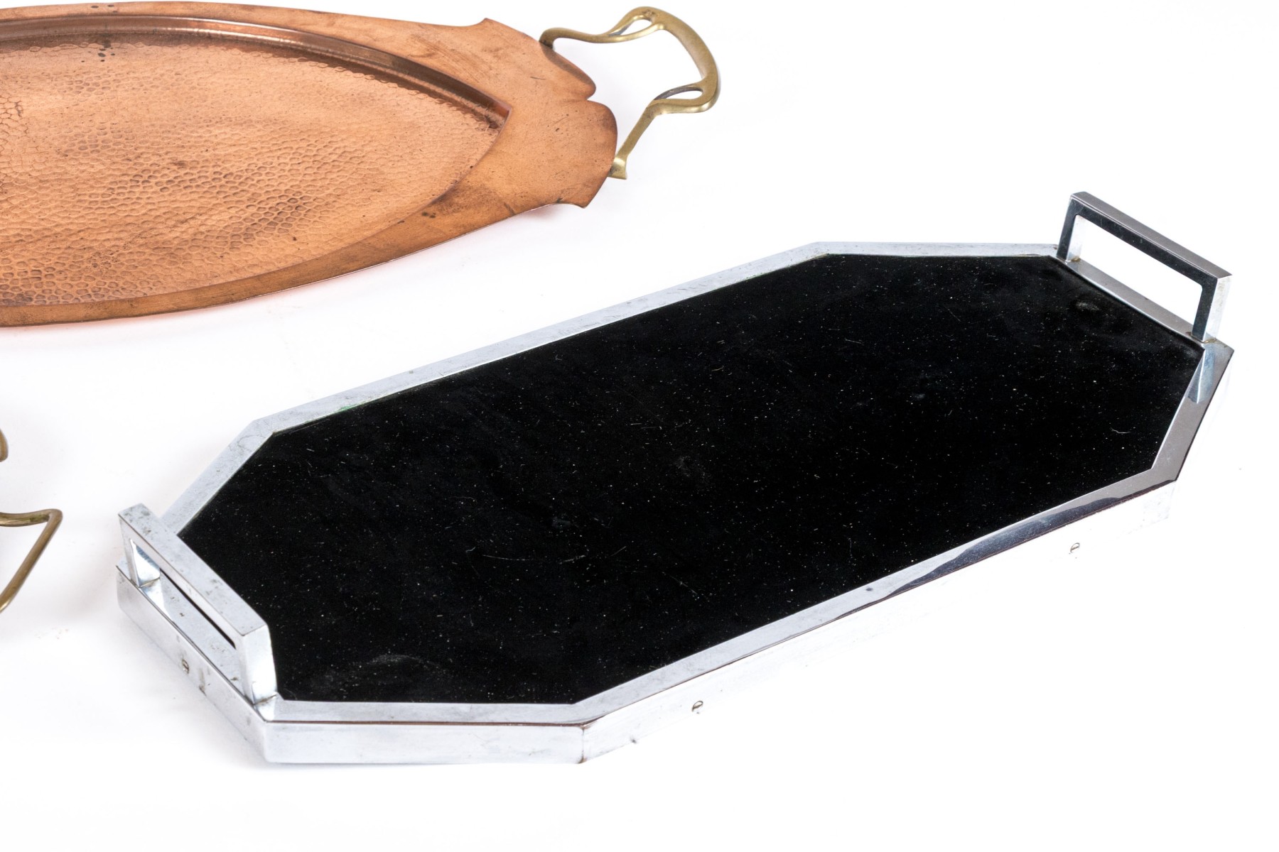 A fabulous trio of twin-handled serving trays. One copper with brass handles, one brass with scalloped border and one silver plate mounted cobalt glass hexagonal tray