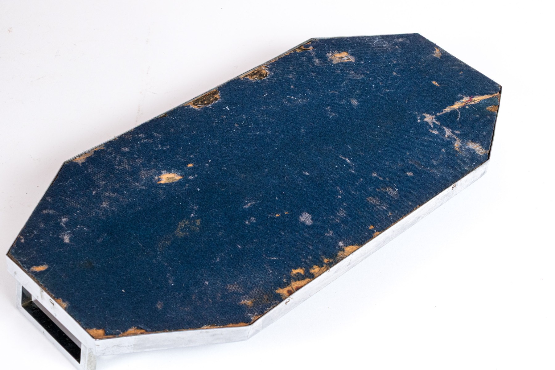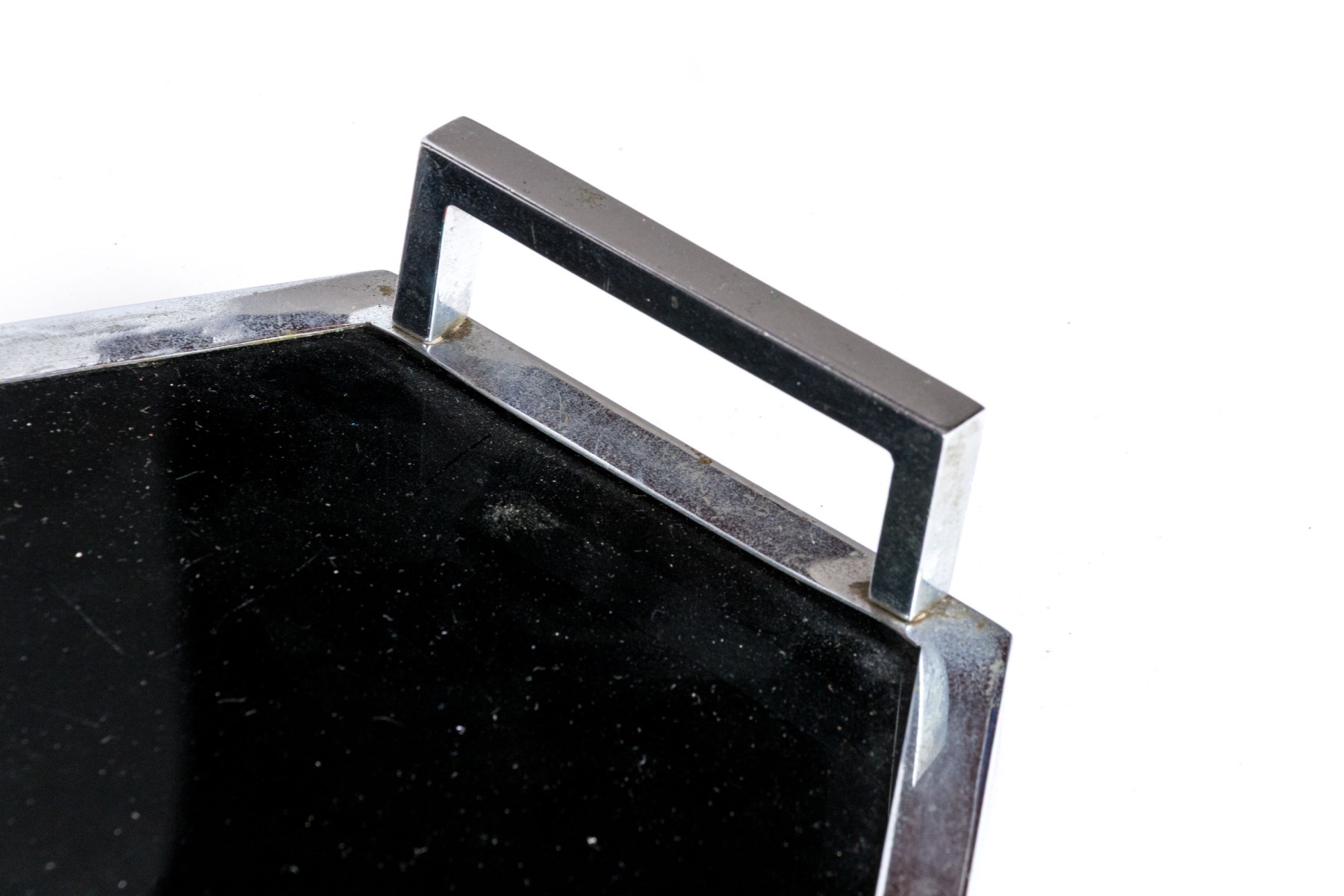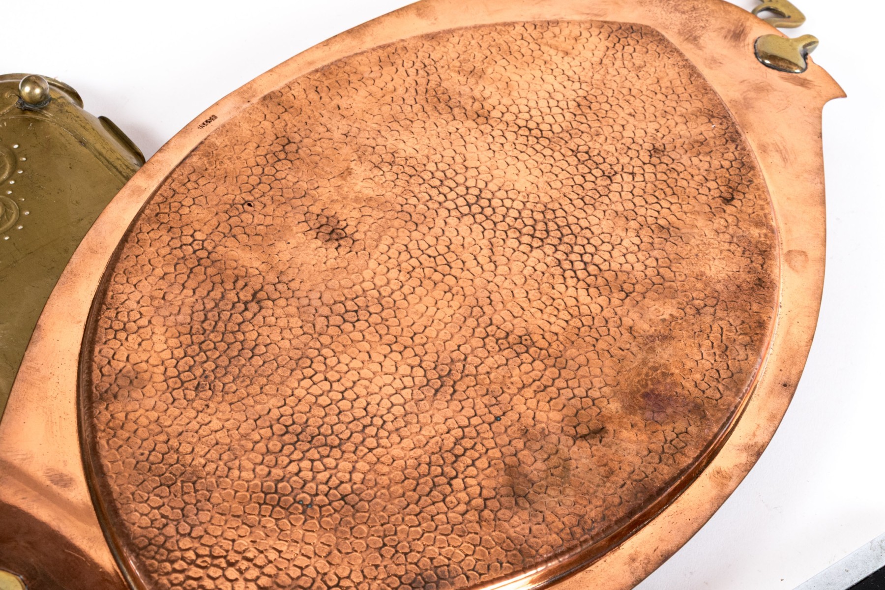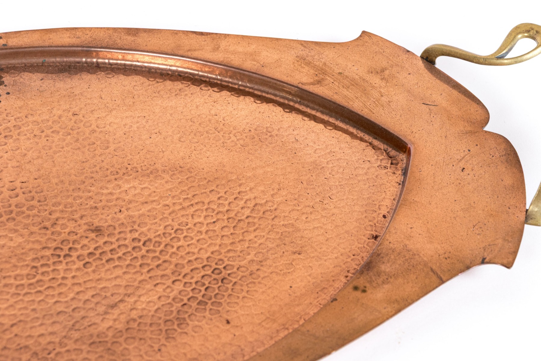 A fabulous trio of twin-handled serving trays. One copper with brass handles, one brass with scalloped border and one silver plate mounted cobalt glass hexagonal tray