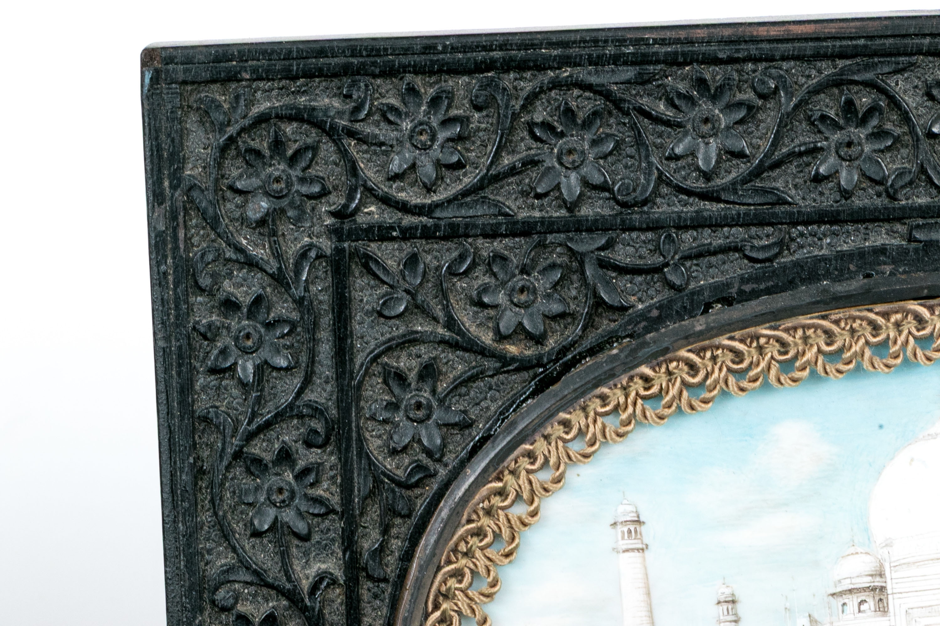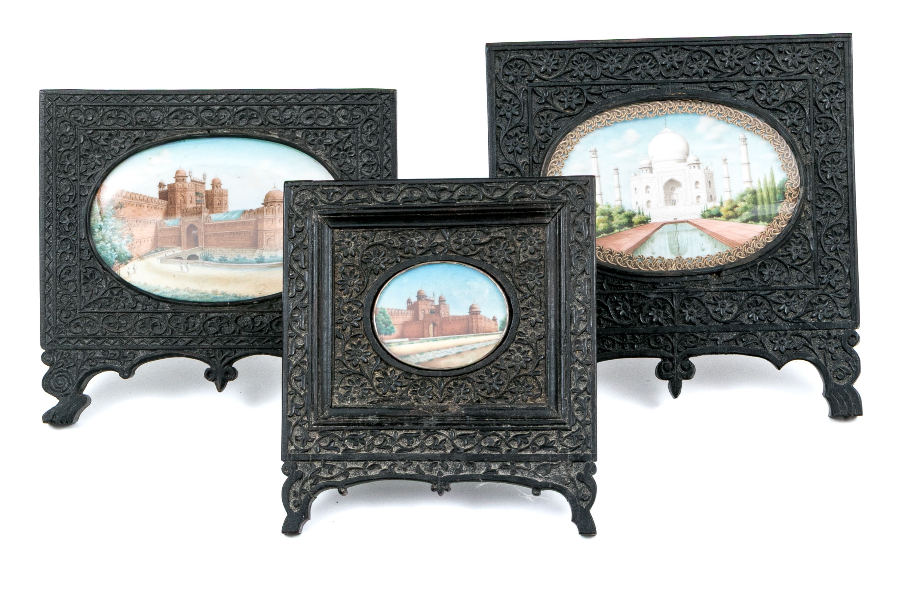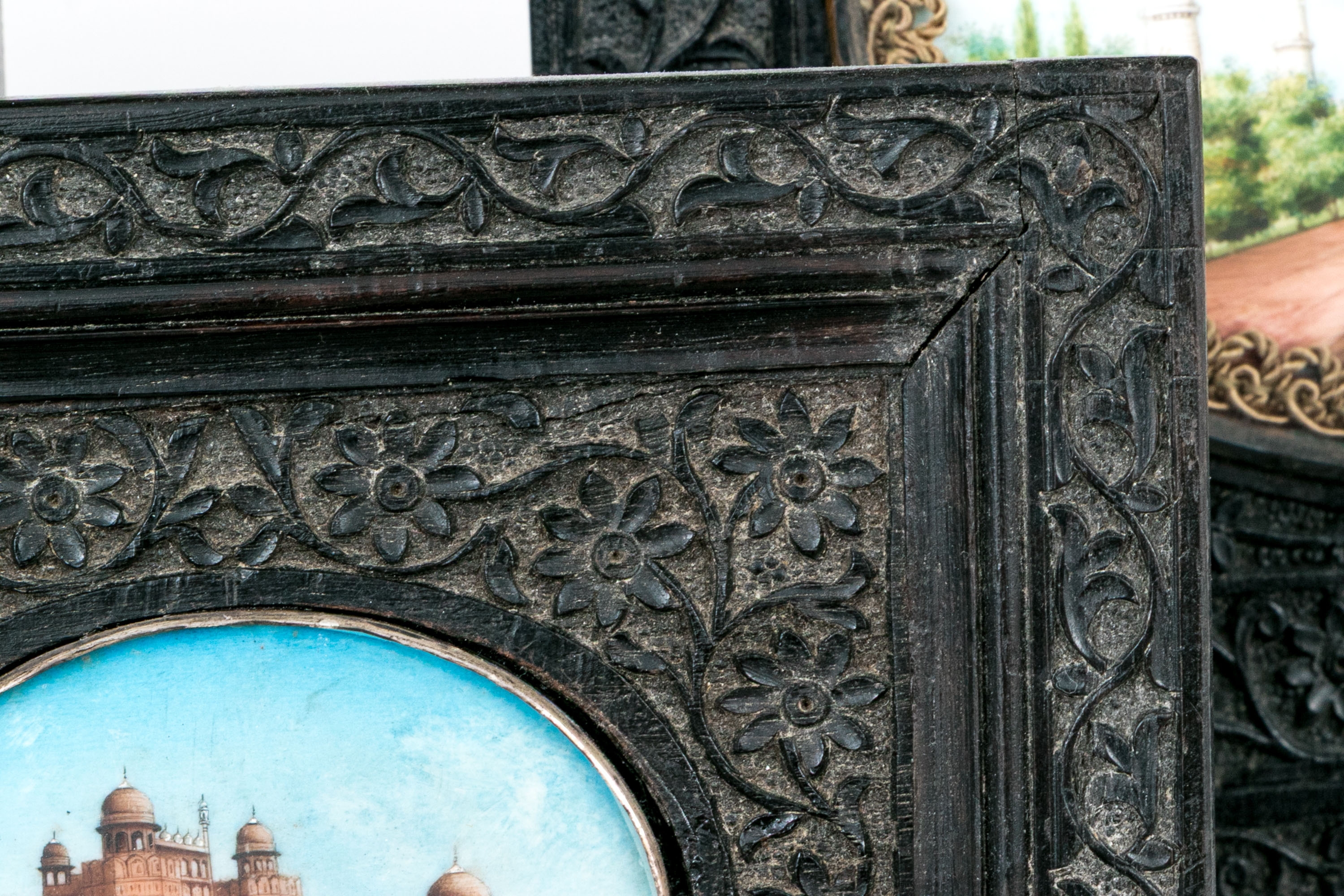 Easel backs with carved wooden frames on two front feet with easel backs. Frames have wonderful scrolling foliate motifs in relief with oval hand-painted porcelain plaques to center.