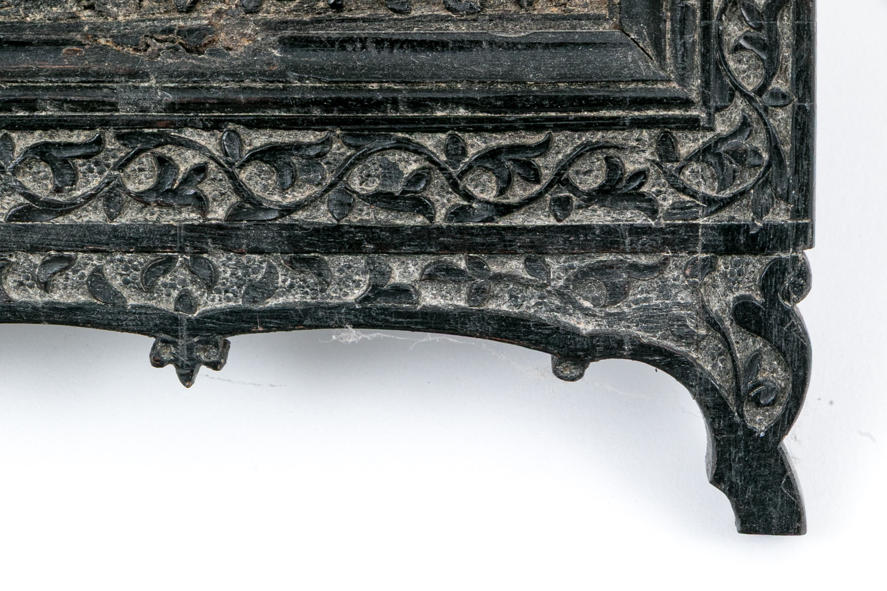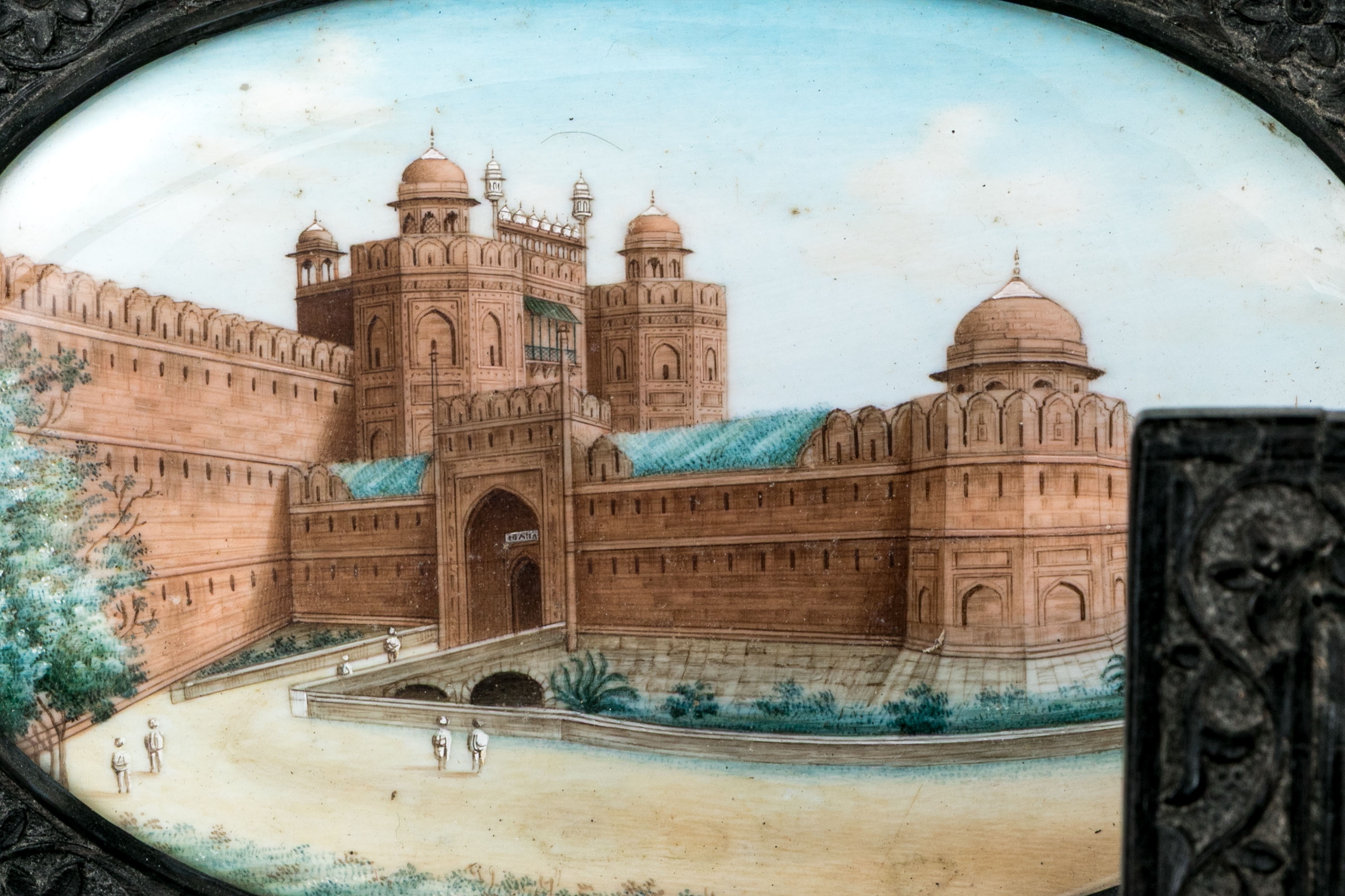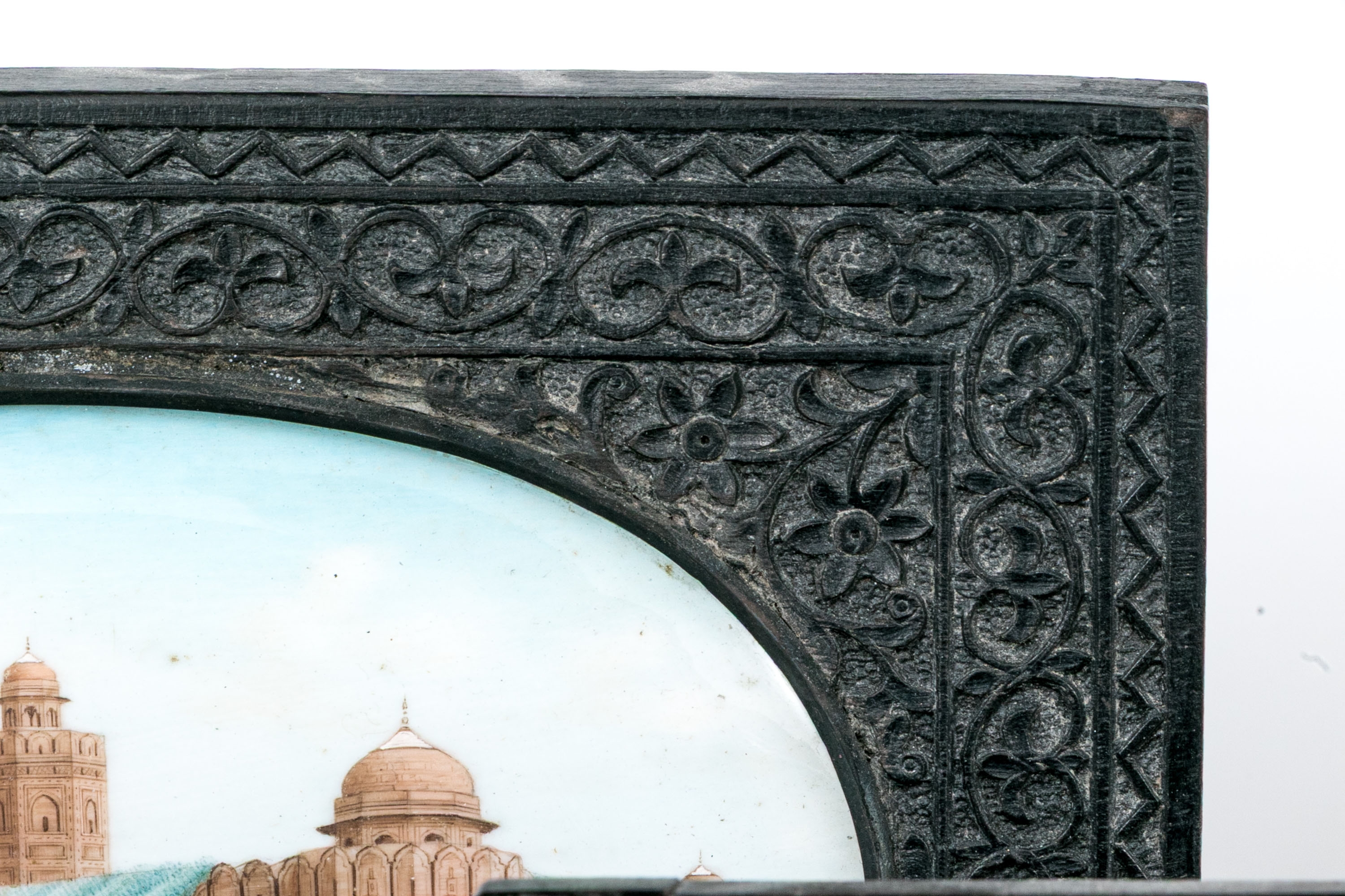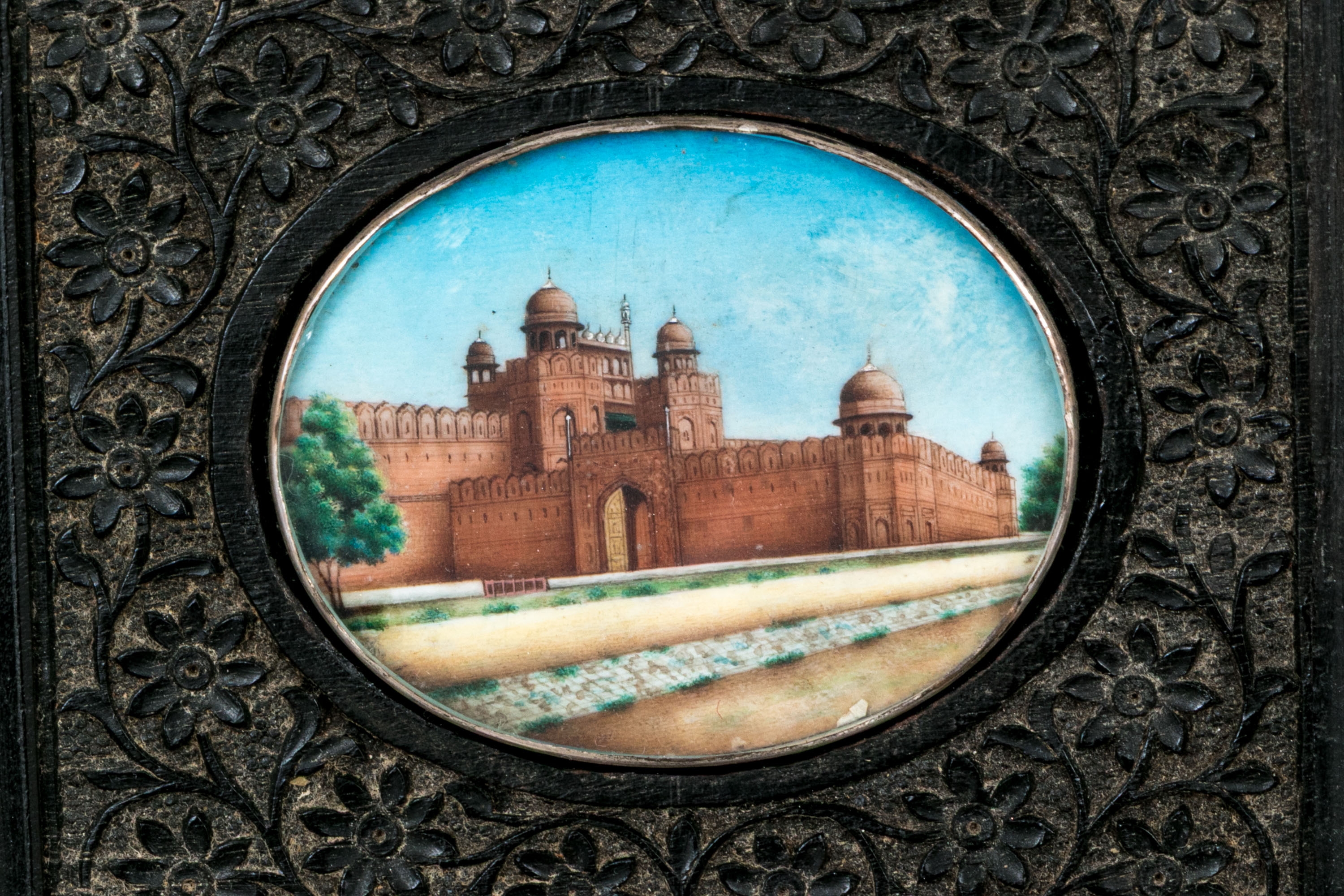Easel backs with carved wooden frames on two front feet with easel backs. Frames have wonderful scrolling foliate motifs in relief with oval hand-painted porcelain plaques to center.