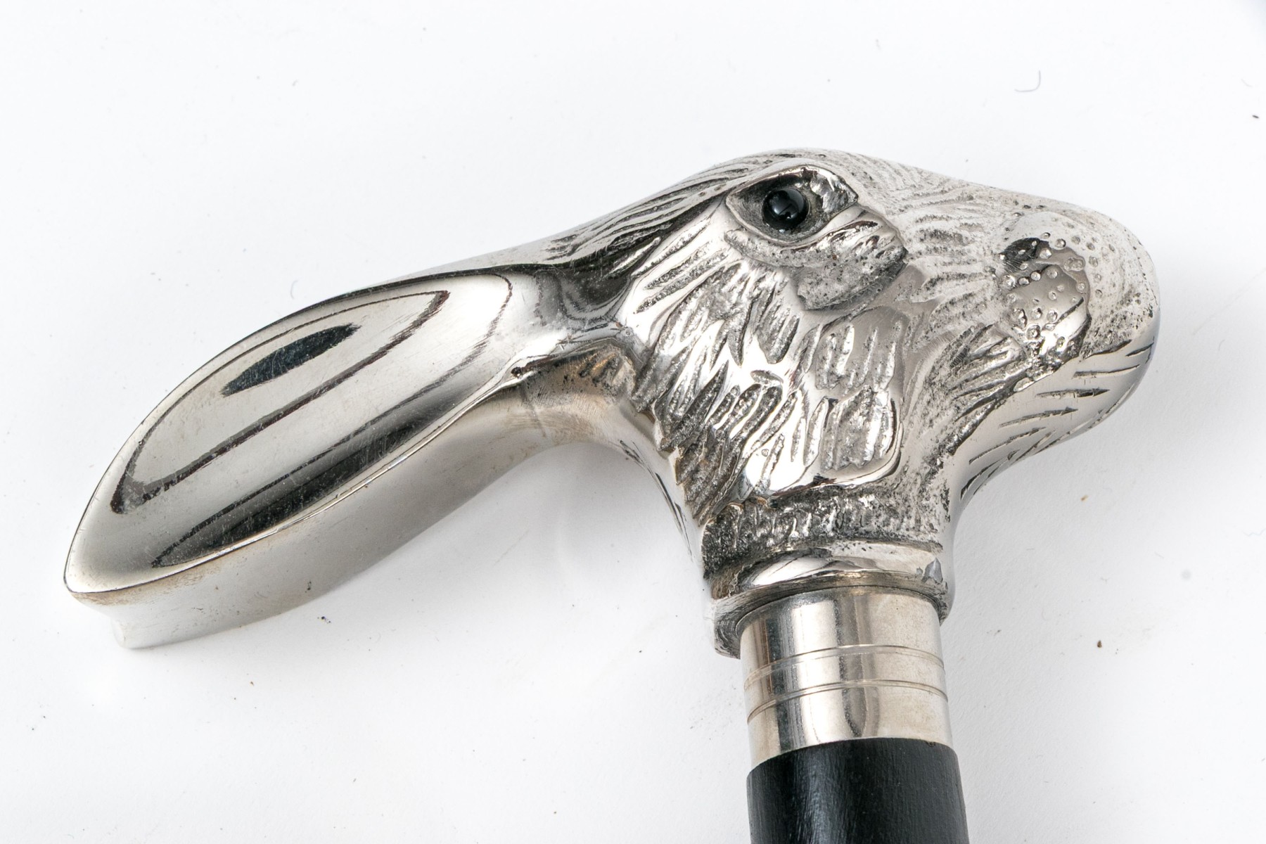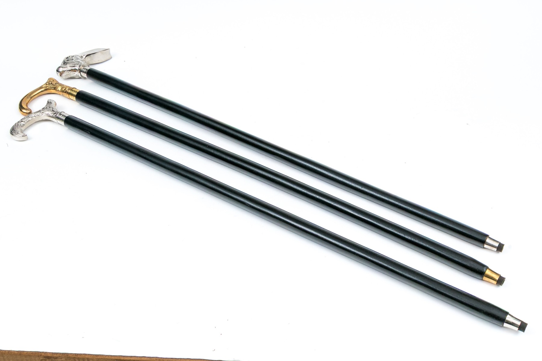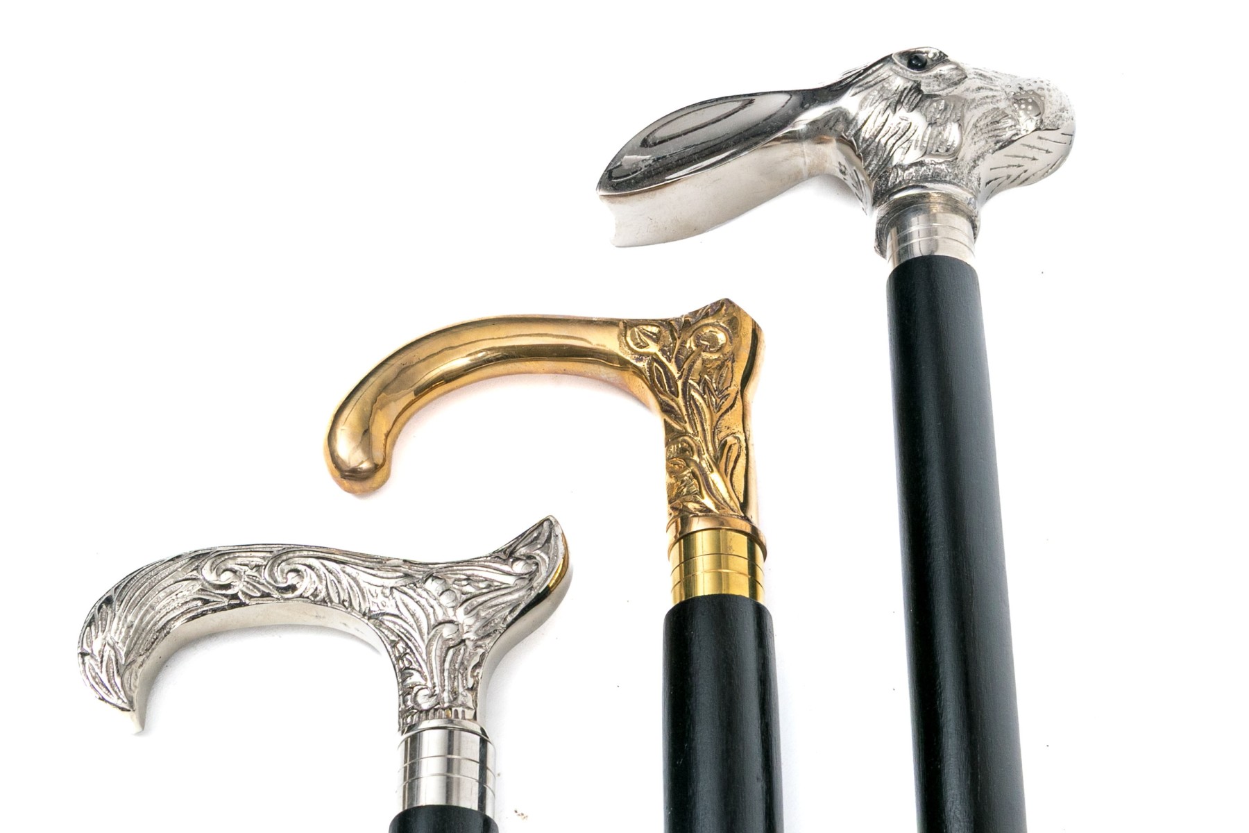 A fine collection of three black finished canes, one with a brass finished handle. One cane features an eye-catching rabbit head handle having inlaid eyes.