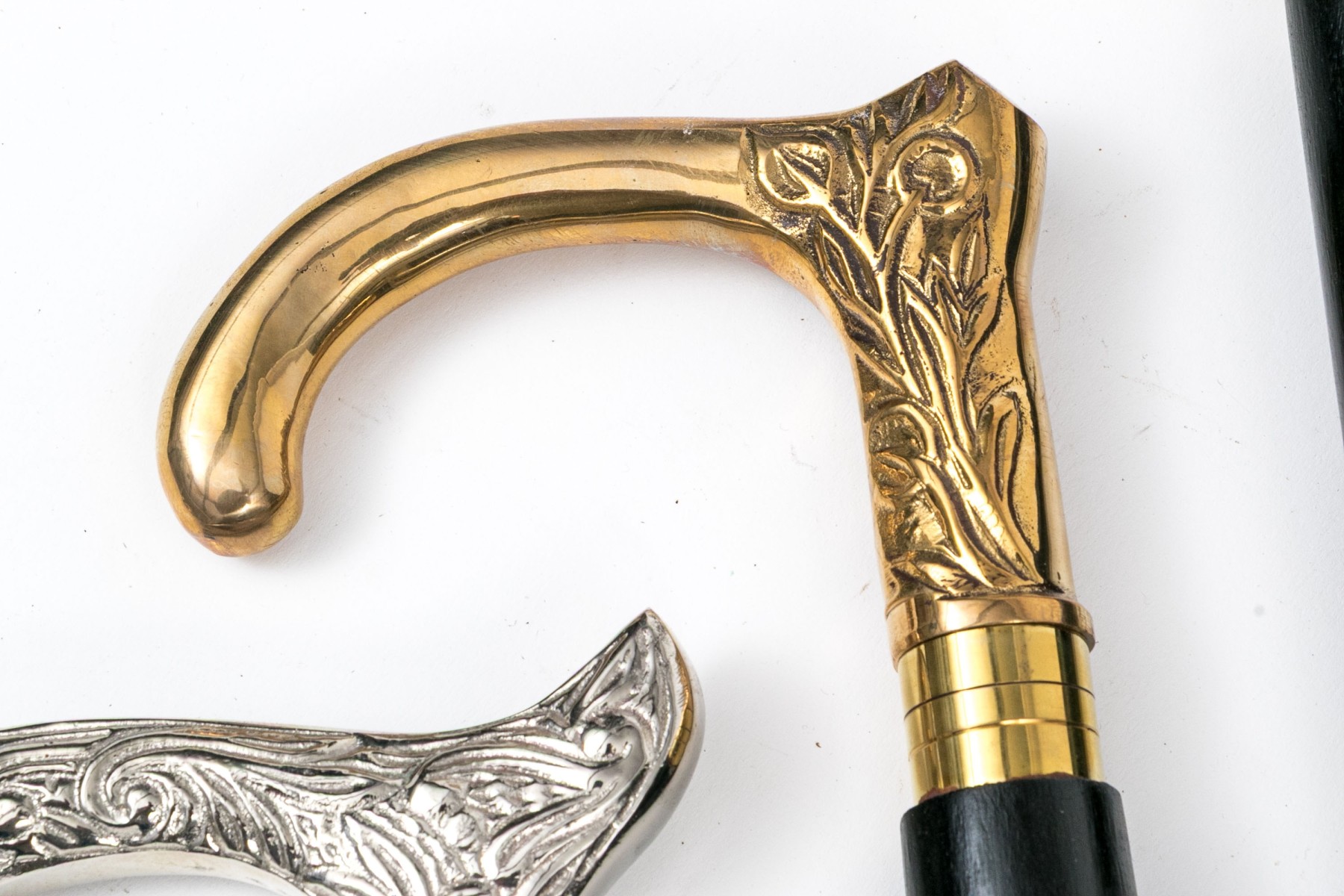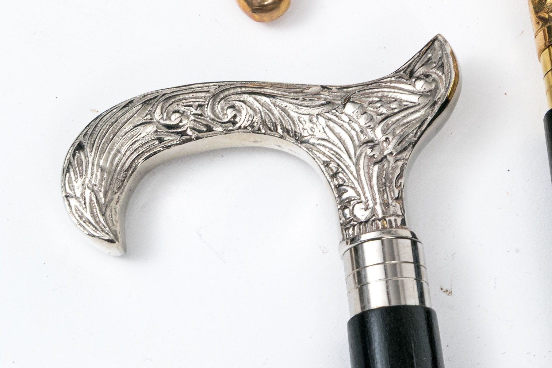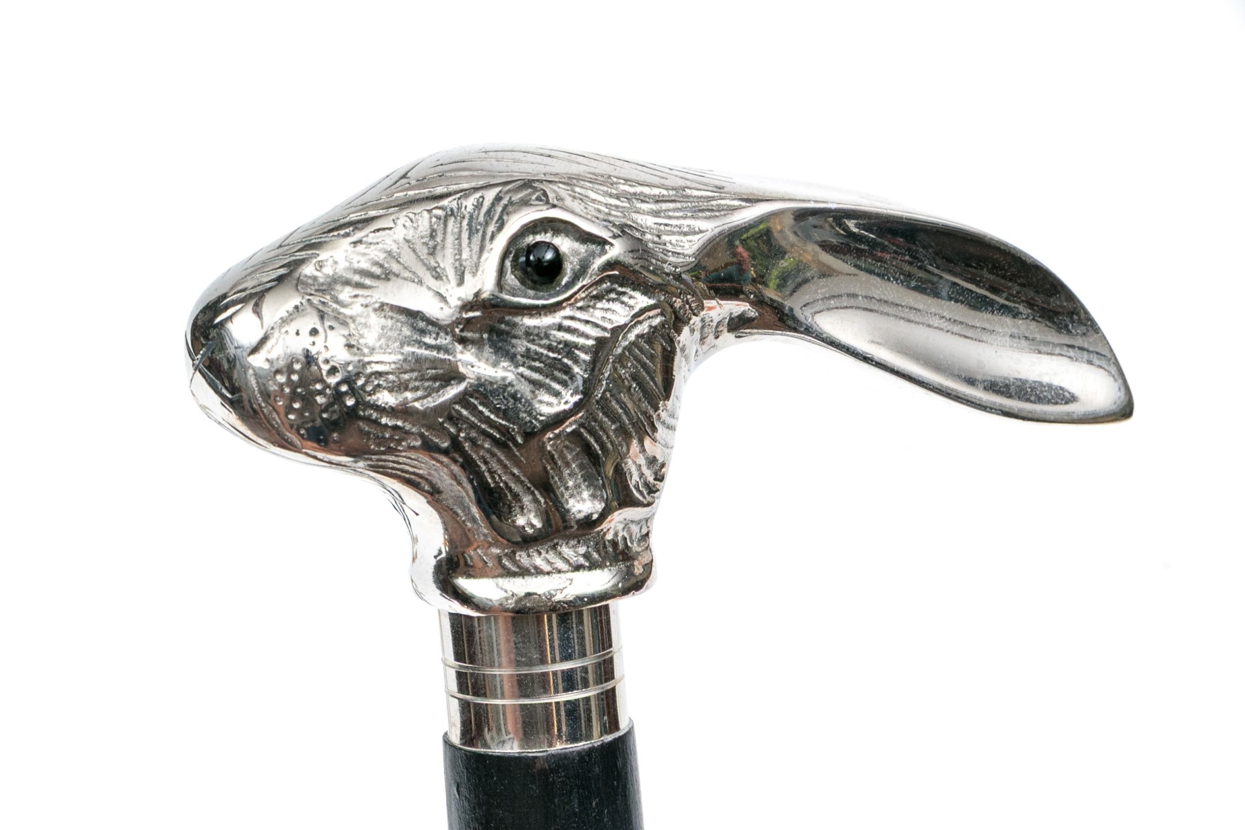 A fine collection of three black finished canes, one with a brass finished handle. One cane features an eye-catching rabbit head handle having inlaid eyes.
