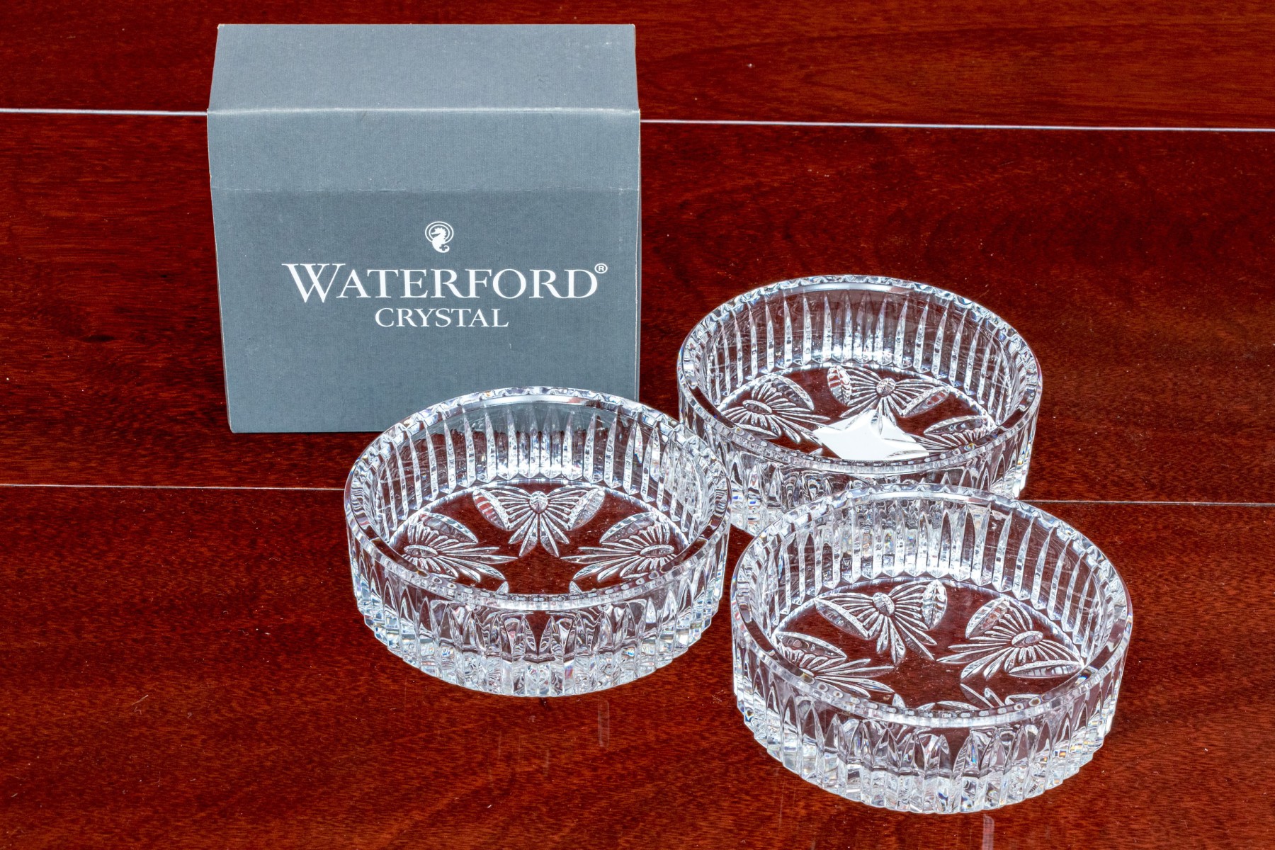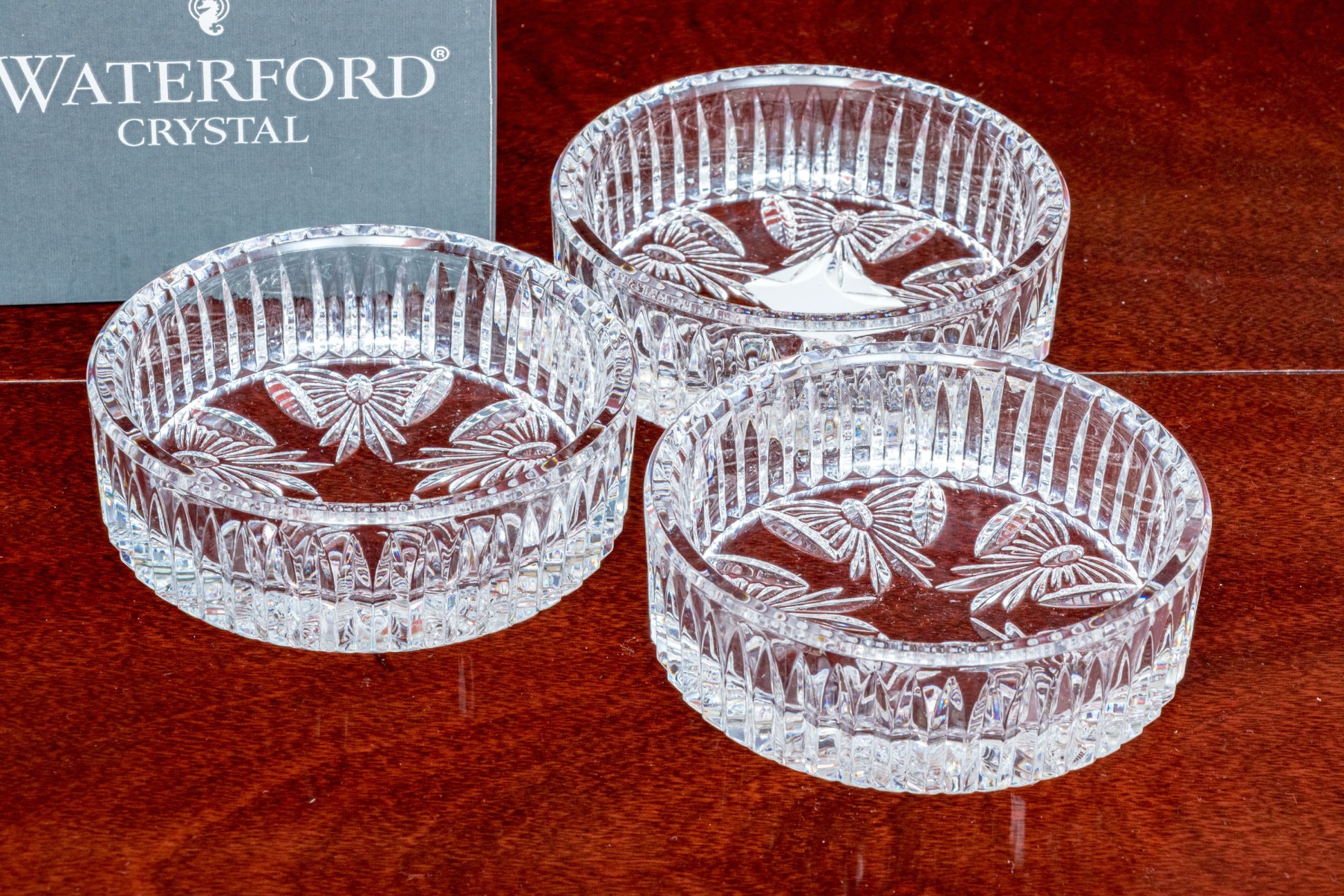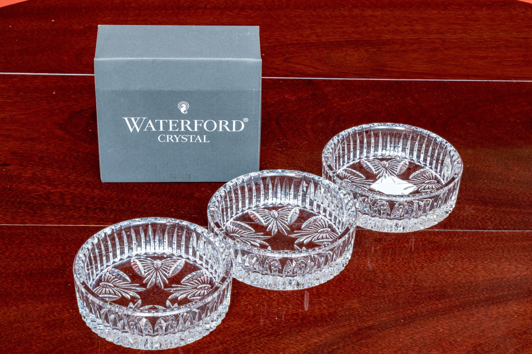 Attractive trio of Waterford cut crystal bottle coasters, each marked with makers label, one in box.