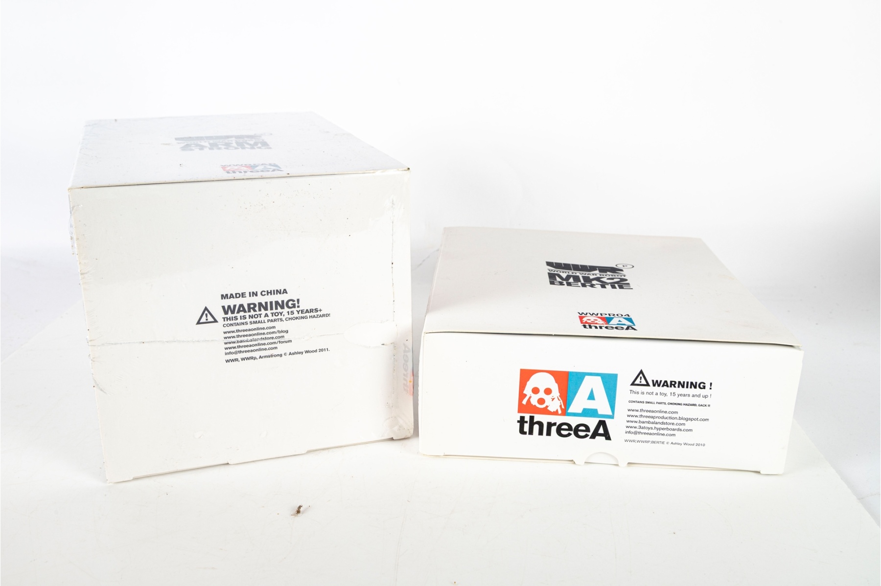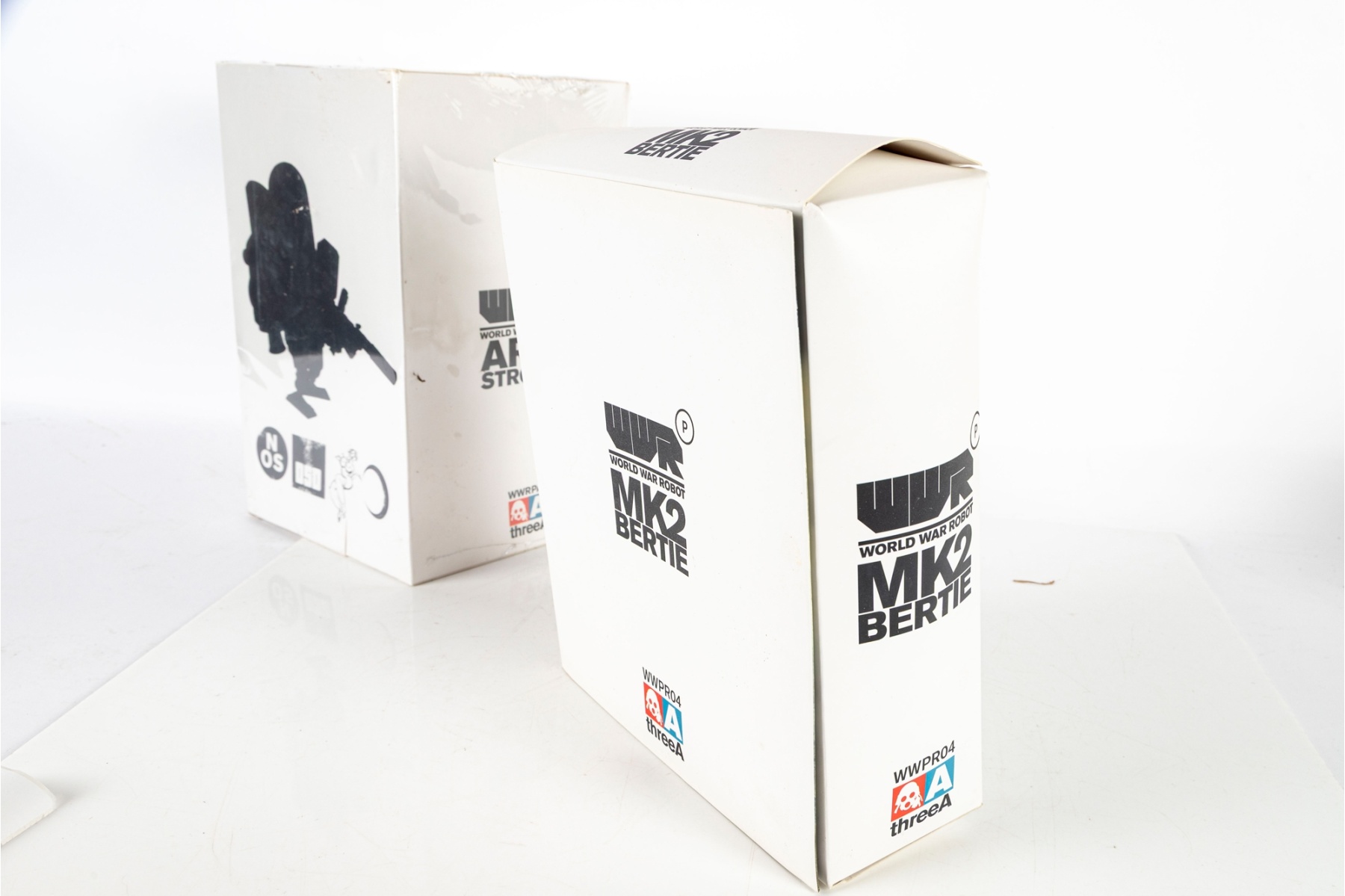 Pair of collectible World War Robot figures designed by renowned artist Ashley Wood and produced by ThreeA (3A). Each features incredible detailing, weathered paintwork, and high-quality craftsmanship that embodies the gritty, industrial aesthetic of the WWR universe.