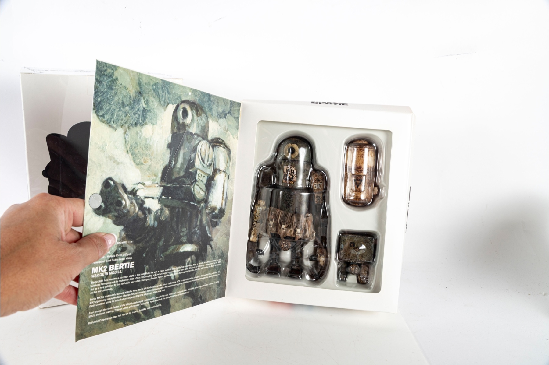 figures appear unused and one factory packaged. boxes show minor to moderate wear, dents, and edge marks from storage and handling. MK2 Bertie box opens to reveal inner display and artwork—contents remain intact and well-preserved.