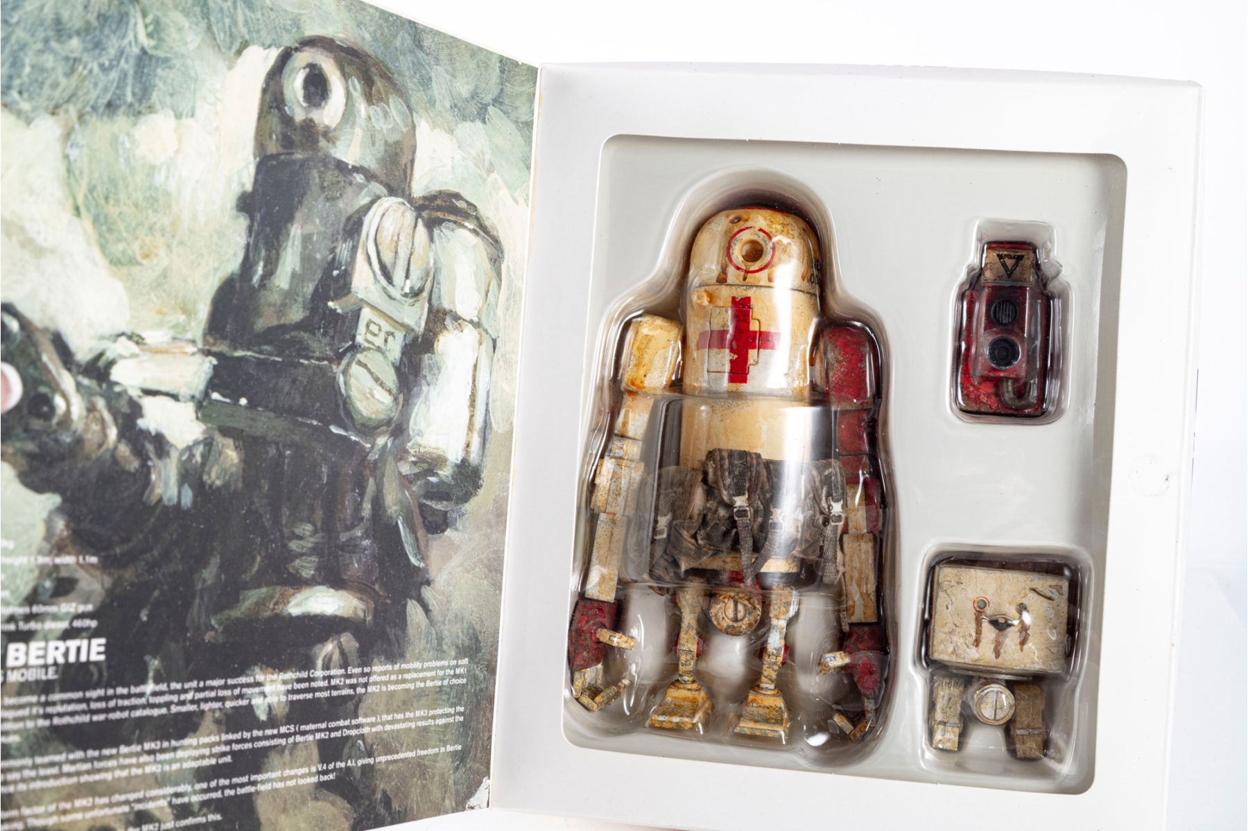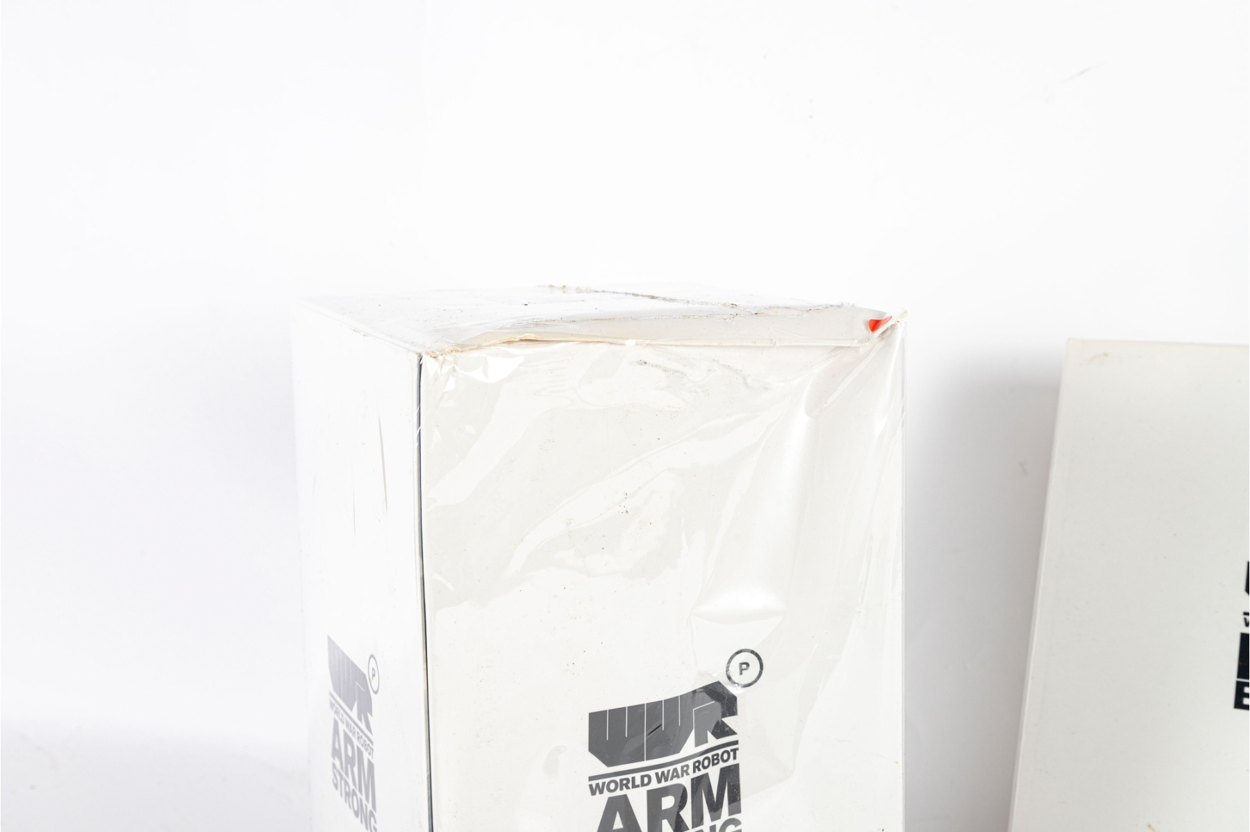 Pair of collectible World War Robot (WWR) figures designed by acclaimed artist Ashley Wood and produced by ThreeA (3A). These highly detailed, weathered-style robots feature exceptional craftsmanship and are part of the iconic World War Robot series, celebrated for its gritty realism and mechanical design.