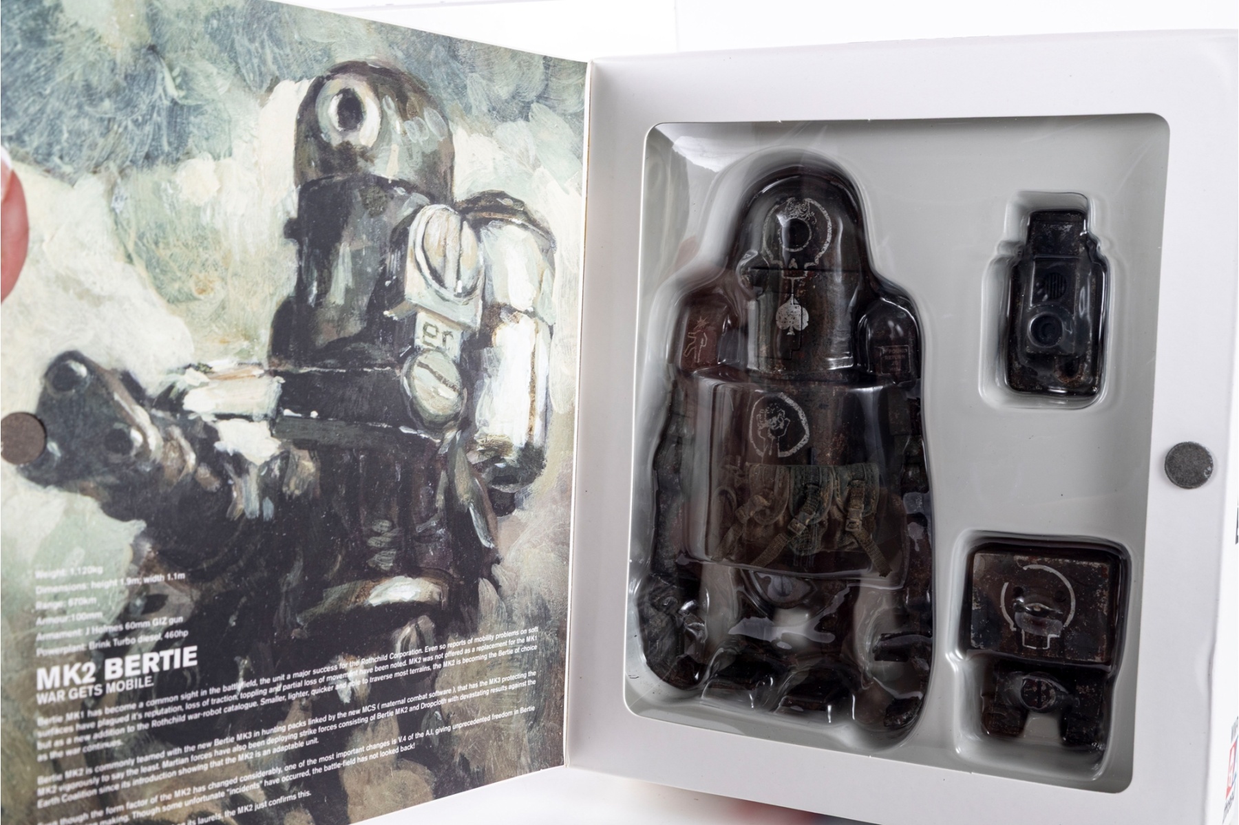 both figures appear unused and remain in original packaging. MK2 Bertie displays factory-sealed contents with accessories intact. Armstrong box is factory wrapped, showing surface wear and edge marks from storage.