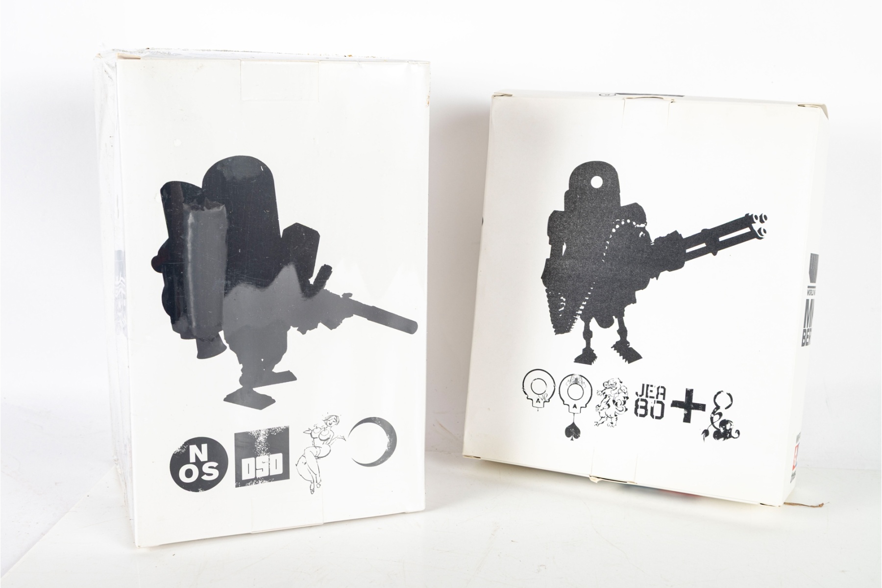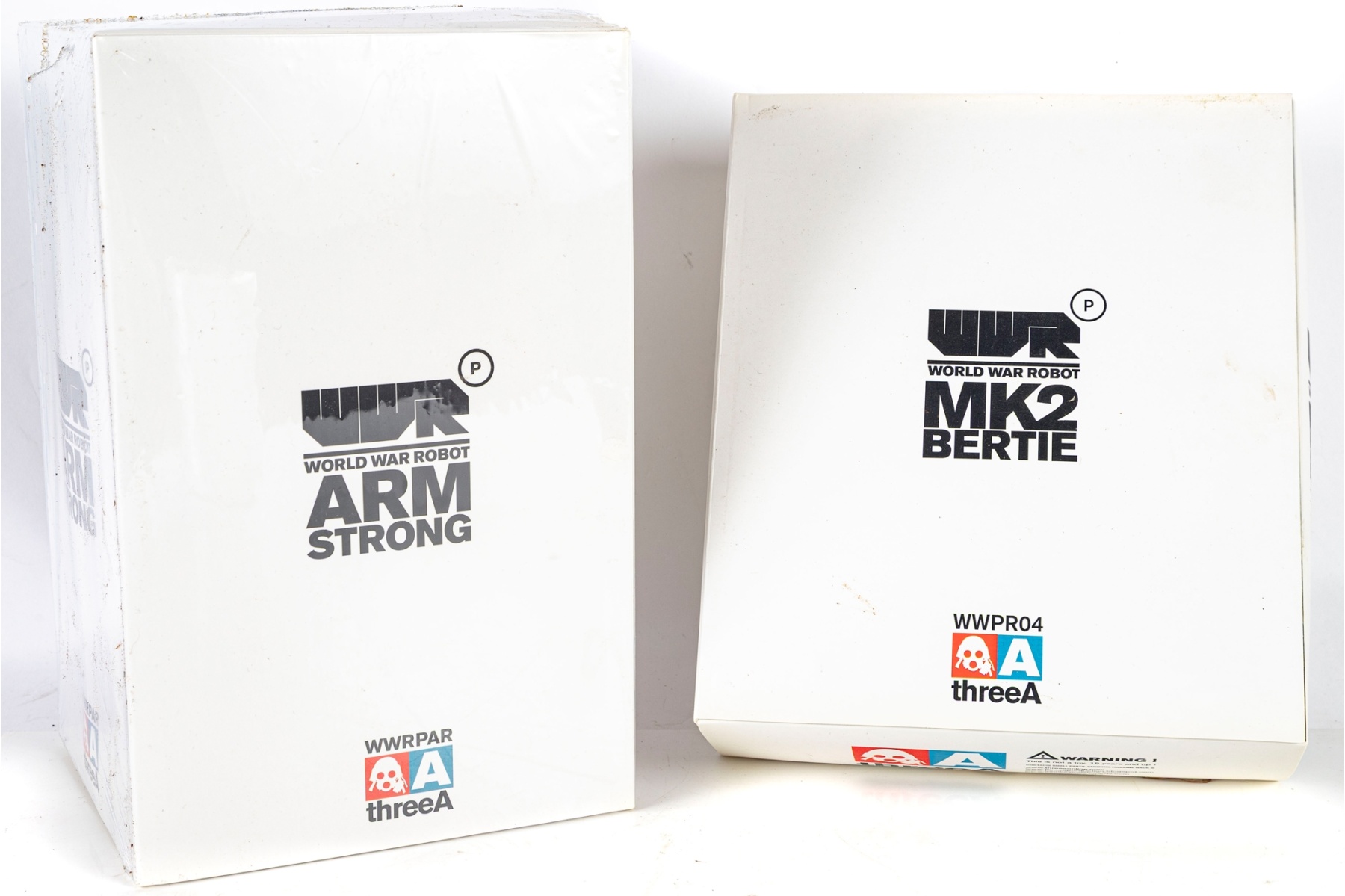 Pair of collectible World War Robot (WWR) figures designed by acclaimed artist Ashley Wood and produced by ThreeA (3A). These highly detailed, weathered-style robots feature exceptional craftsmanship and are part of the iconic World War Robot series, celebrated for its gritty realism and mechanical design.