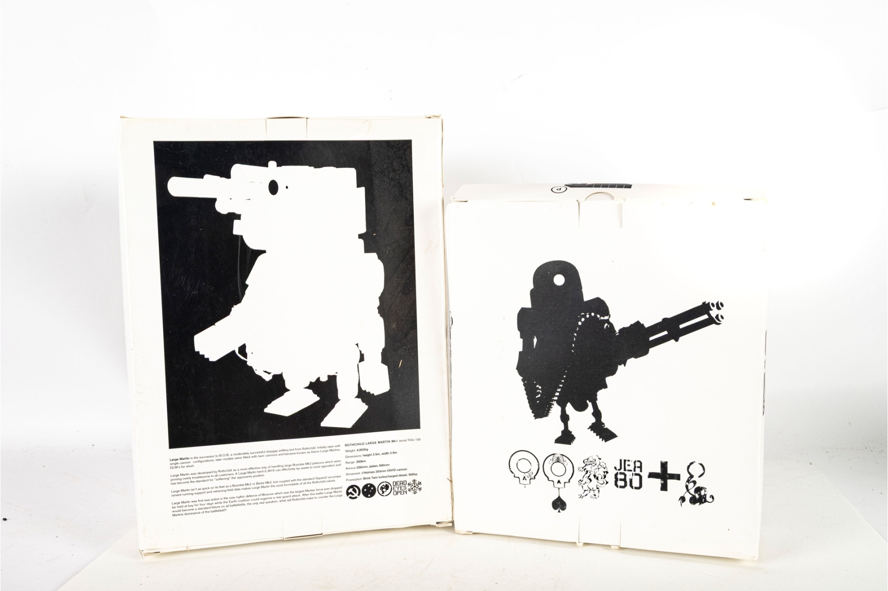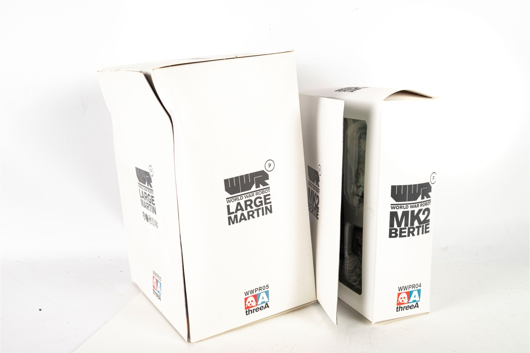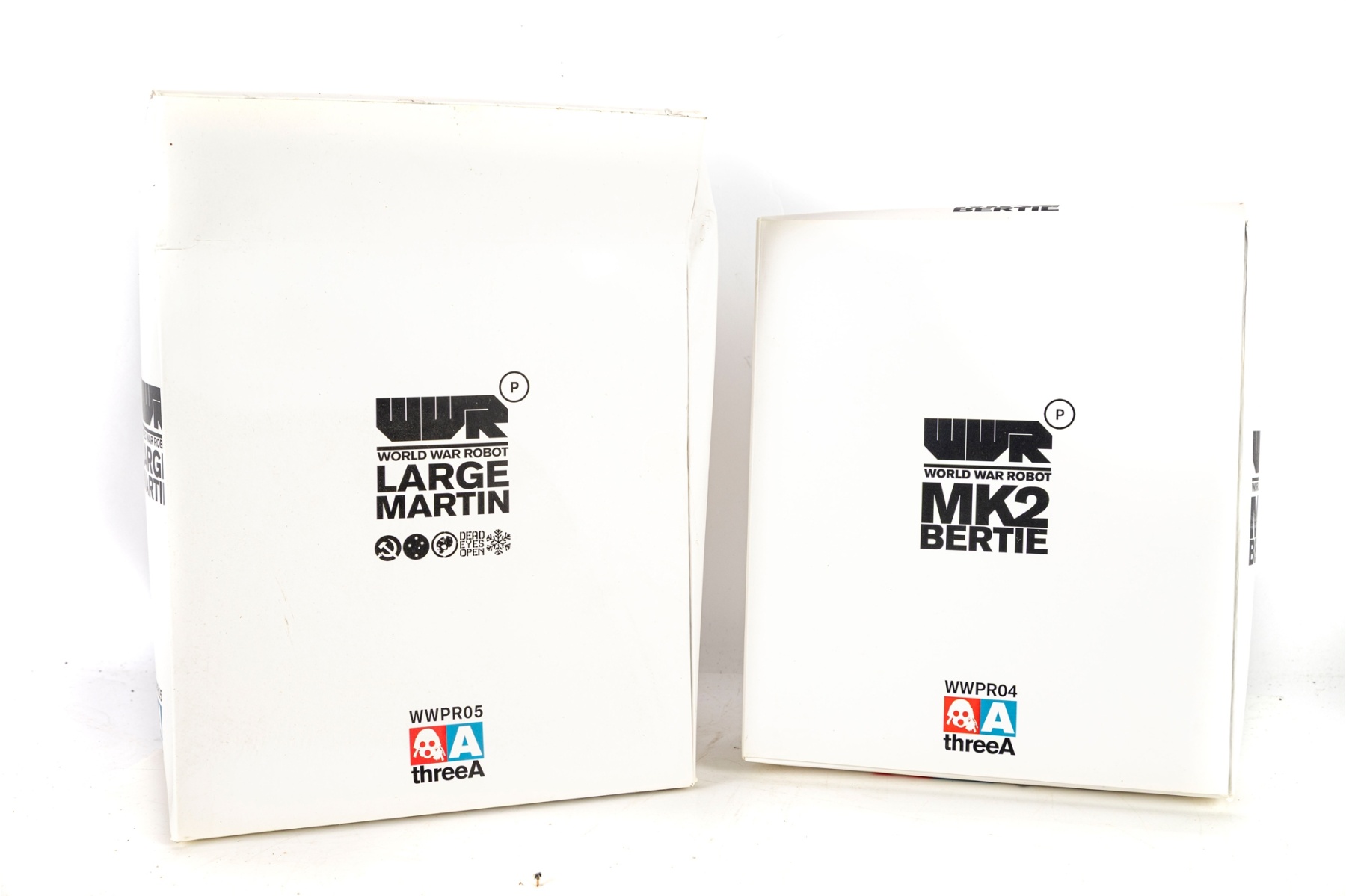 A pair of collectible World War Robot (WWR) figures designed by acclaimed artist Ashley Wood and produced by ThreeA (3A). This lot includes both MK2 Bertie and Large Martin, two of the most recognizable mecha units from Wood’s acclaimed dystopian sci-fi universe.