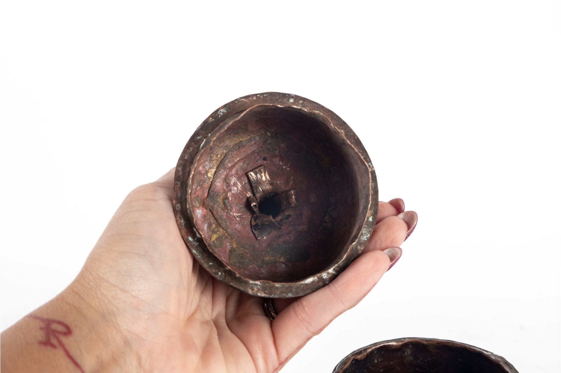Handcrafted vintage Tibetan pot made of copper, traditionally used for storing yak butter. Features a rounded form with aged patina, reflecting the cultural heritage through crudely hammered tails.