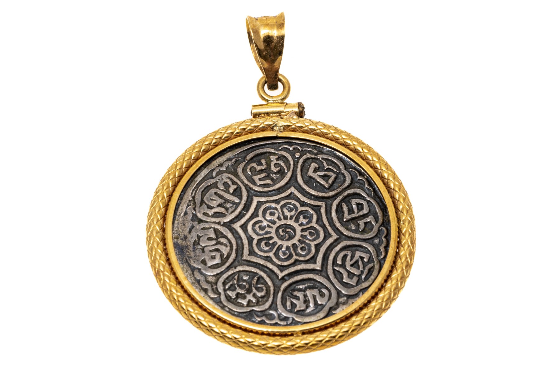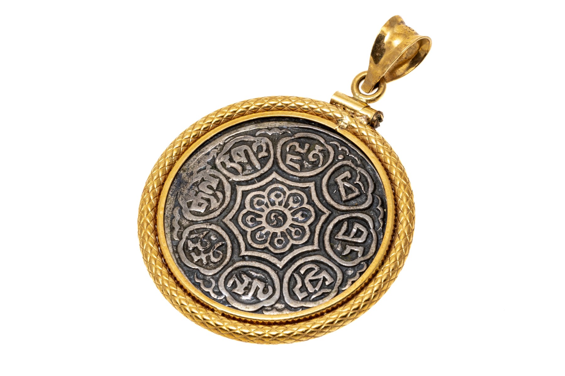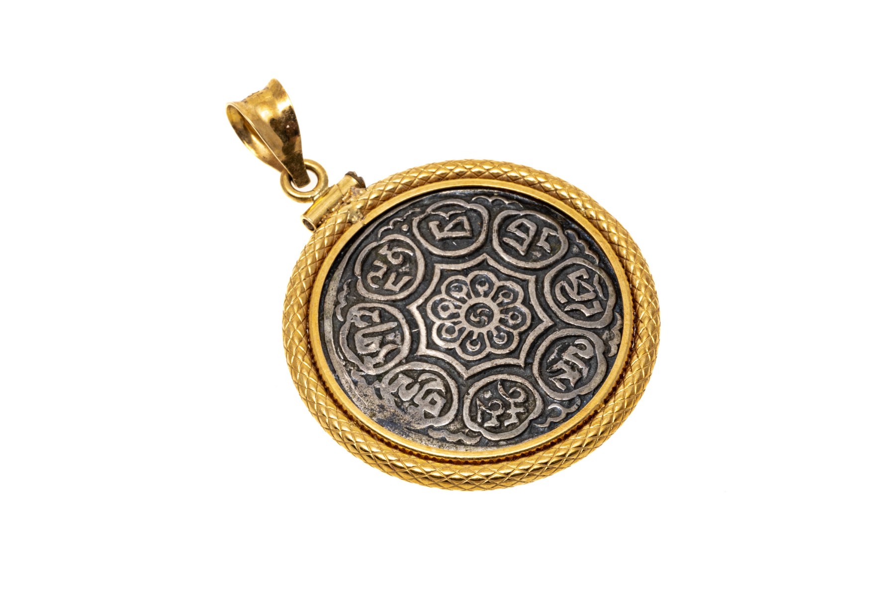 Tibetan style silver coin or medallion set into an 18K yellow gold pendant.