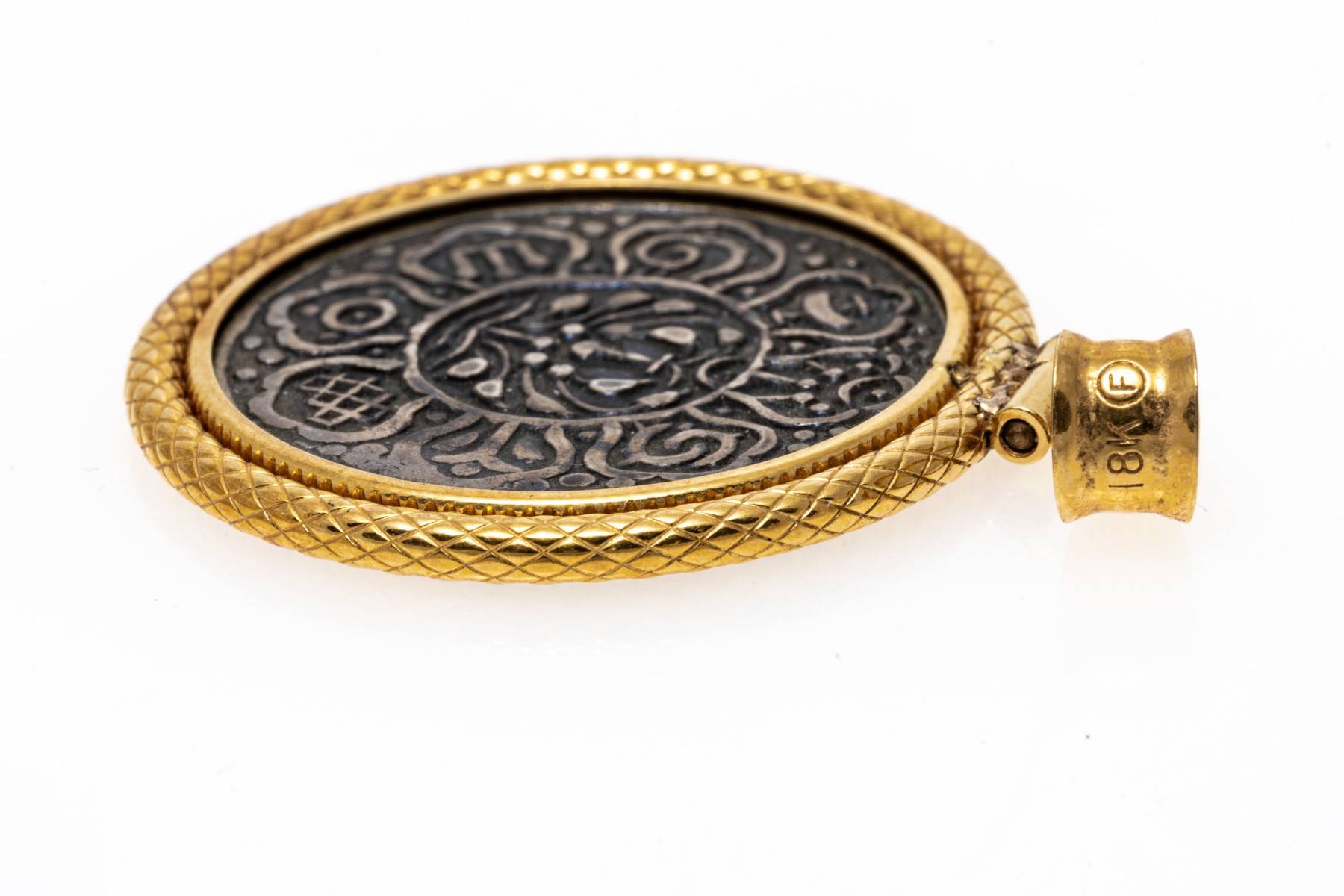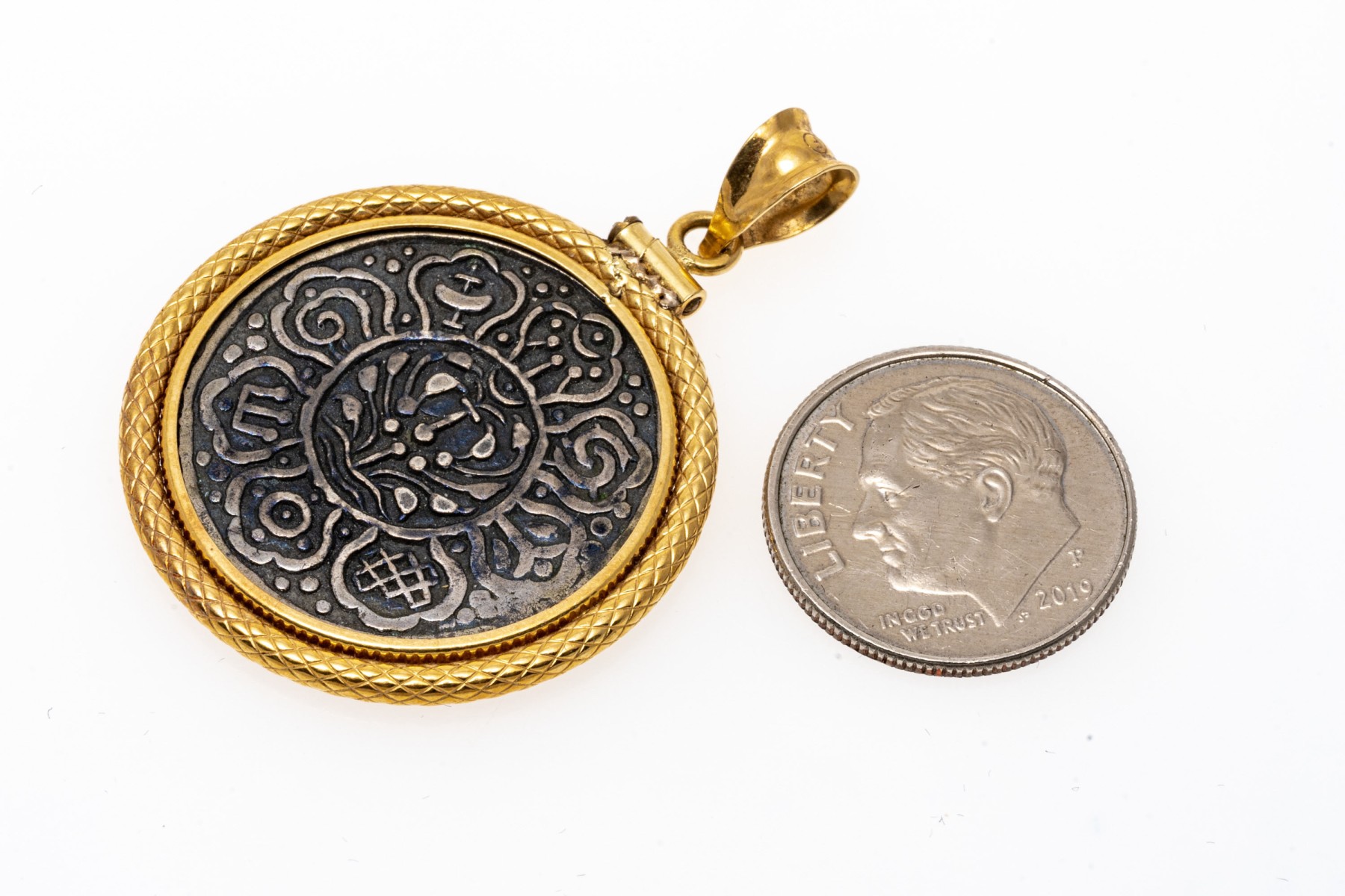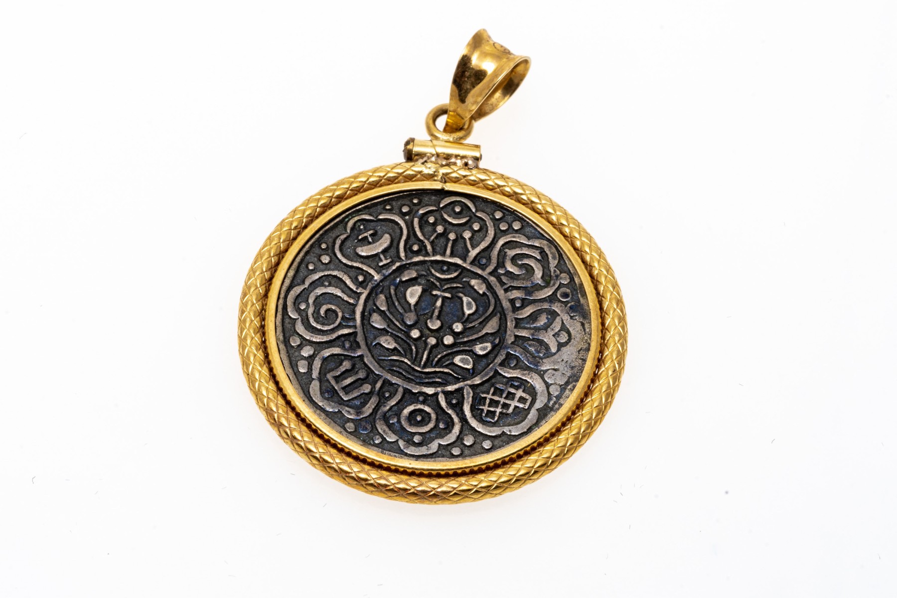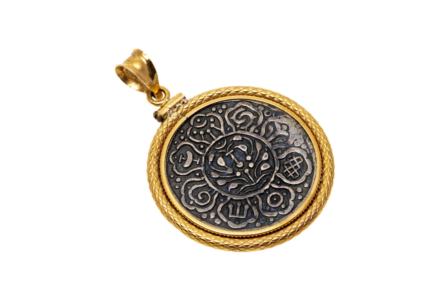 Tibetan style silver coin or medallion set into an 18K yellow gold pendant.
