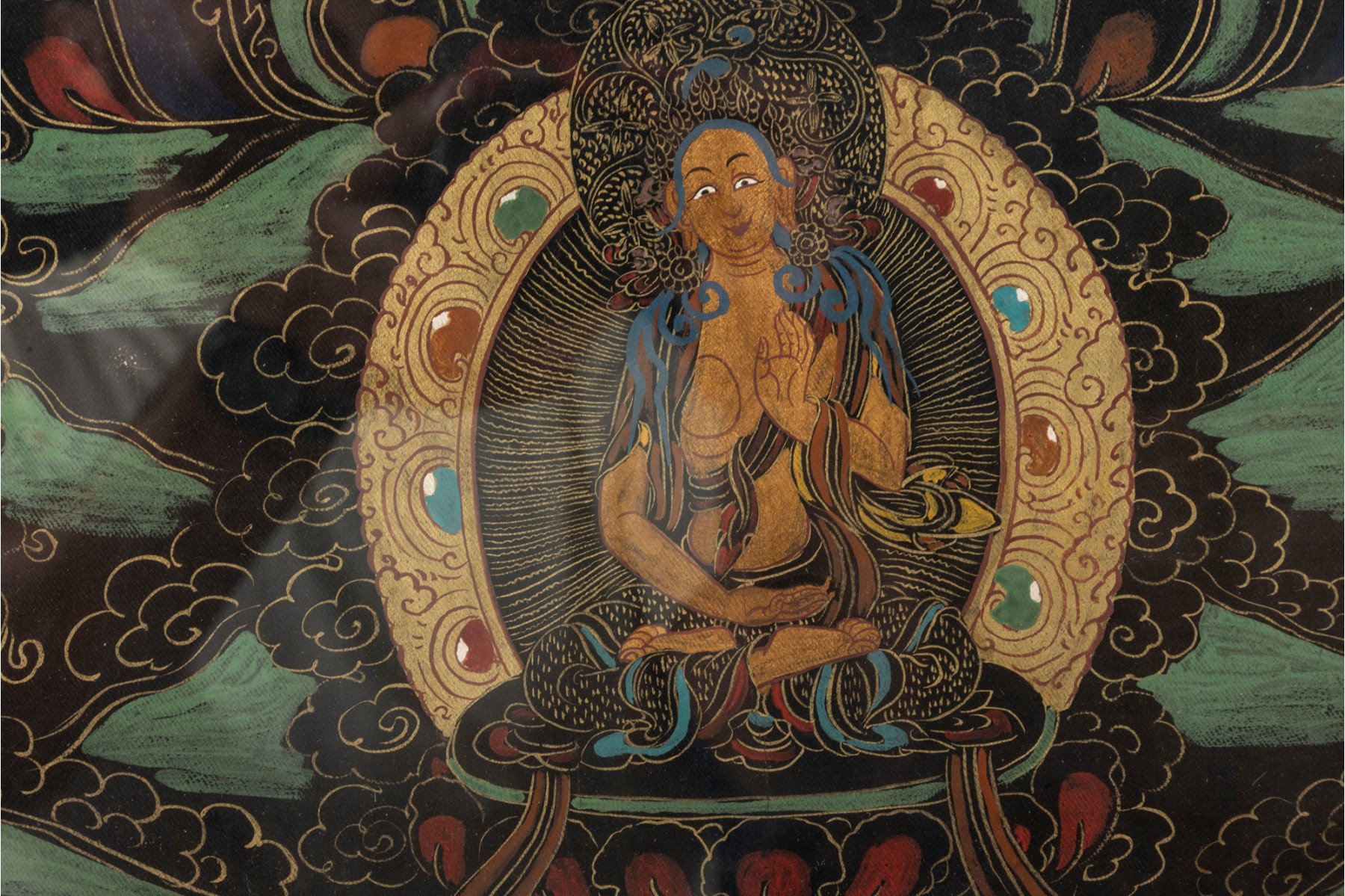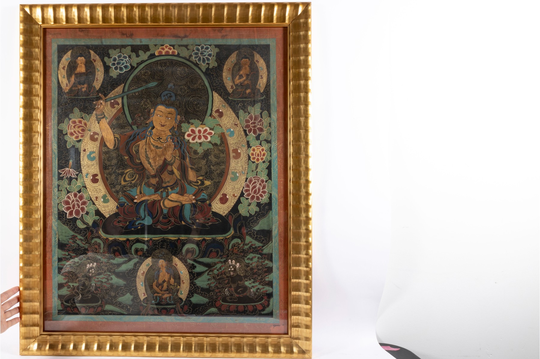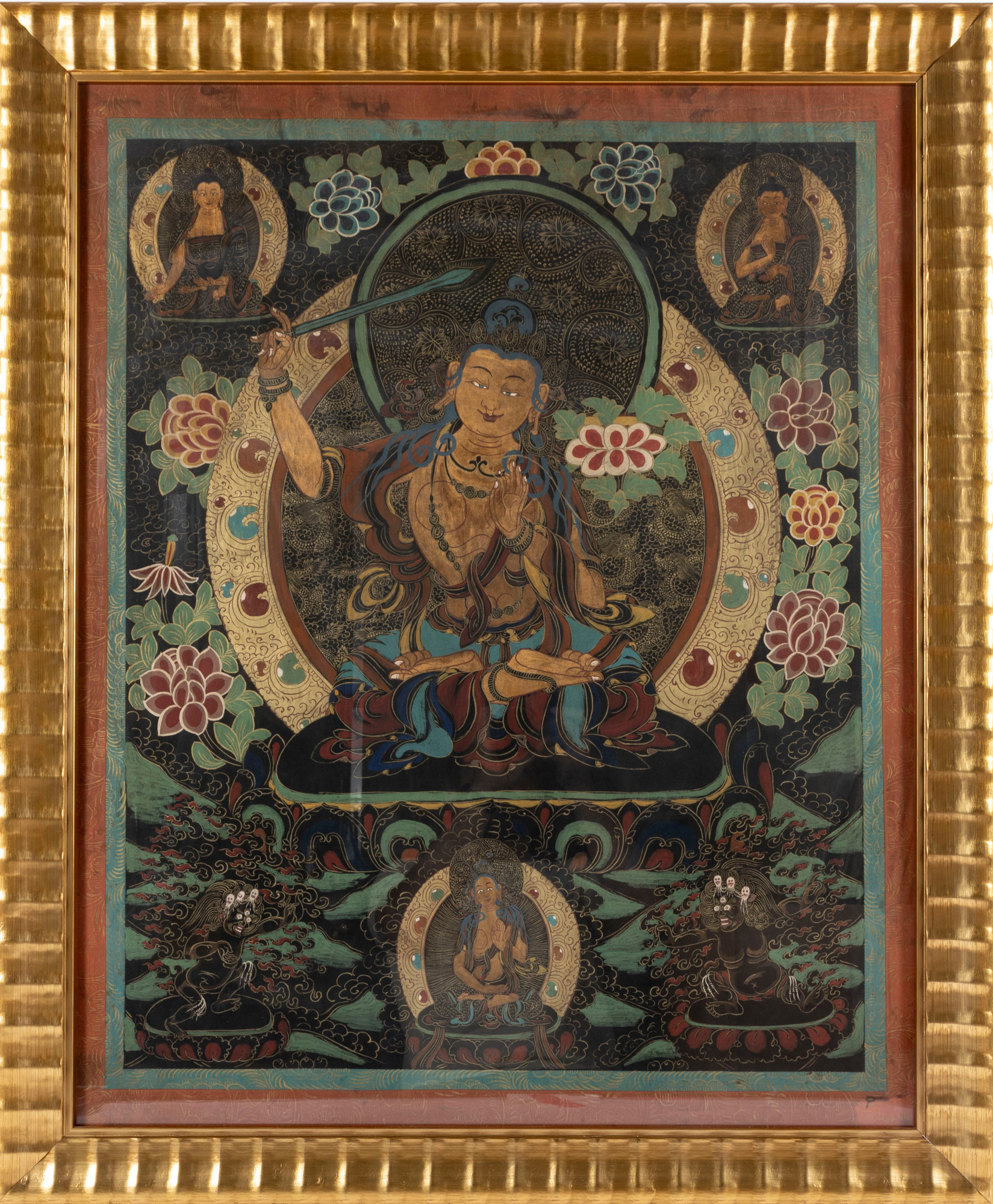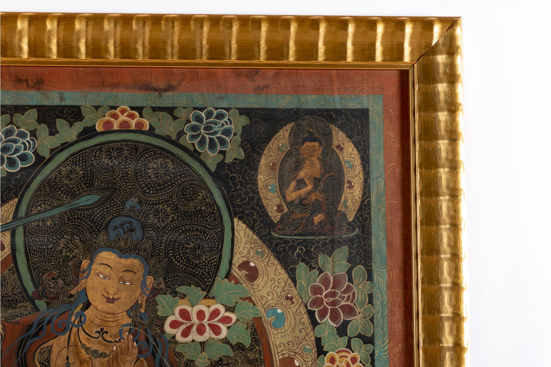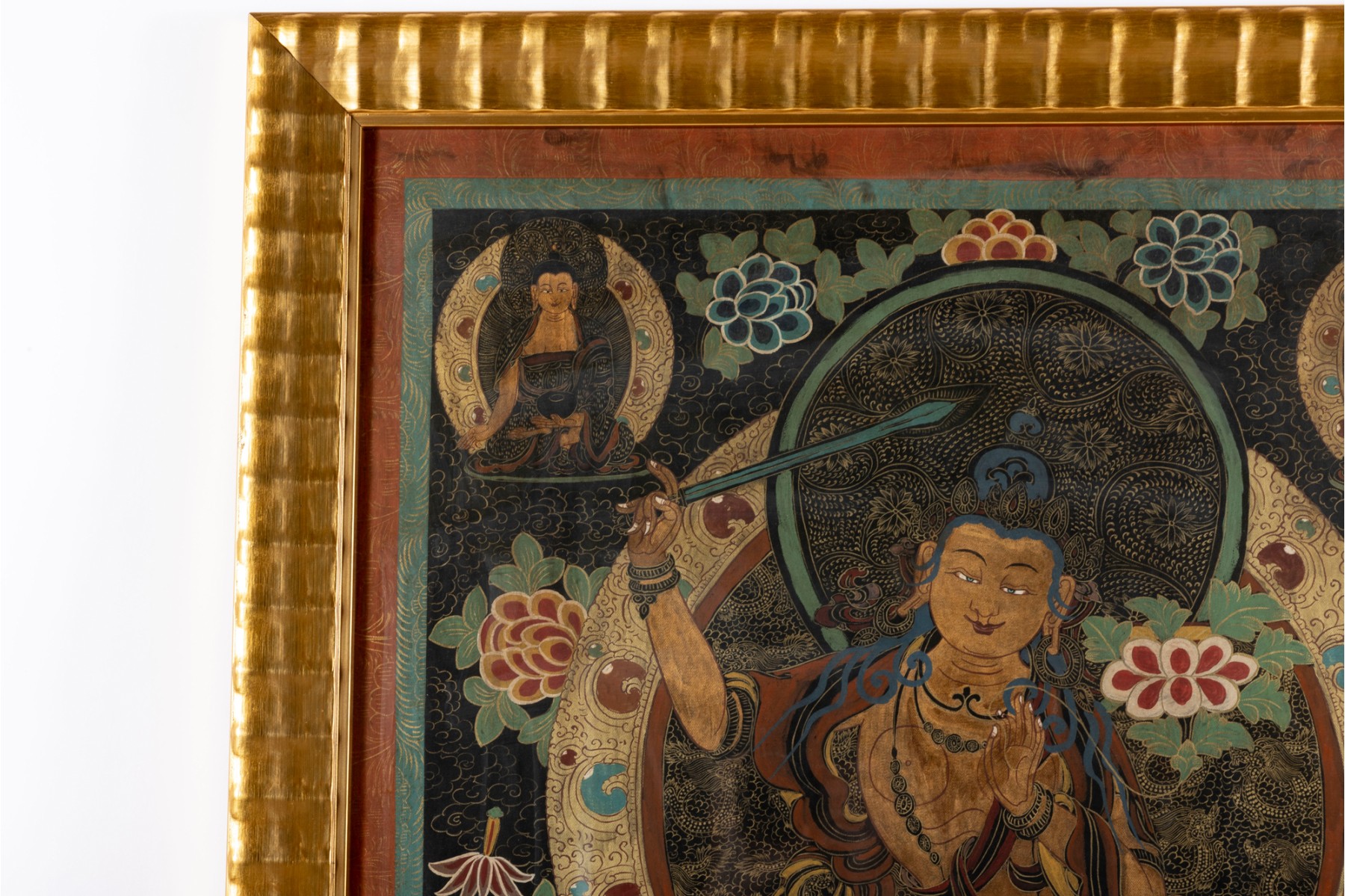 A lovely hand-painted Tibetan Thangka depicting Manjusri, the Buddhist Bodhisattva of Wisdom. Manjusri in Sanskrit means, "He who is noble and gentle" and is showcased holding his Vajra sword in his left hand to fight the entanglements of conceptual views, representing duality. Surrounded by various deities, every inch of this intricate Thangka painting features florals and patterns outlined in gold-tone fabric ink.
