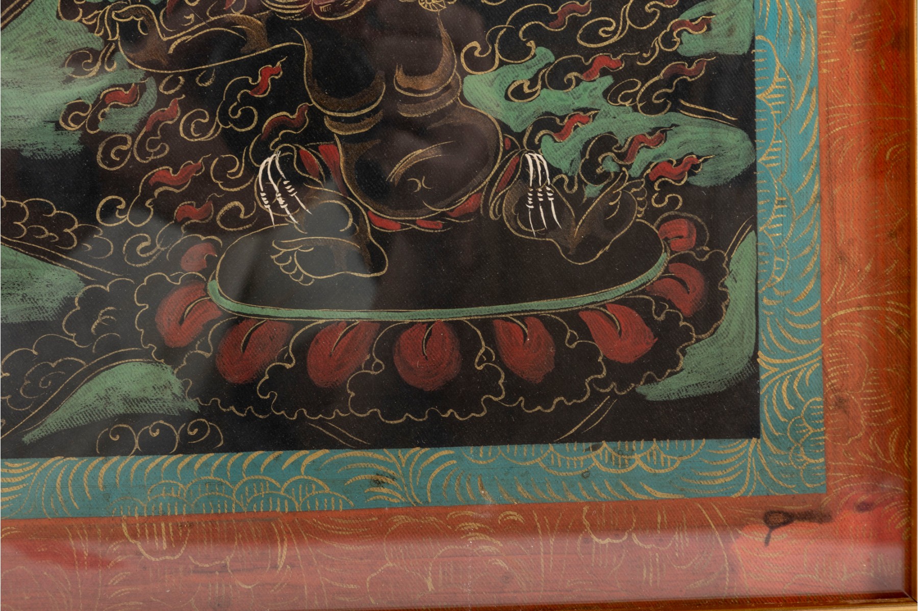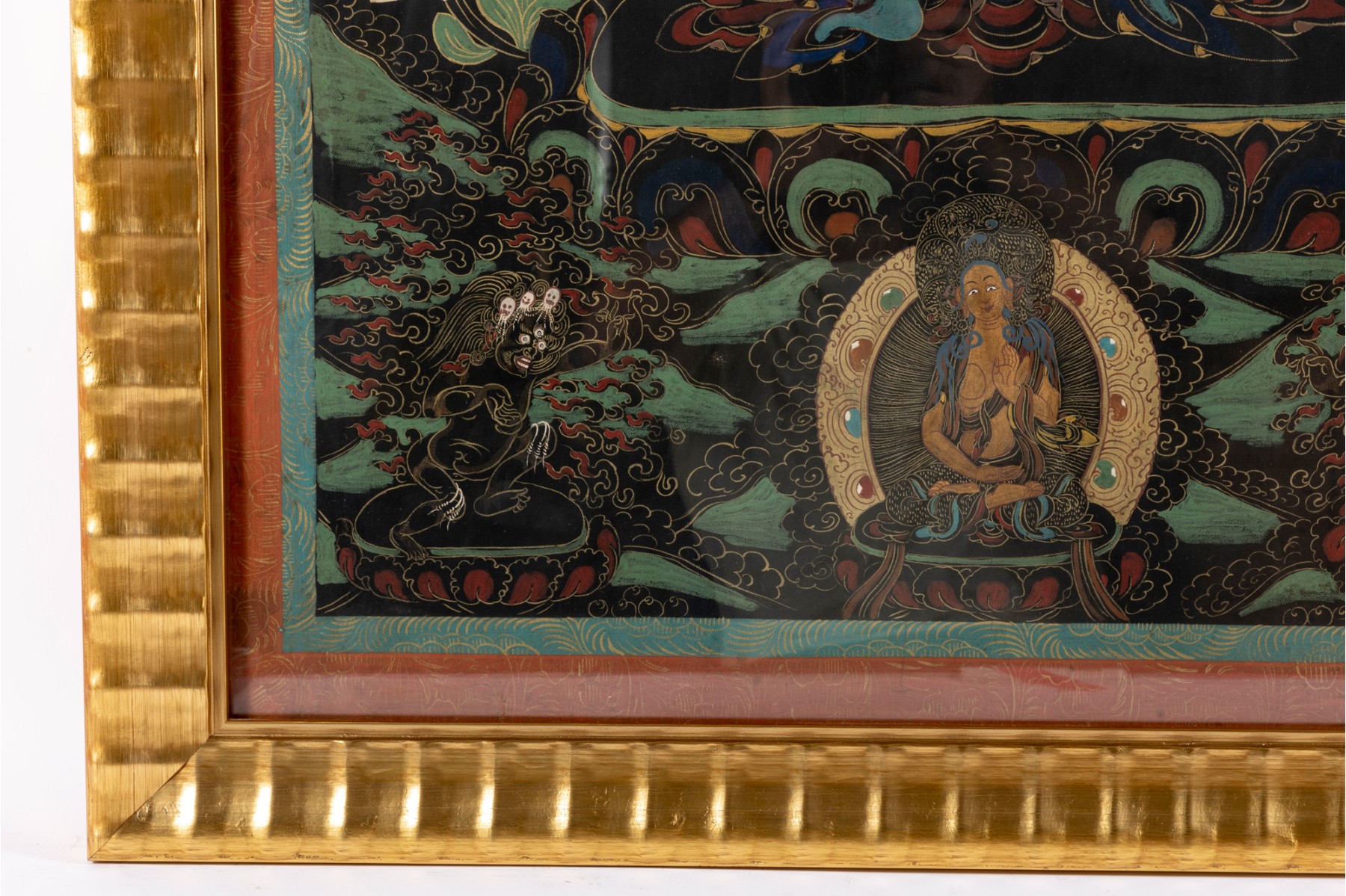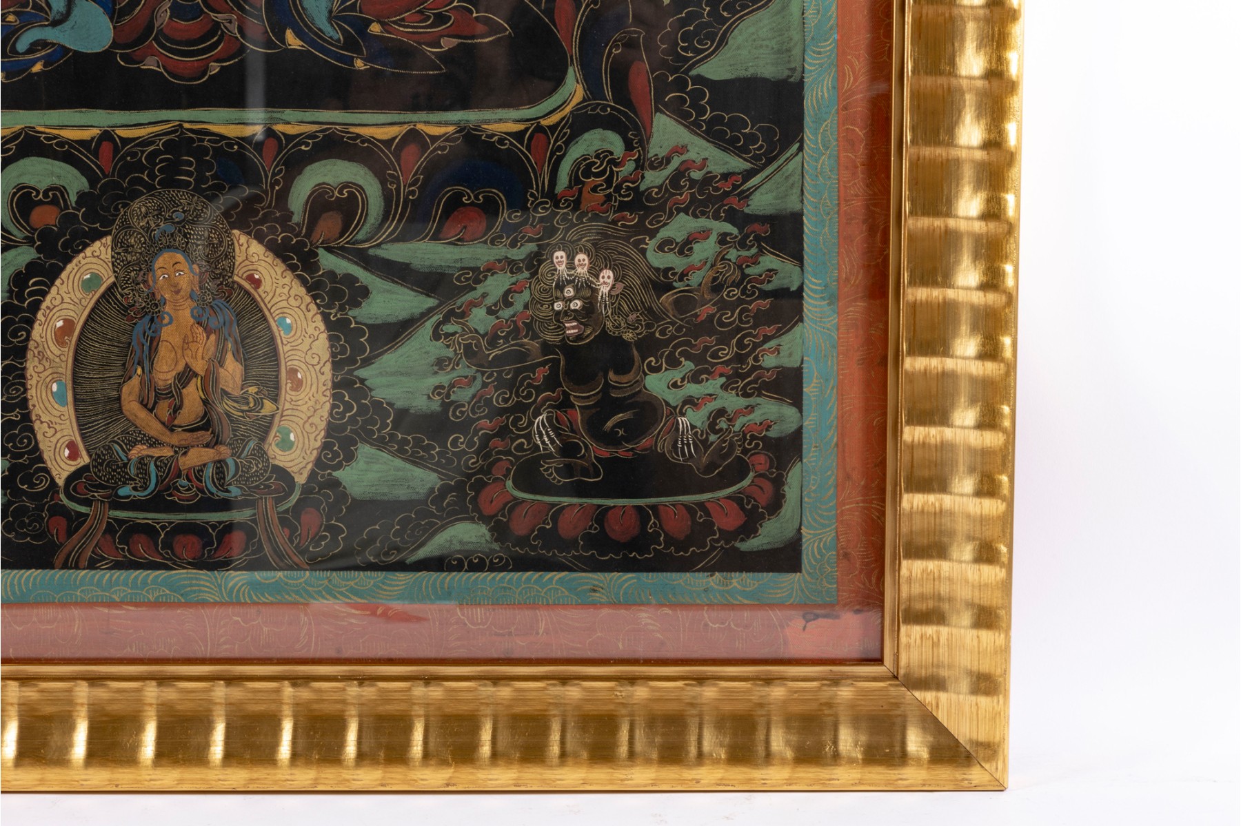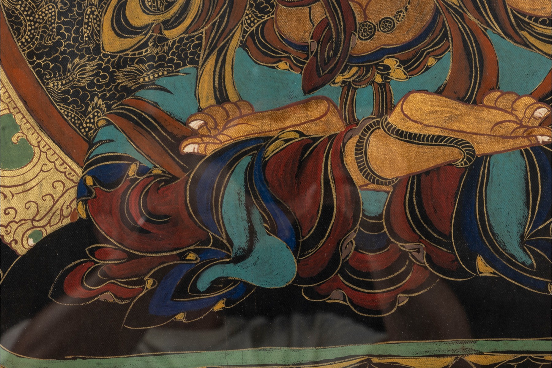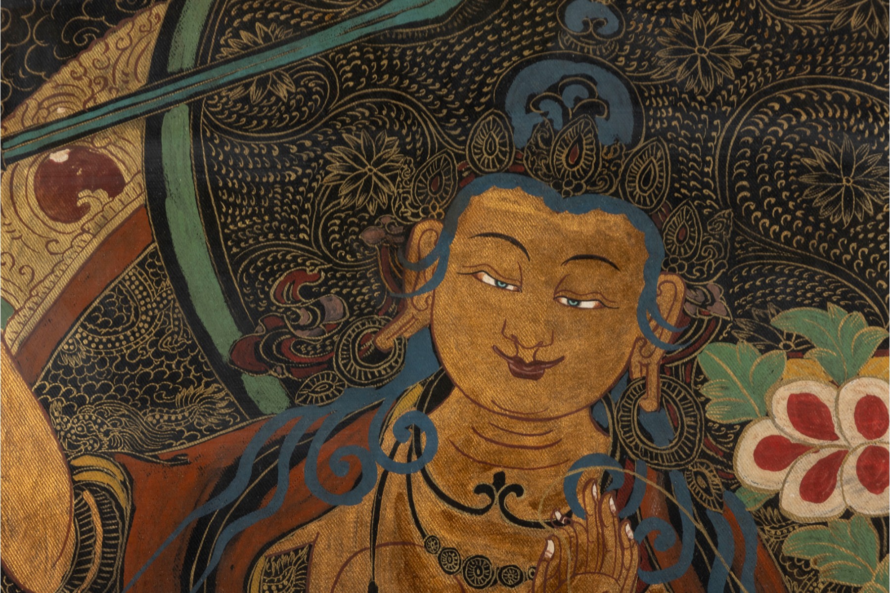 A lovely hand-painted Tibetan Thangka depicting Manjusri, the Buddhist Bodhisattva of Wisdom. Manjusri in Sanskrit means, "He who is noble and gentle" and is showcased holding his Vajra sword in his left hand to fight the entanglements of conceptual views, representing duality. Surrounded by various deities, every inch of this intricate Thangka painting features florals and patterns outlined in gold-tone fabric ink.