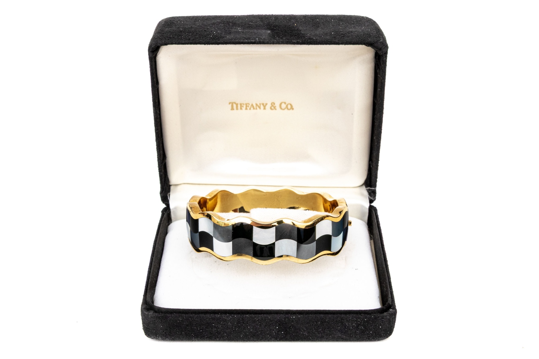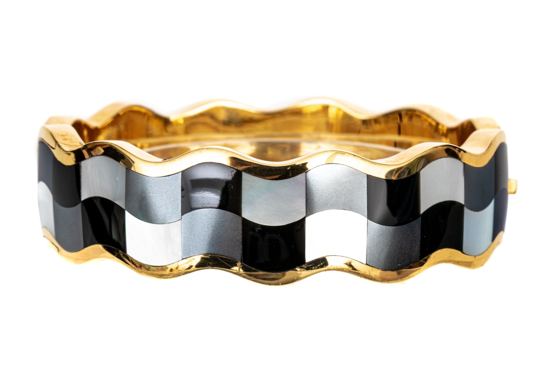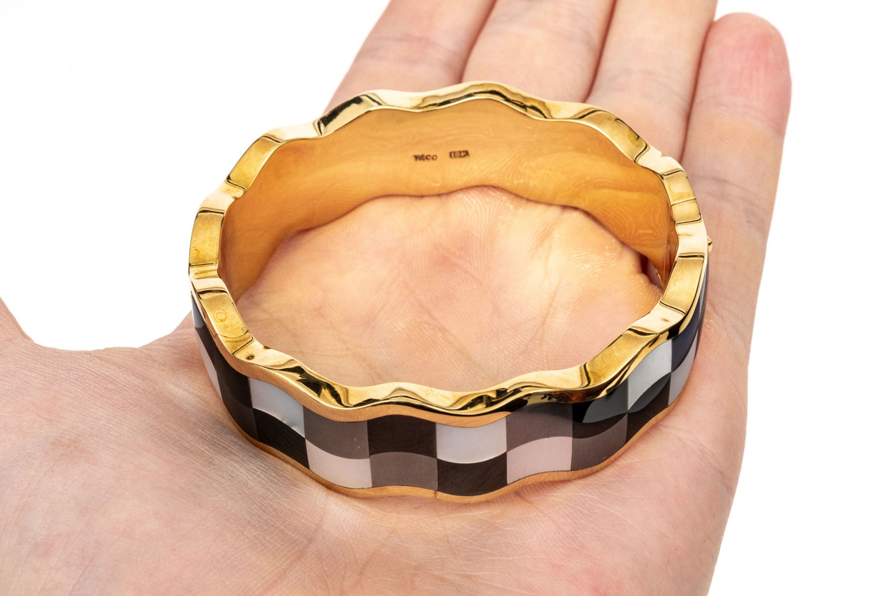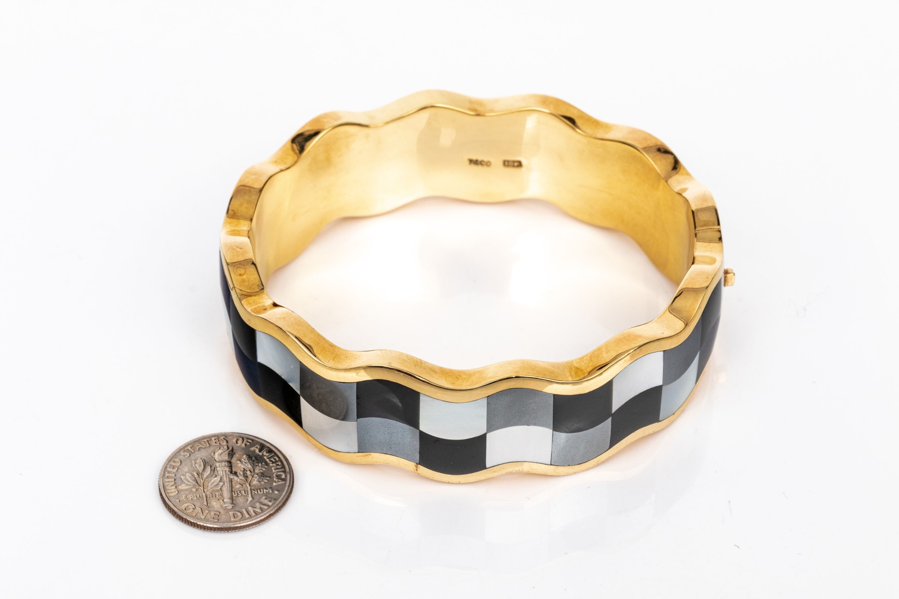Tiffany & Co. 18k yellow gold Angela Cummings fabulous inlaid wave bangle bracelet. This wonderful hinged bracelet features a checkerboard inlay of grey color hematite, black onyx and mother-of-pearl tiles, juxtaposed to an organic wave border and finished with a discreet push button clasp and diminutve safety clasp.