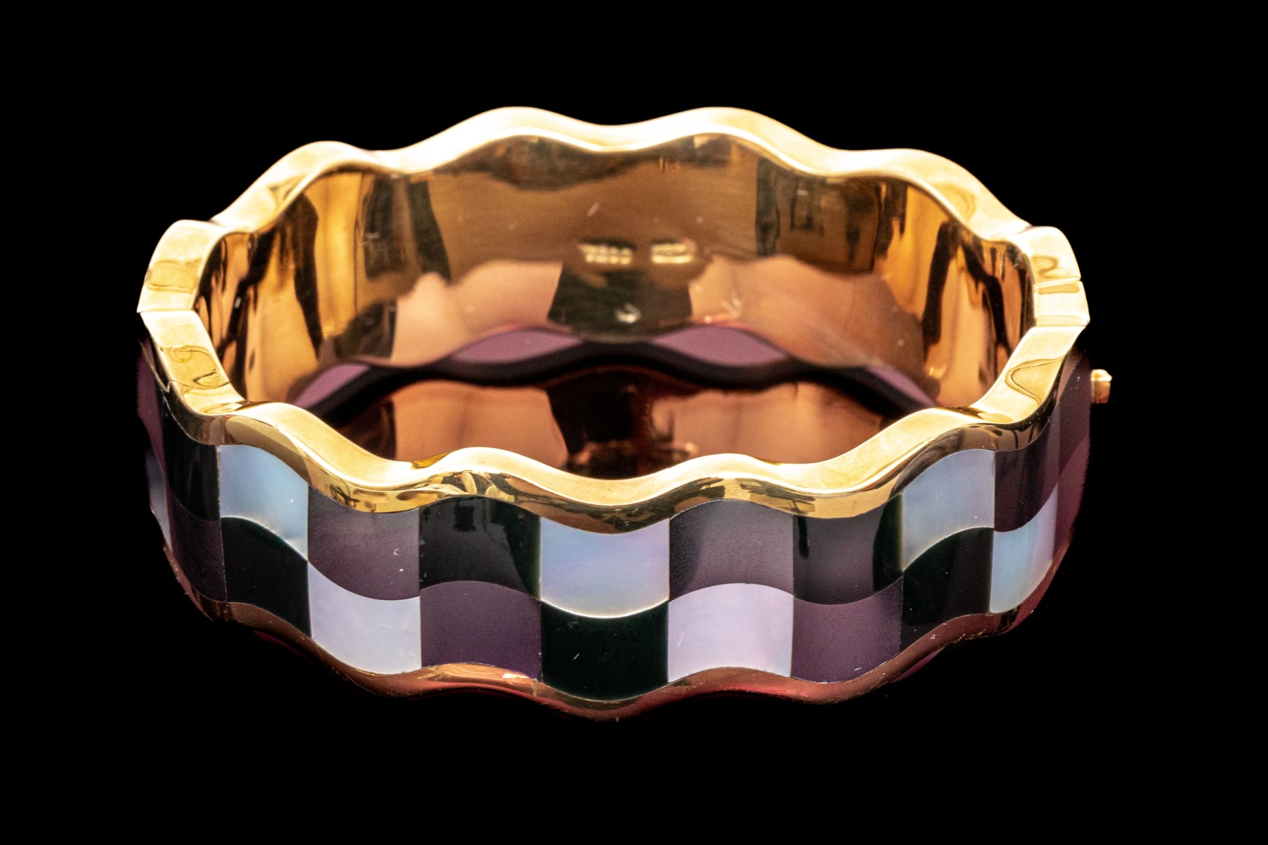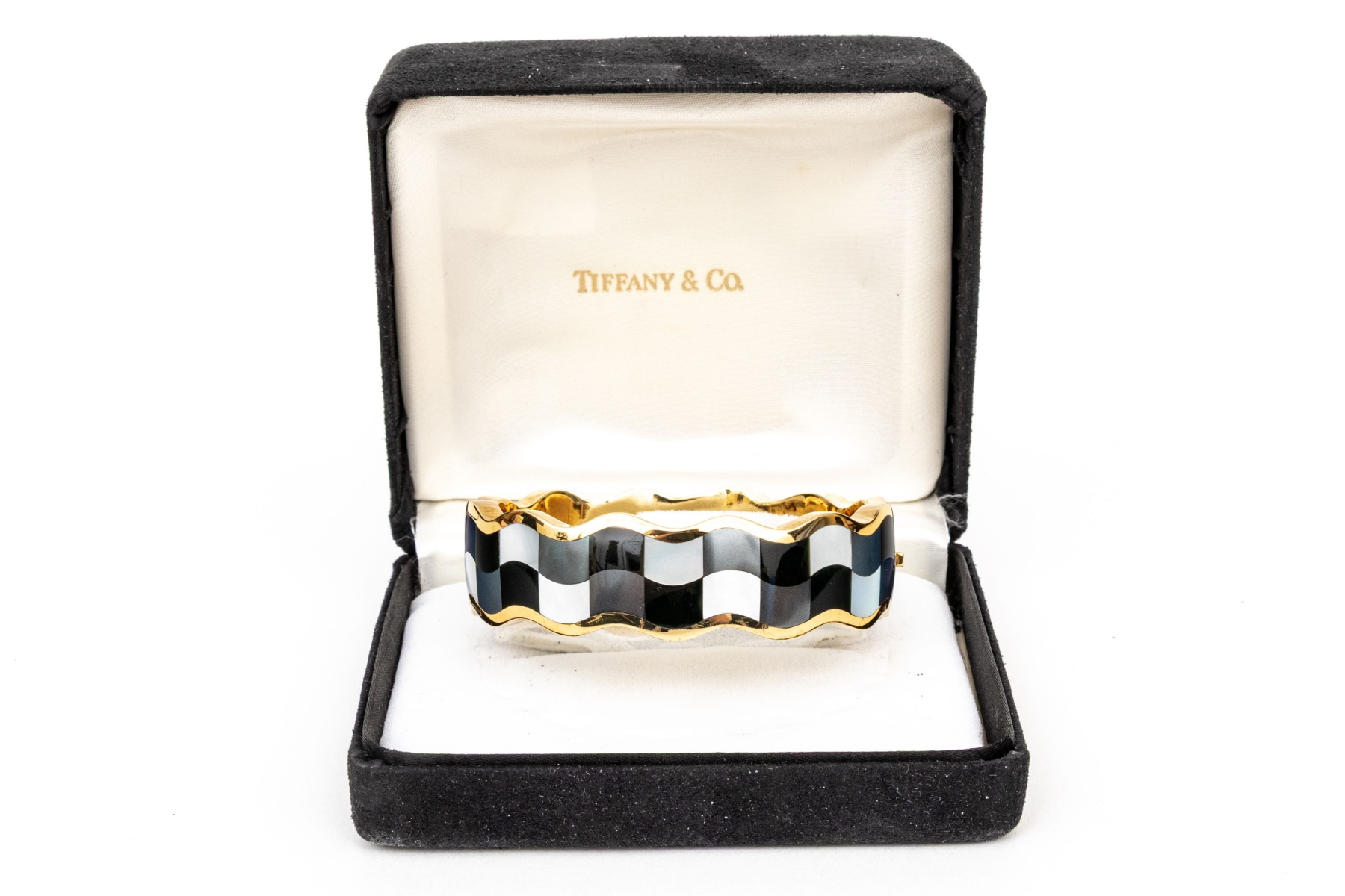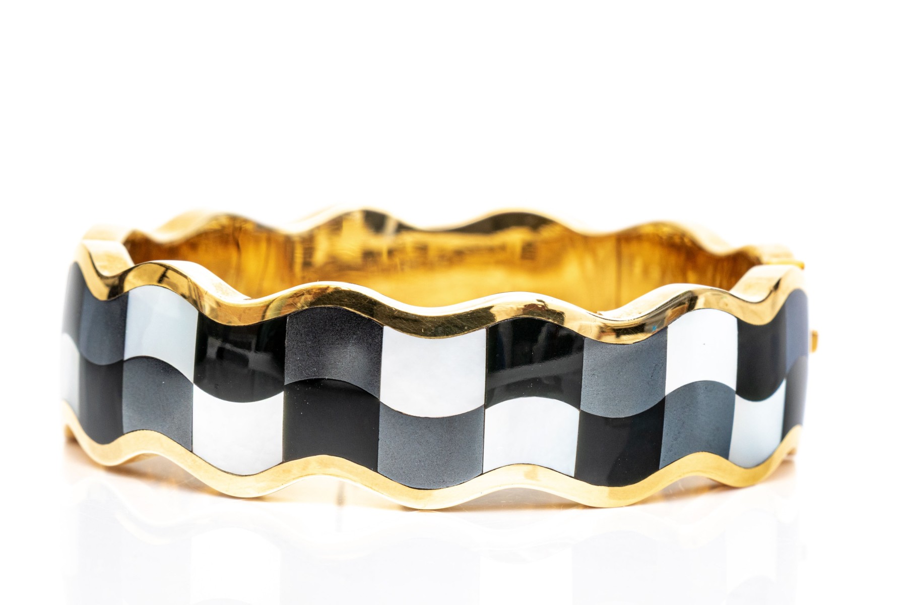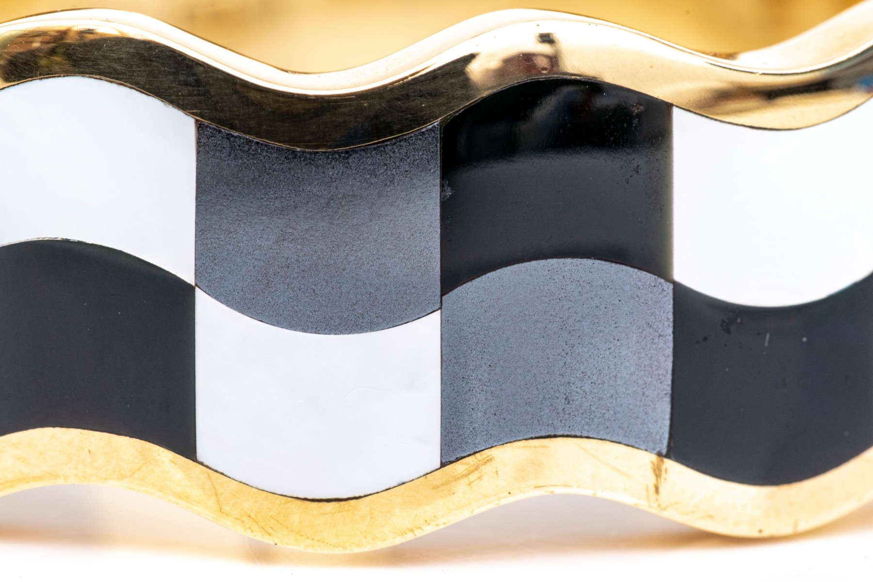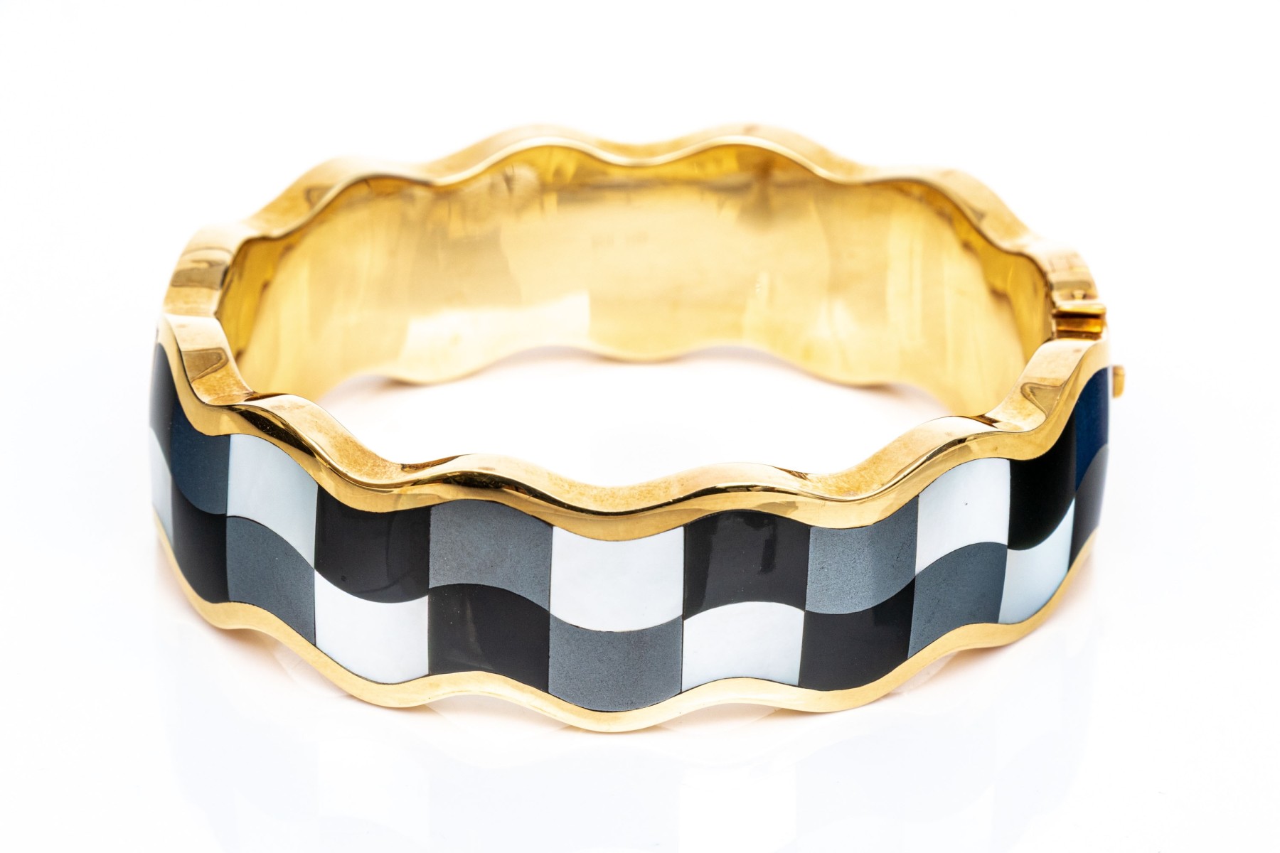 Tiffany & Co. 18k yellow gold Angela Cummings fabulous inlaid wave bangle bracelet. This wonderful hinged bracelet features a checkerboard inlay of grey color hematite, black onyx and mother-of-pearl tiles, juxtaposed to an organic wave border and finished with a discreet push button clasp and diminutve safety clasp.