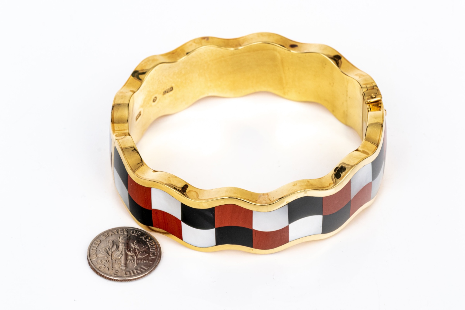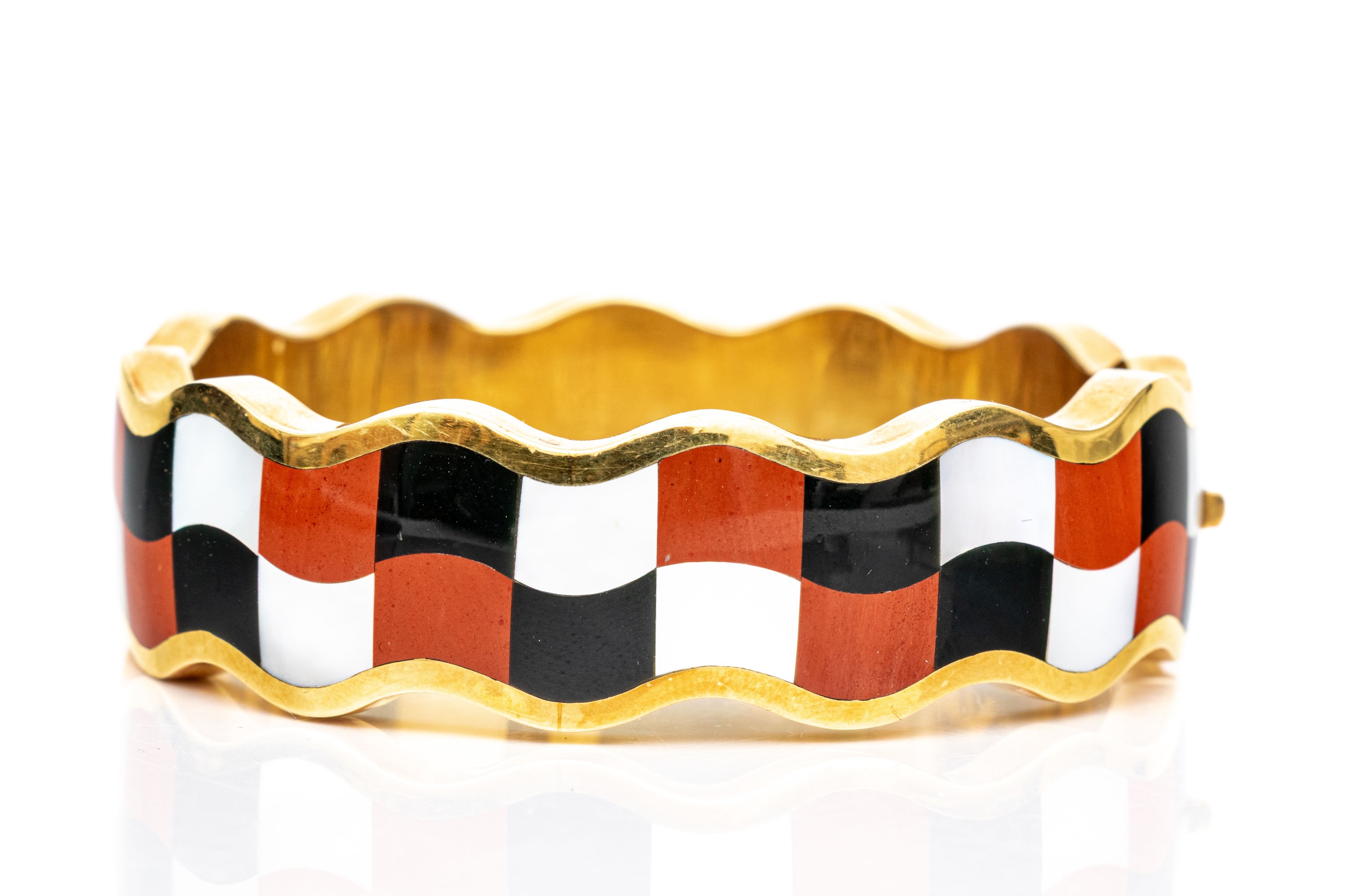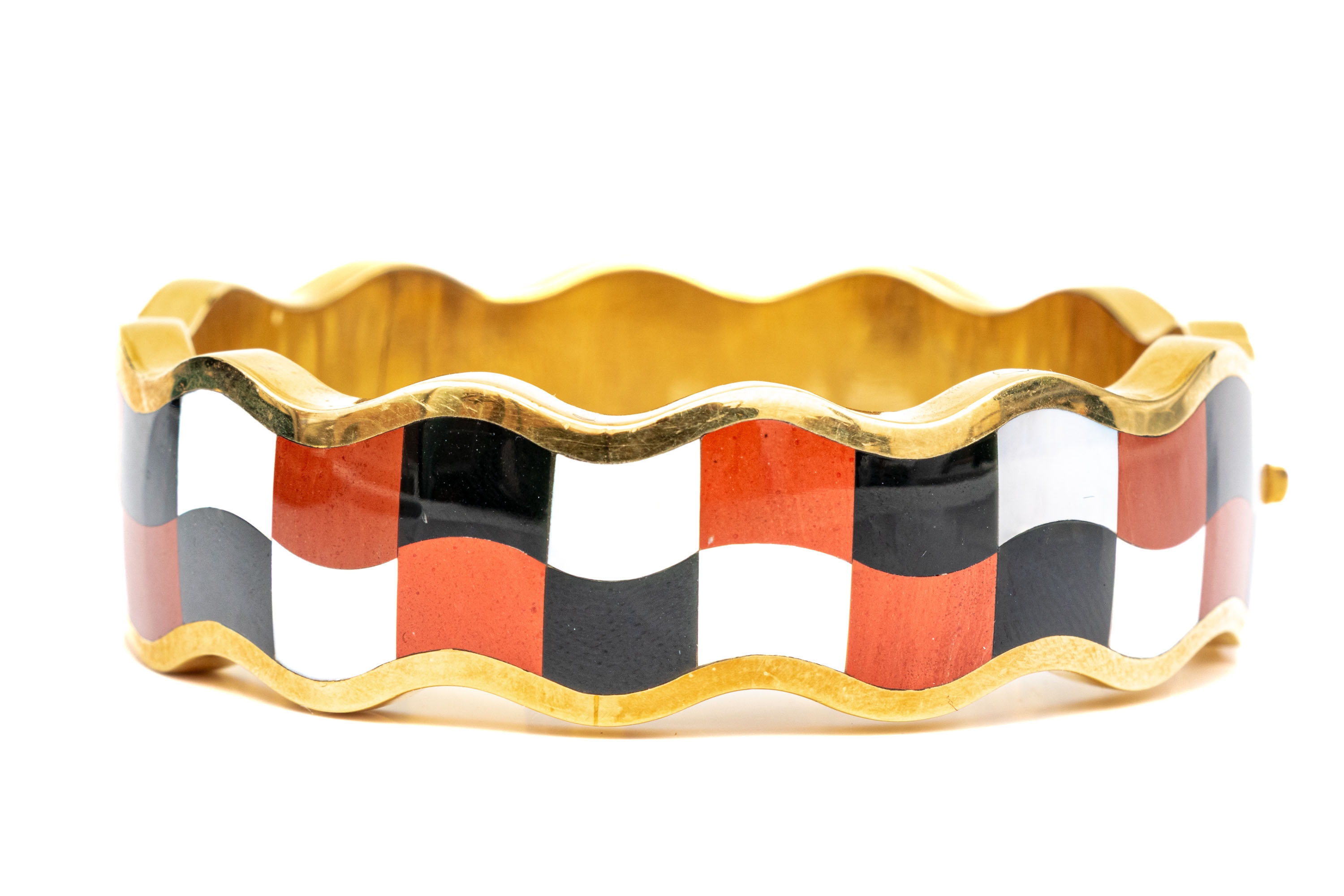Tiffany & Co. 18k yellow gold Angela Cummings wonderful inlaid wave bangle bracelet. This emblematic hinged bracelet features a checkerboard inlay of rust color jasper, black onyx and mother-of-pearl tiles, juxtaposed to an organic wave border and finished with a discreet push button clasp and diminutve safety clasp.