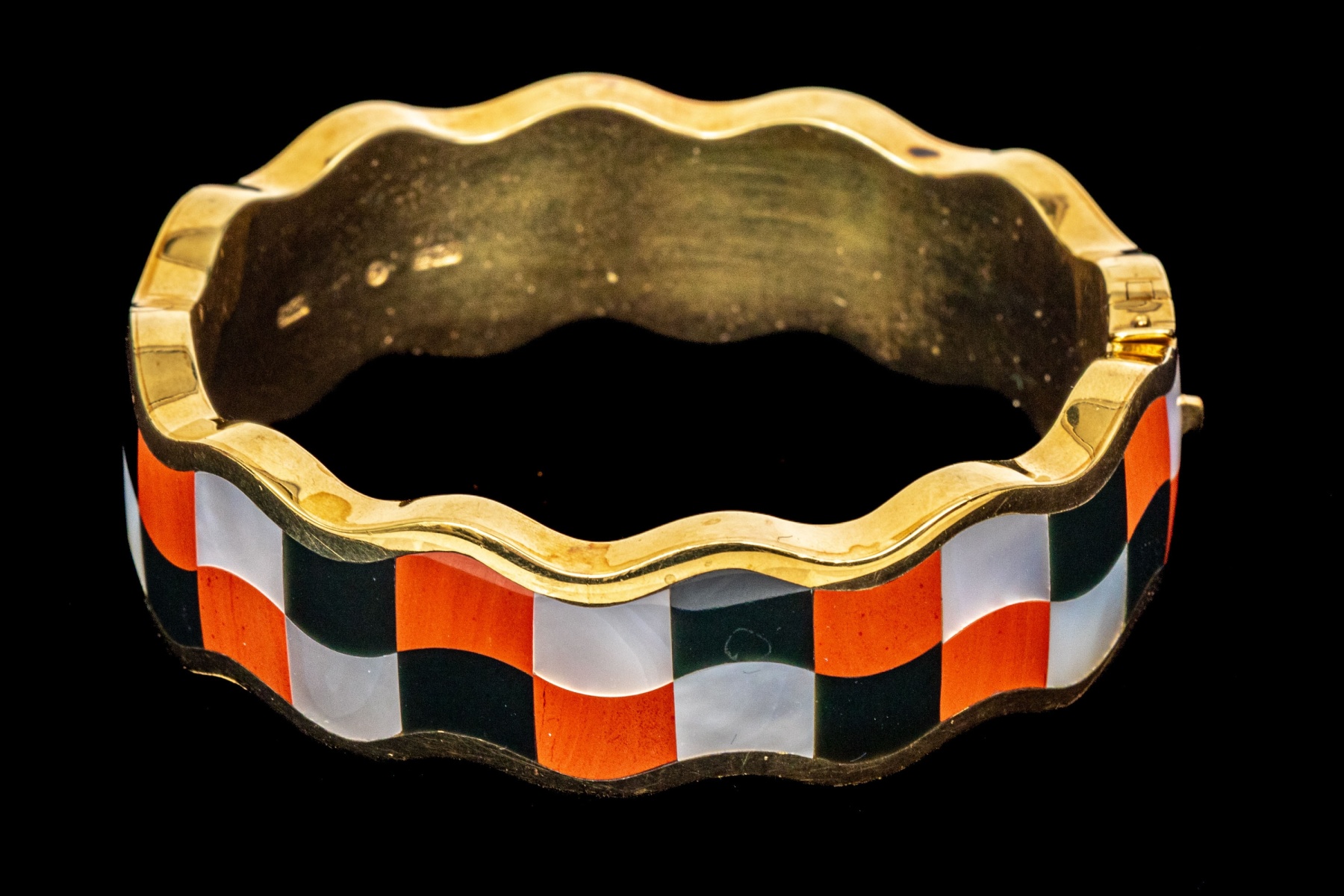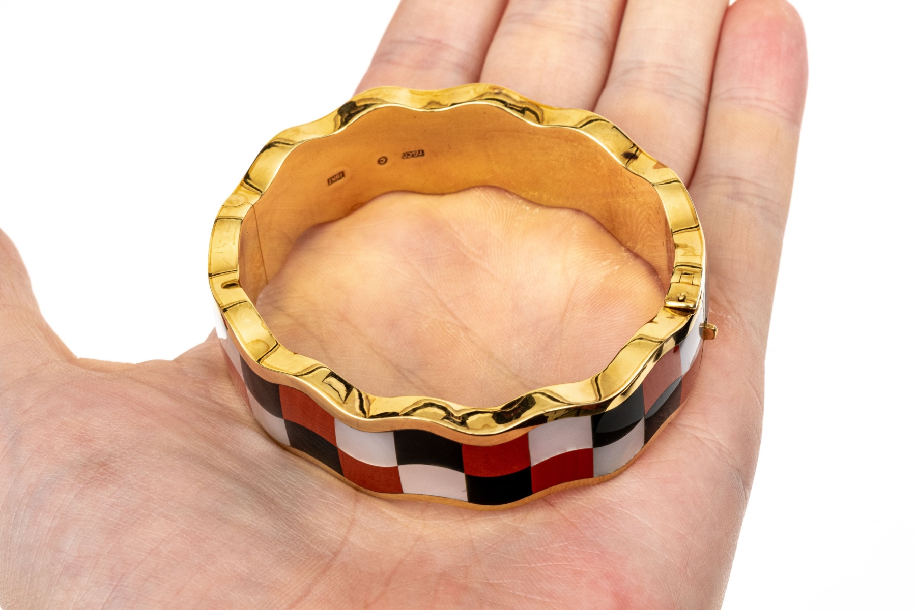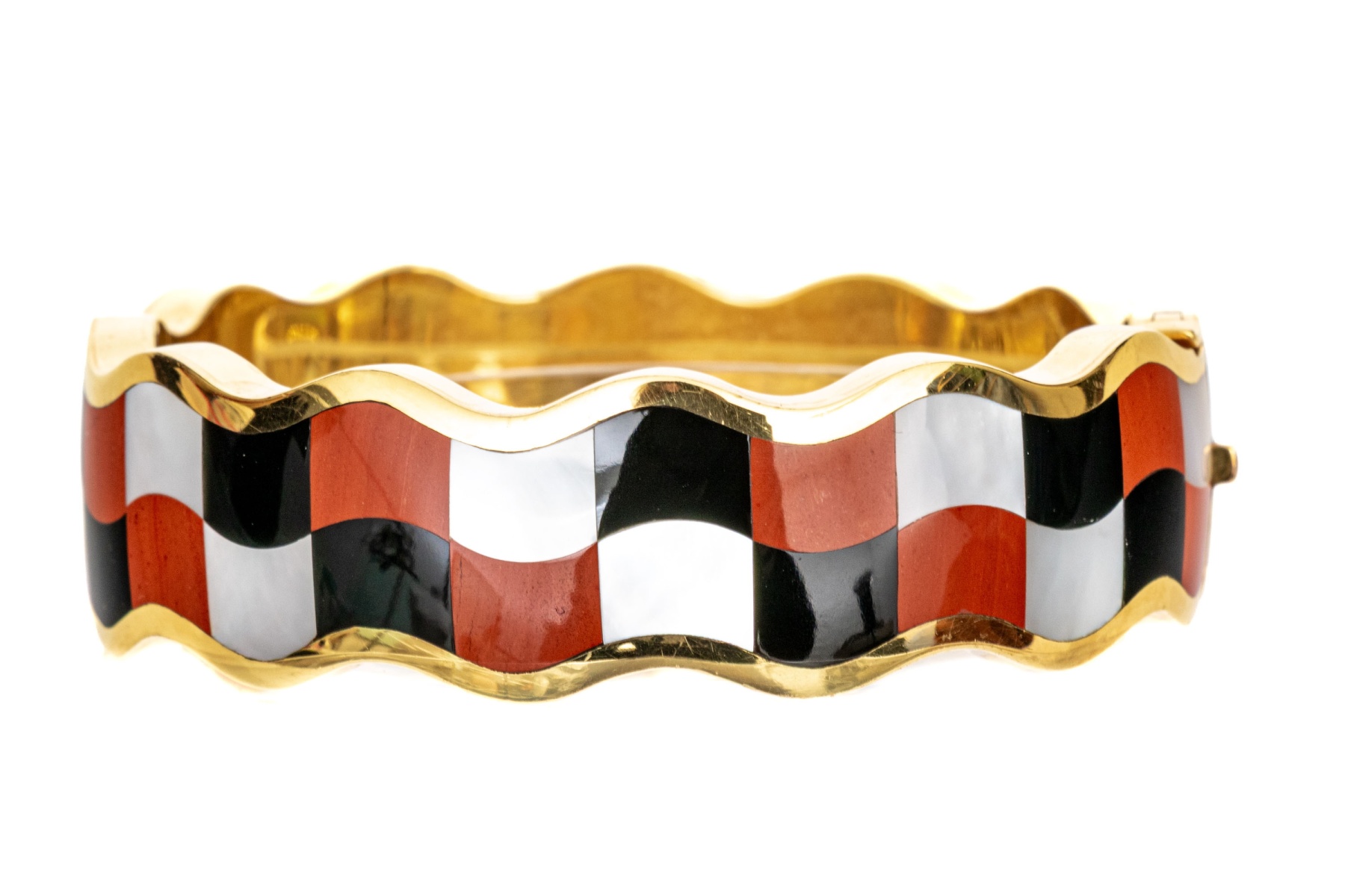 Tiffany & Co. 18k yellow gold Angela Cummings wonderful inlaid wave bangle bracelet. This emblematic hinged bracelet features a checkerboard inlay of rust color jasper, black onyx and mother-of-pearl tiles, juxtaposed to an organic wave border and finished with a discreet push button clasp and diminutve safety clasp.