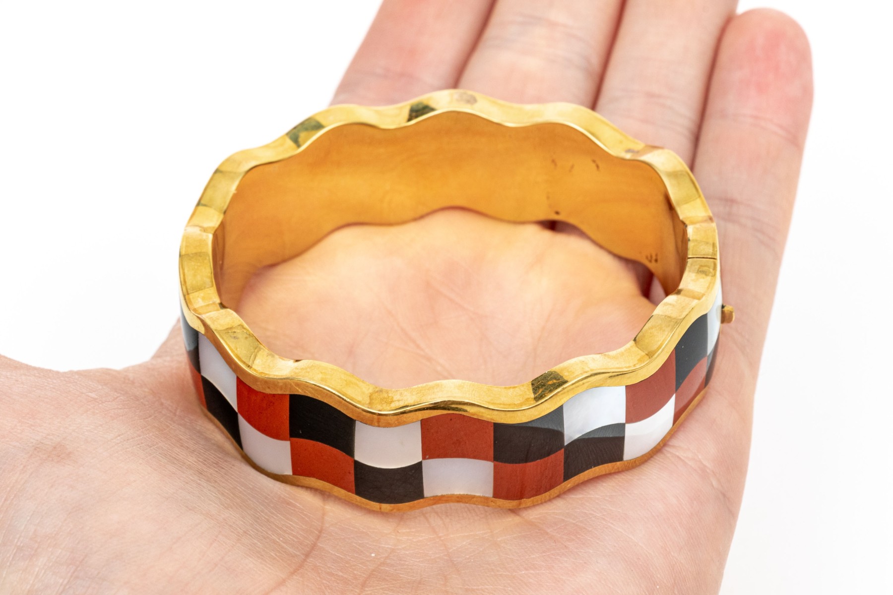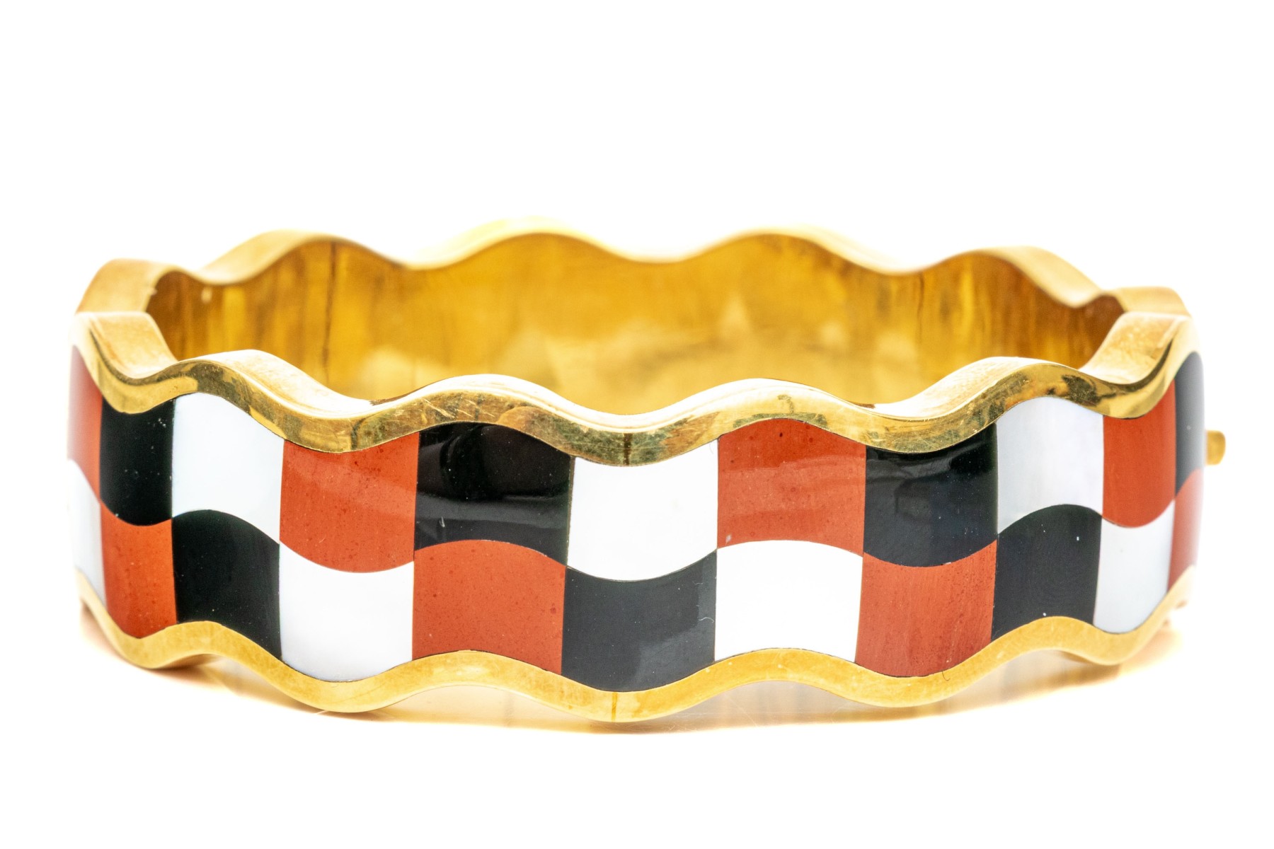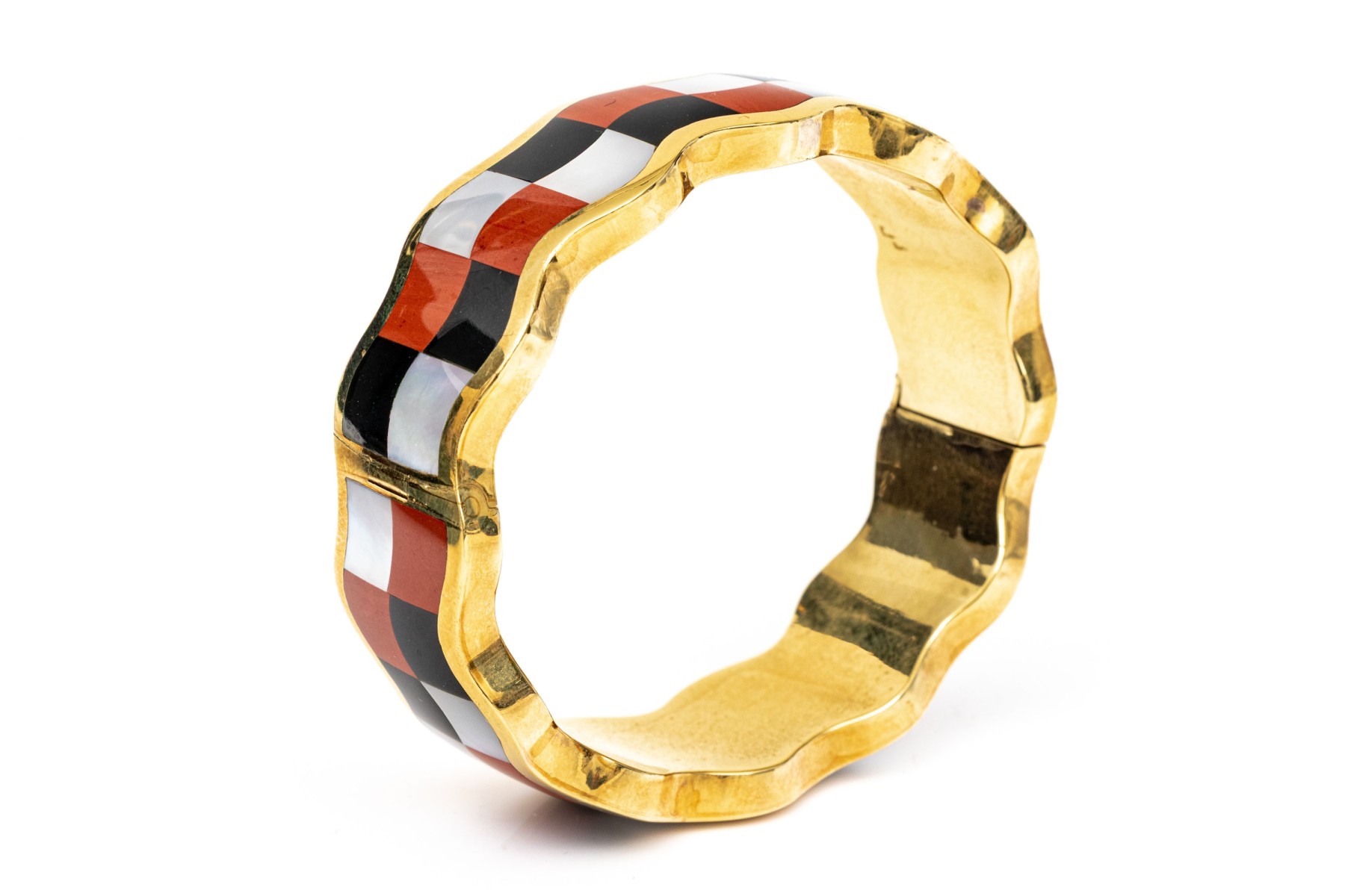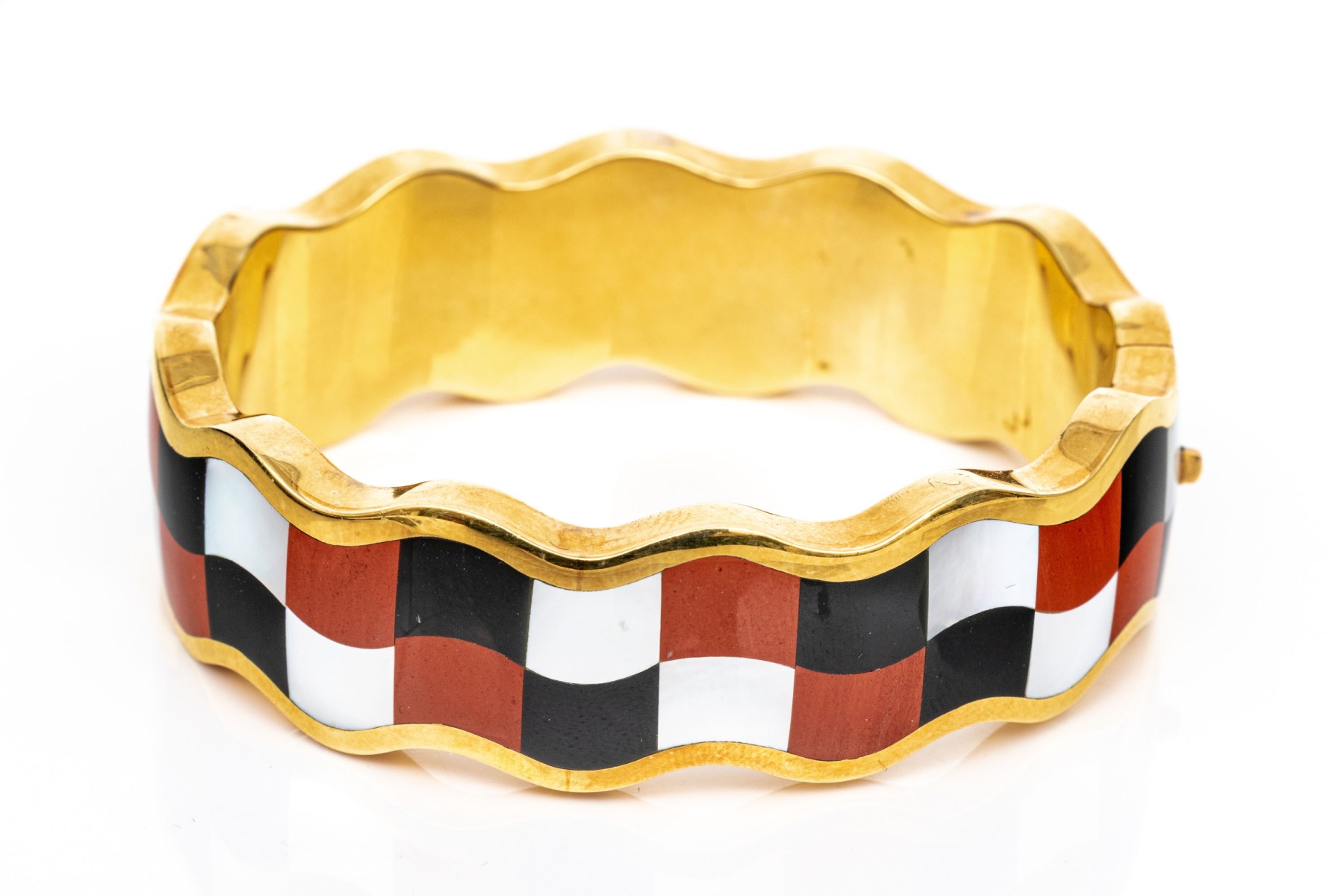Tiffany & Co. 18k yellow gold Angela Cummings wonderful inlaid wave bangle bracelet. This emblematic hinged bracelet features a checkerboard inlay of rust color jasper, black onyx and mother-of-pearl tiles, juxtaposed to an organic wave border and finished with a discreet push button clasp and diminutve safety clasp.