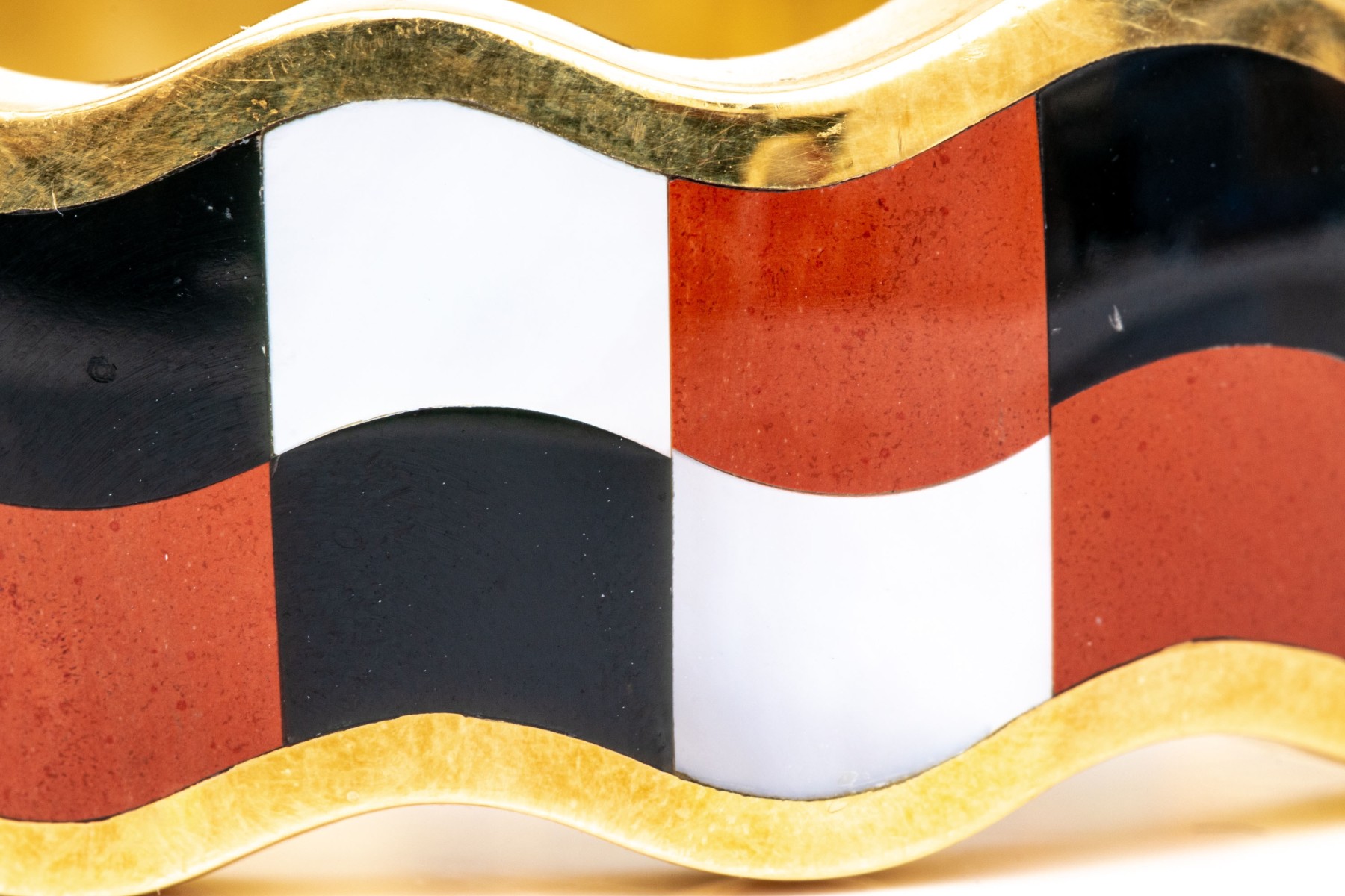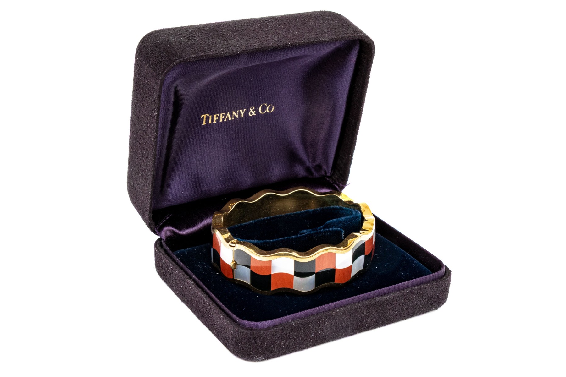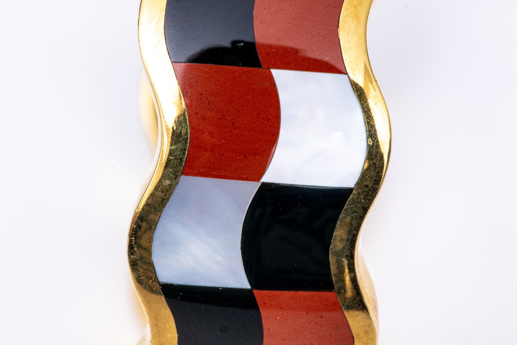 Tiffany & Co. 18k yellow gold Angela Cummings wonderful inlaid wave bangle bracelet. This emblematic hinged bracelet features a checkerboard inlay of rust color jasper, black onyx and mother-of-pearl tiles, juxtaposed to an organic wave border and finished with a discreet push button clasp and diminutve safety clasp.