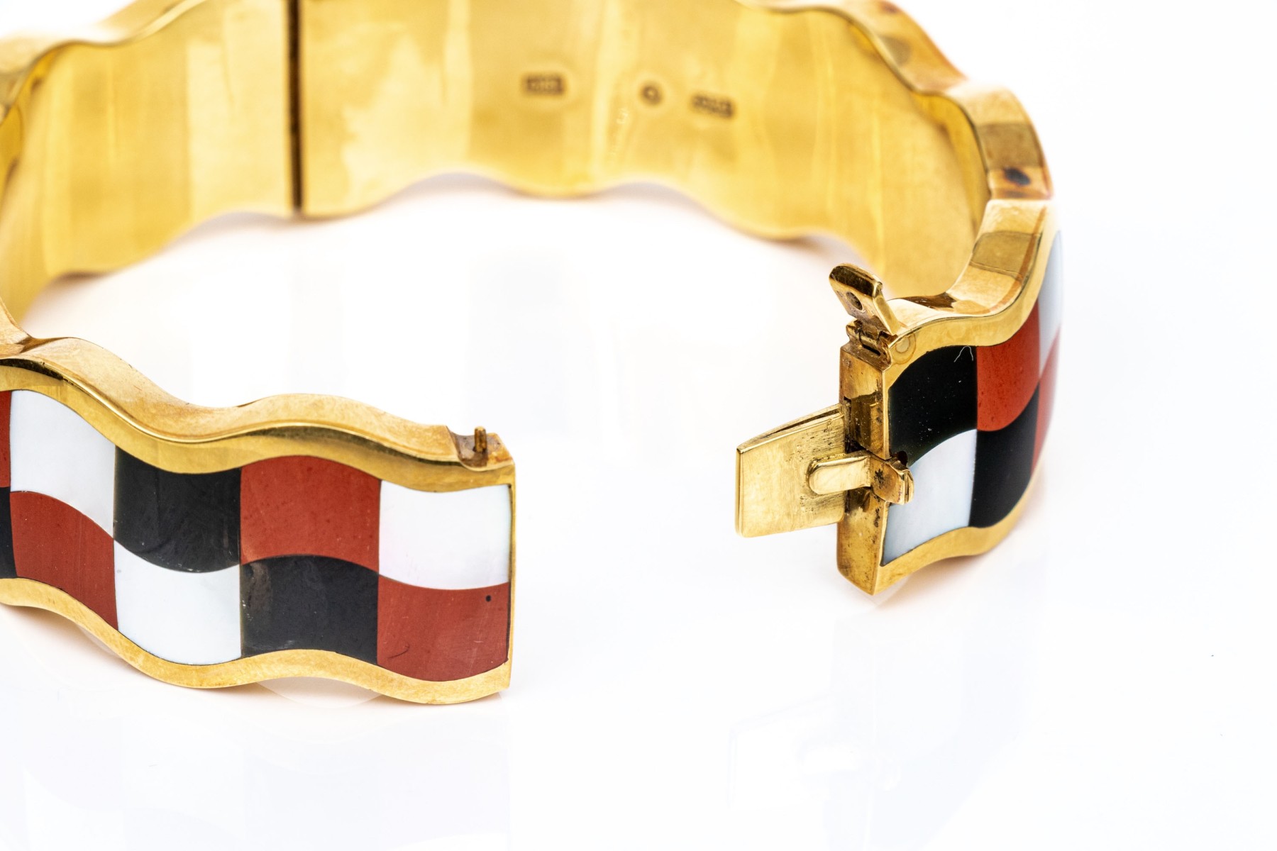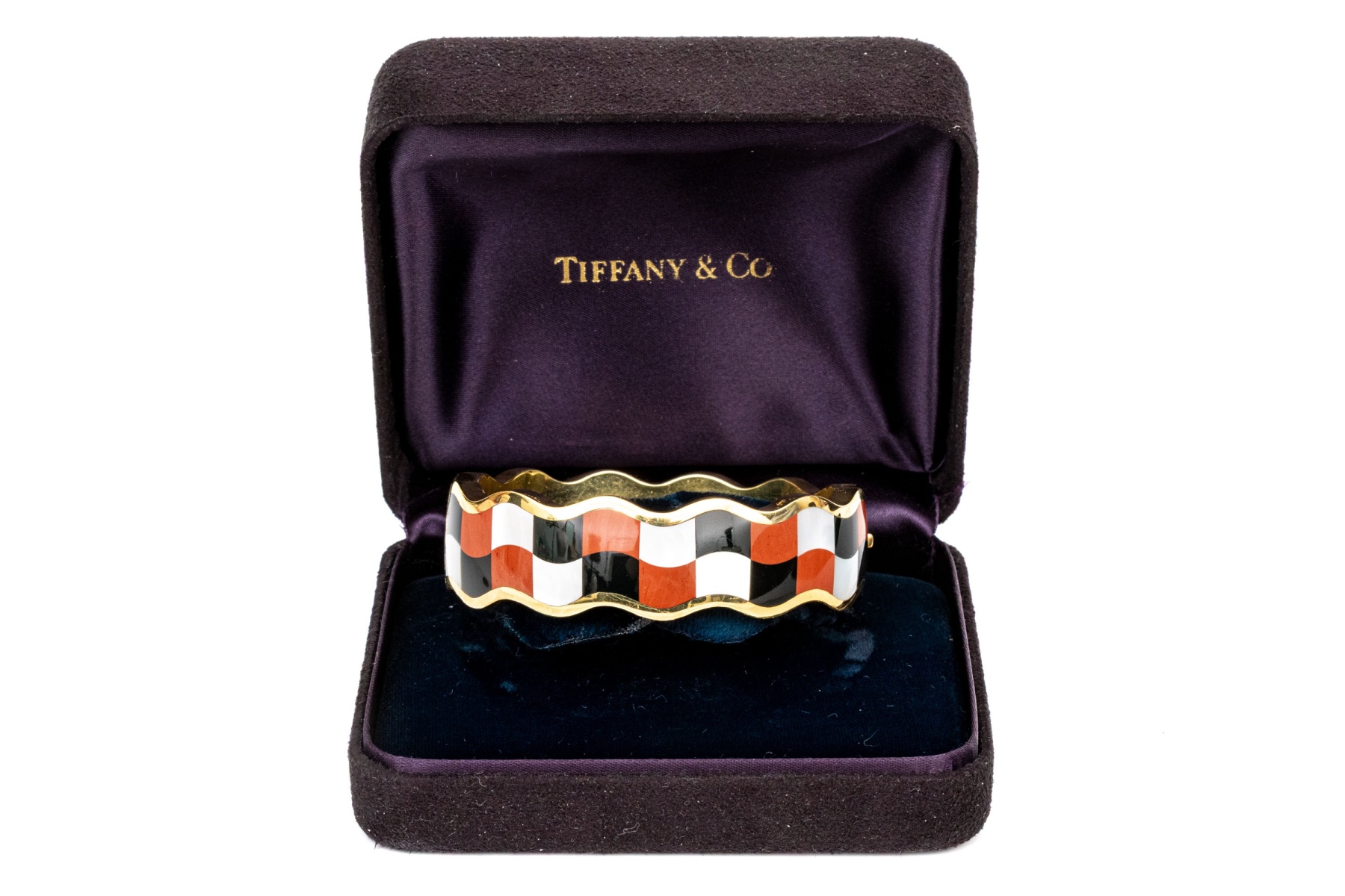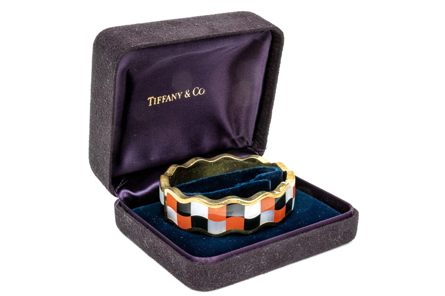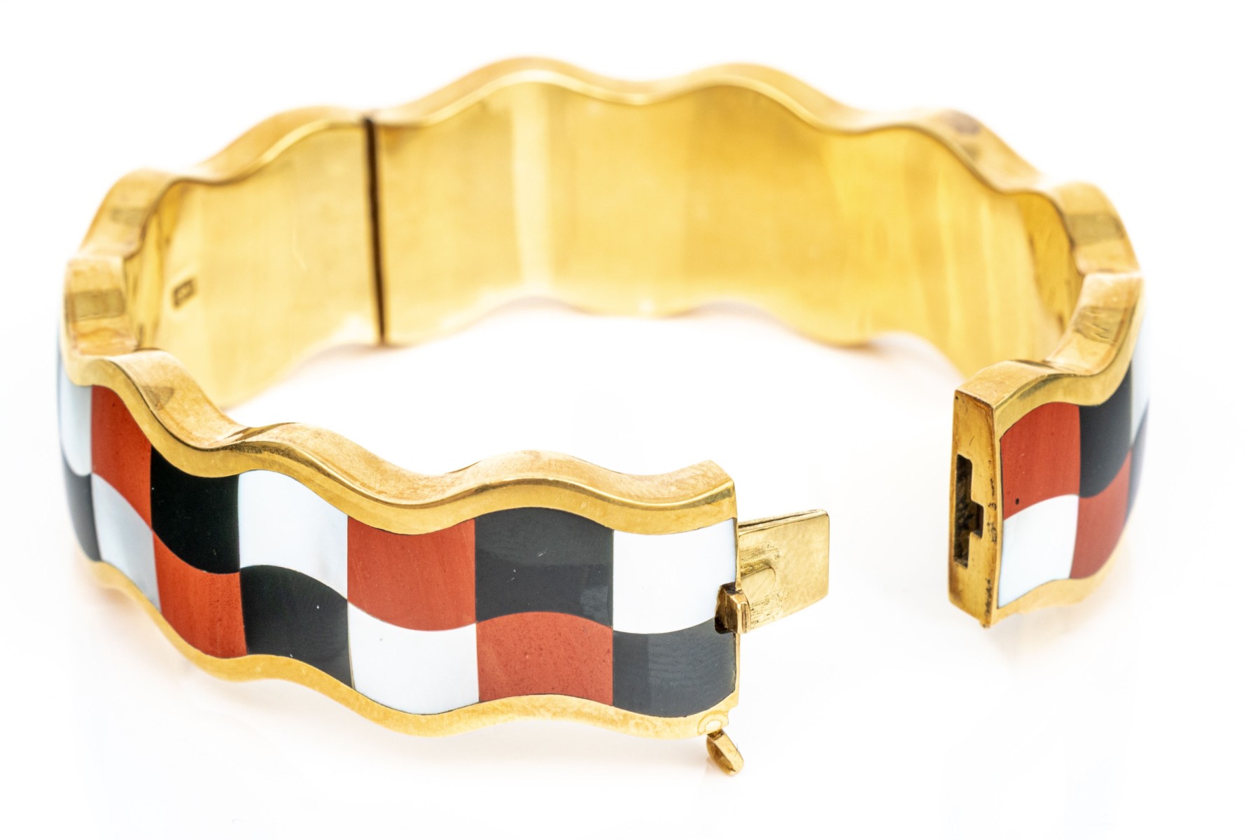 Tiffany & Co. 18k yellow gold Angela Cummings wonderful inlaid wave bangle bracelet. This emblematic hinged bracelet features a checkerboard inlay of rust color jasper, black onyx and mother-of-pearl tiles, juxtaposed to an organic wave border and finished with a discreet push button clasp and diminutve safety clasp.