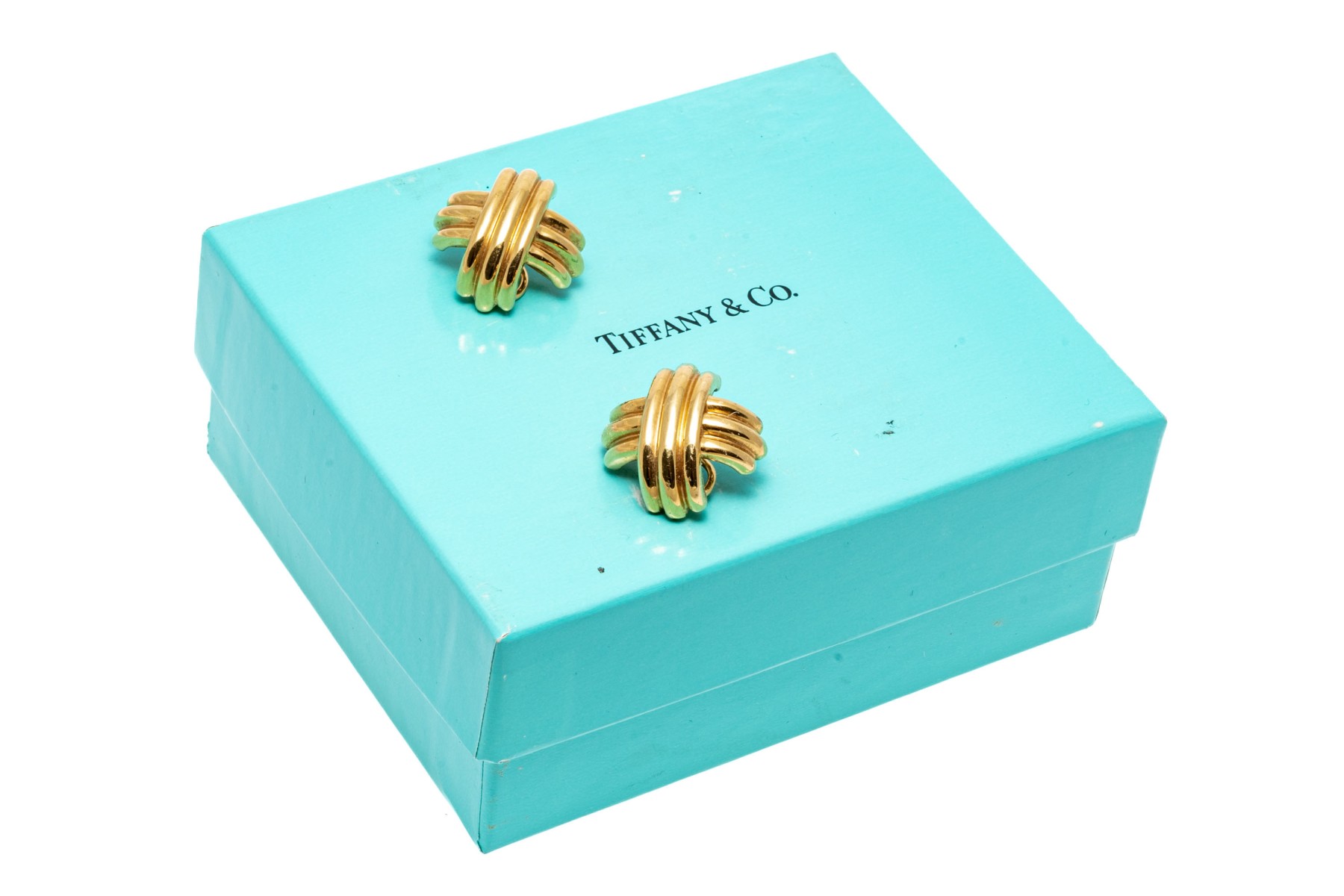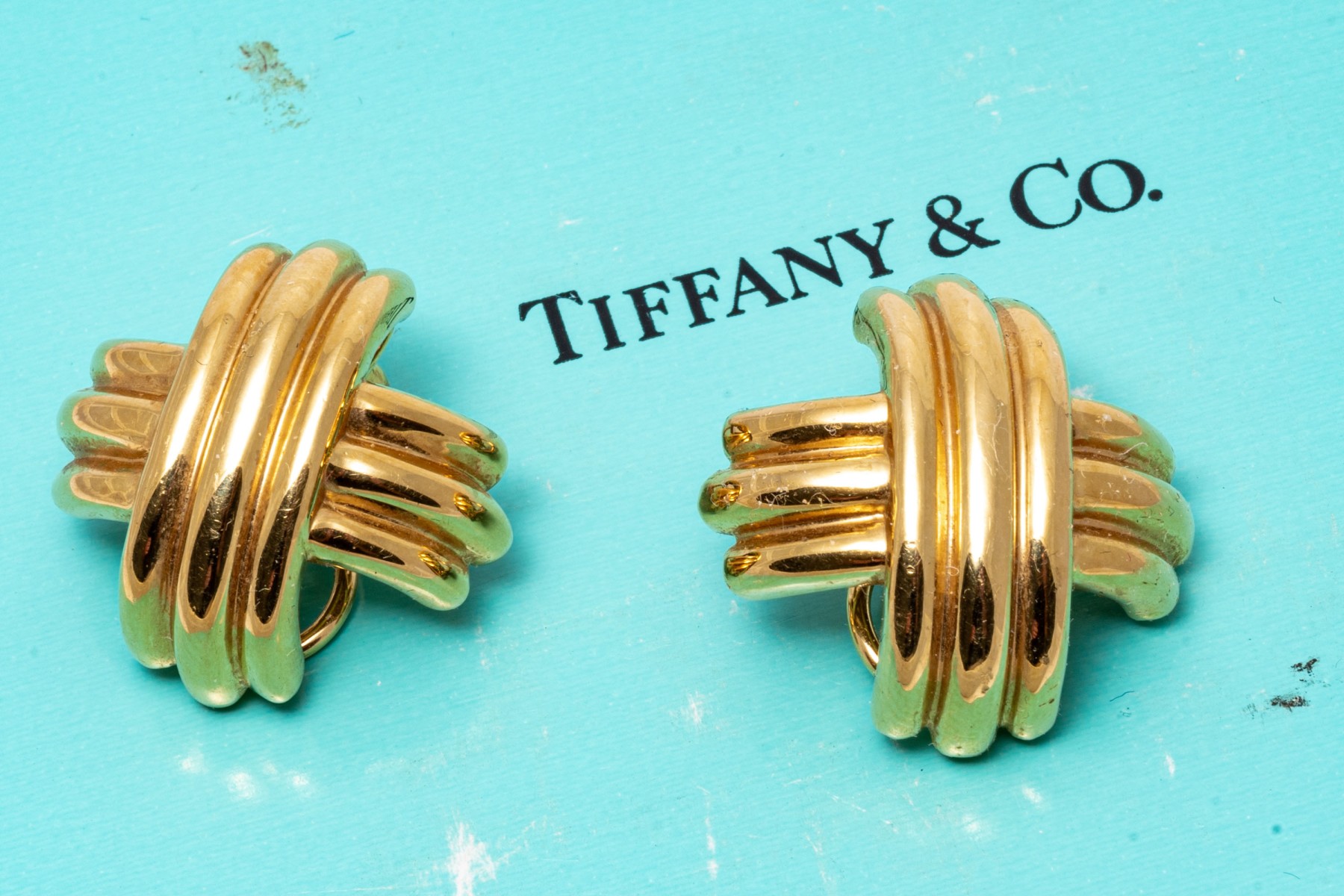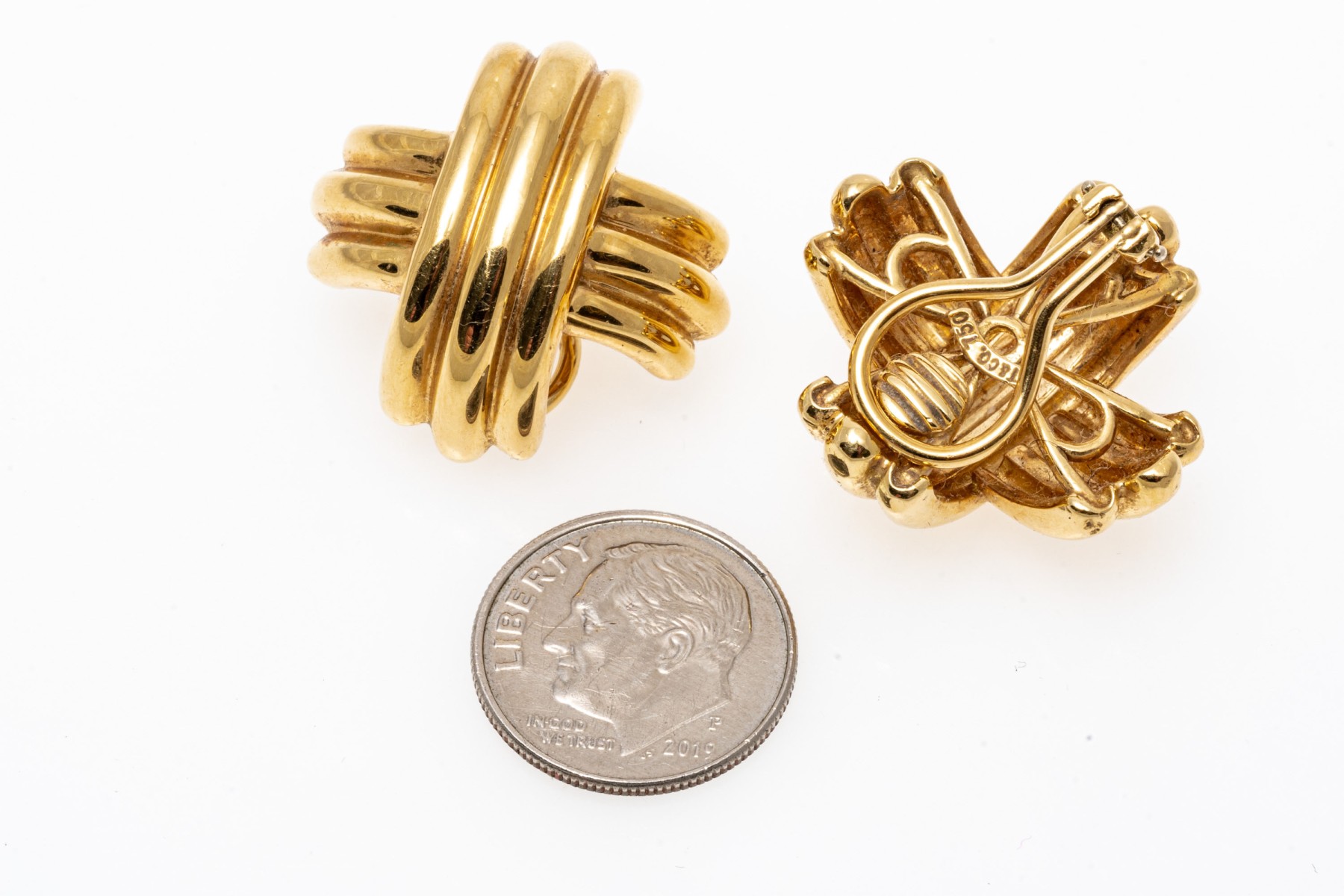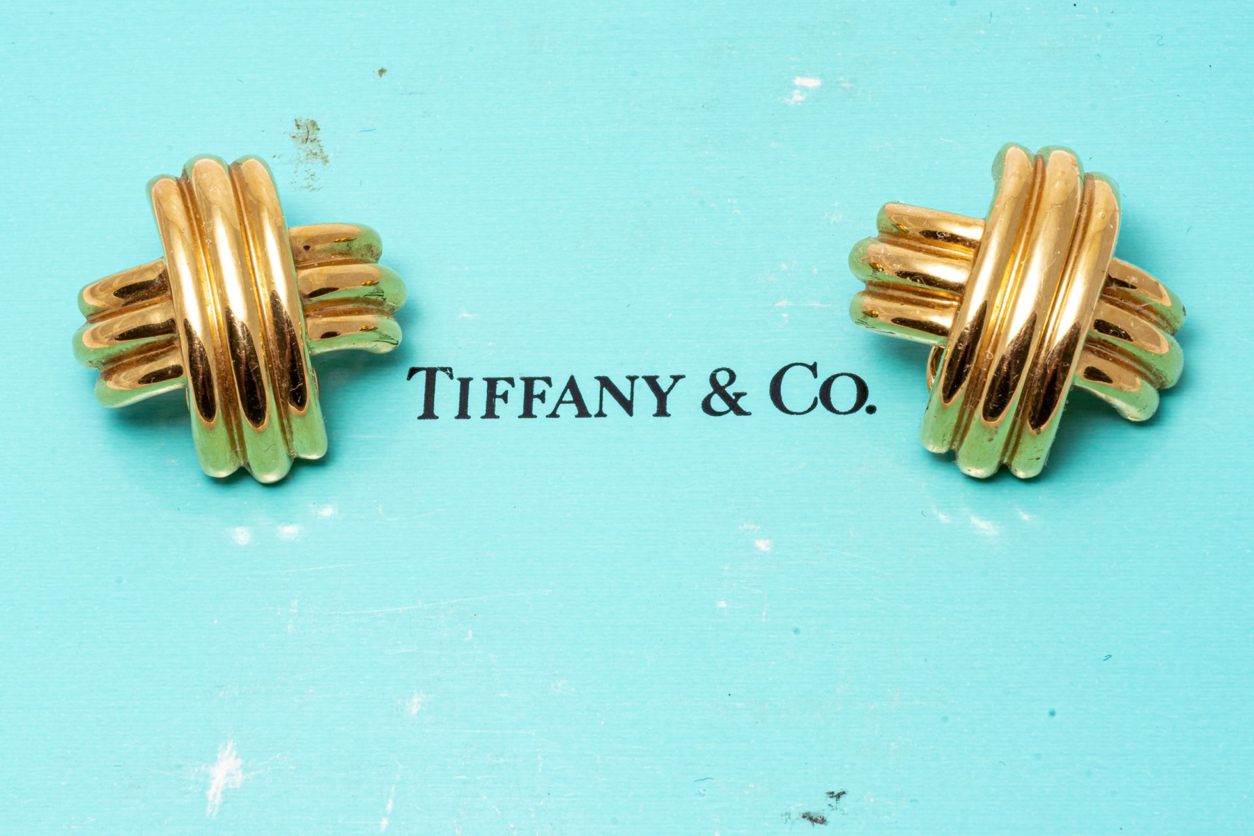 Tiffany & Co. 18k yellow gold classic ribbed "X" style earrings, finished with omega style backs, no posts.. With outer box not original to earrings