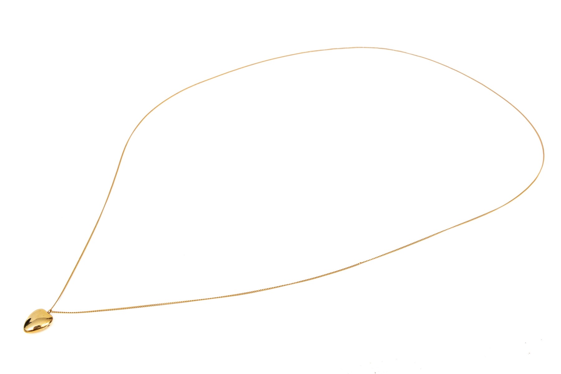 Tiffany & Co. necklace crafted in 18K yellow gold features a sculptural, puffed heart pendant with a polished, mirror-like finish. The organic form is slightly asymmetrical, giving it a modern, fluid look. Suspended from a fine opera length box chain, the pendant is hallmarked on the reverse with “Tiffany & Co.” and gold purity marks and 1980. Complete with the original Tiffany blue pouch. Finished without a clasp, this is an endless strand.