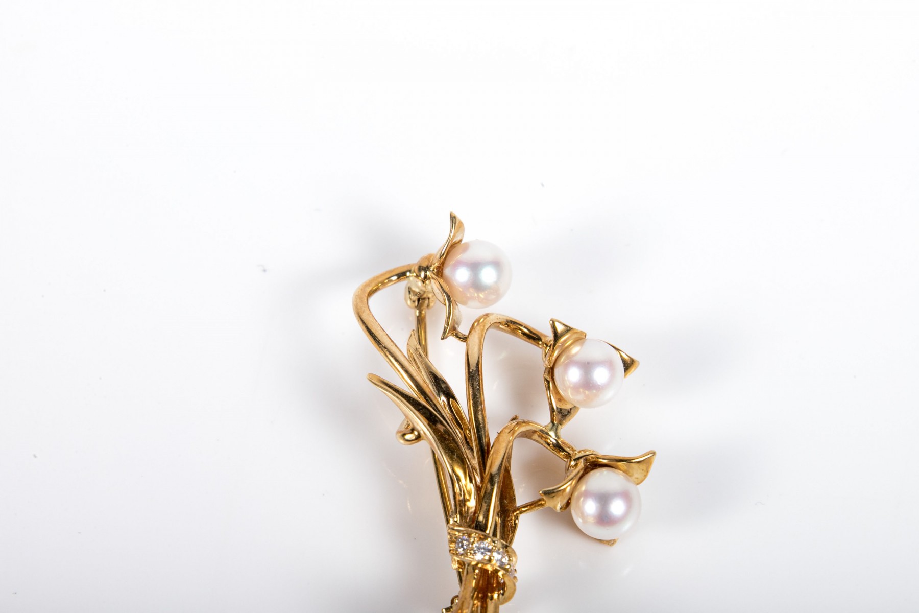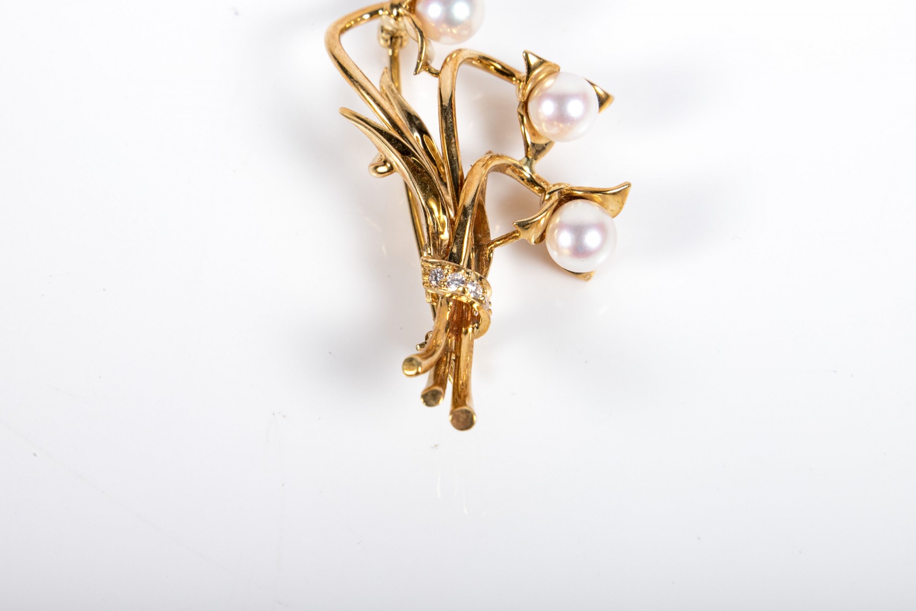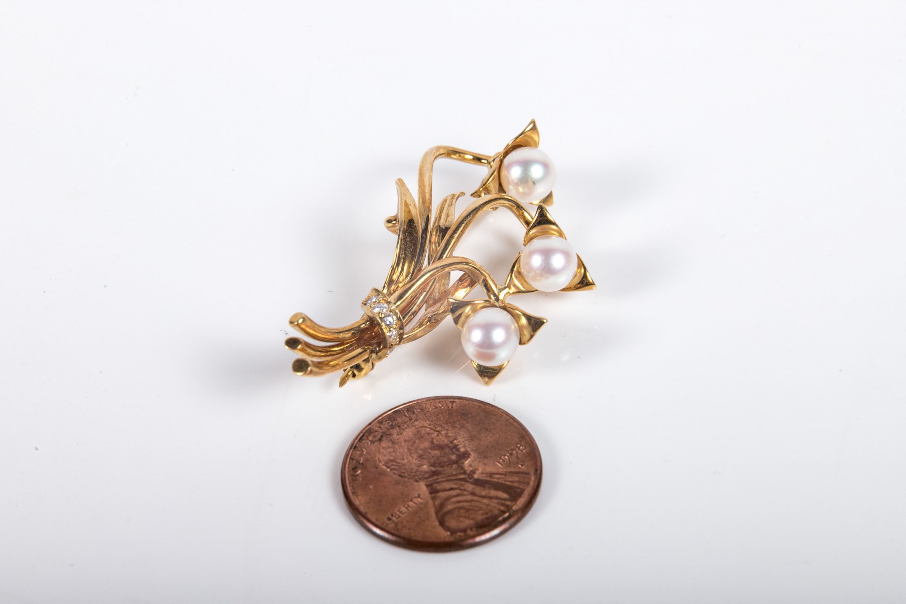 Tiffany & Co. 18K yellow gold, diamond and cultured pearl brooch. Depicting three long stemmed flowers with cultured pearl buds wrapped in a diamond encrusted ribbon at the center. With bar pin. Marked "T & Co." and "750" on the reverse.