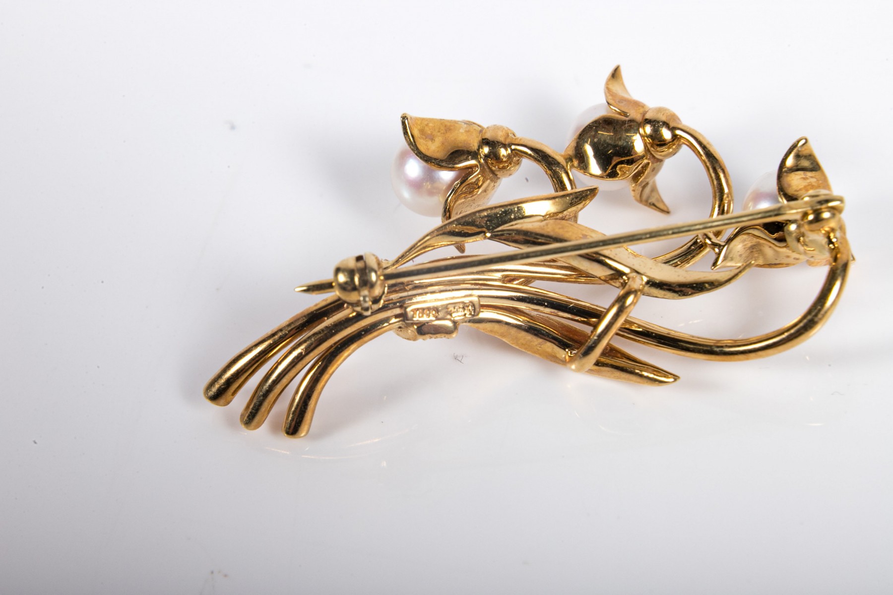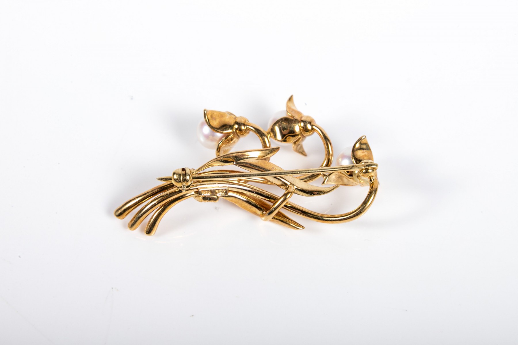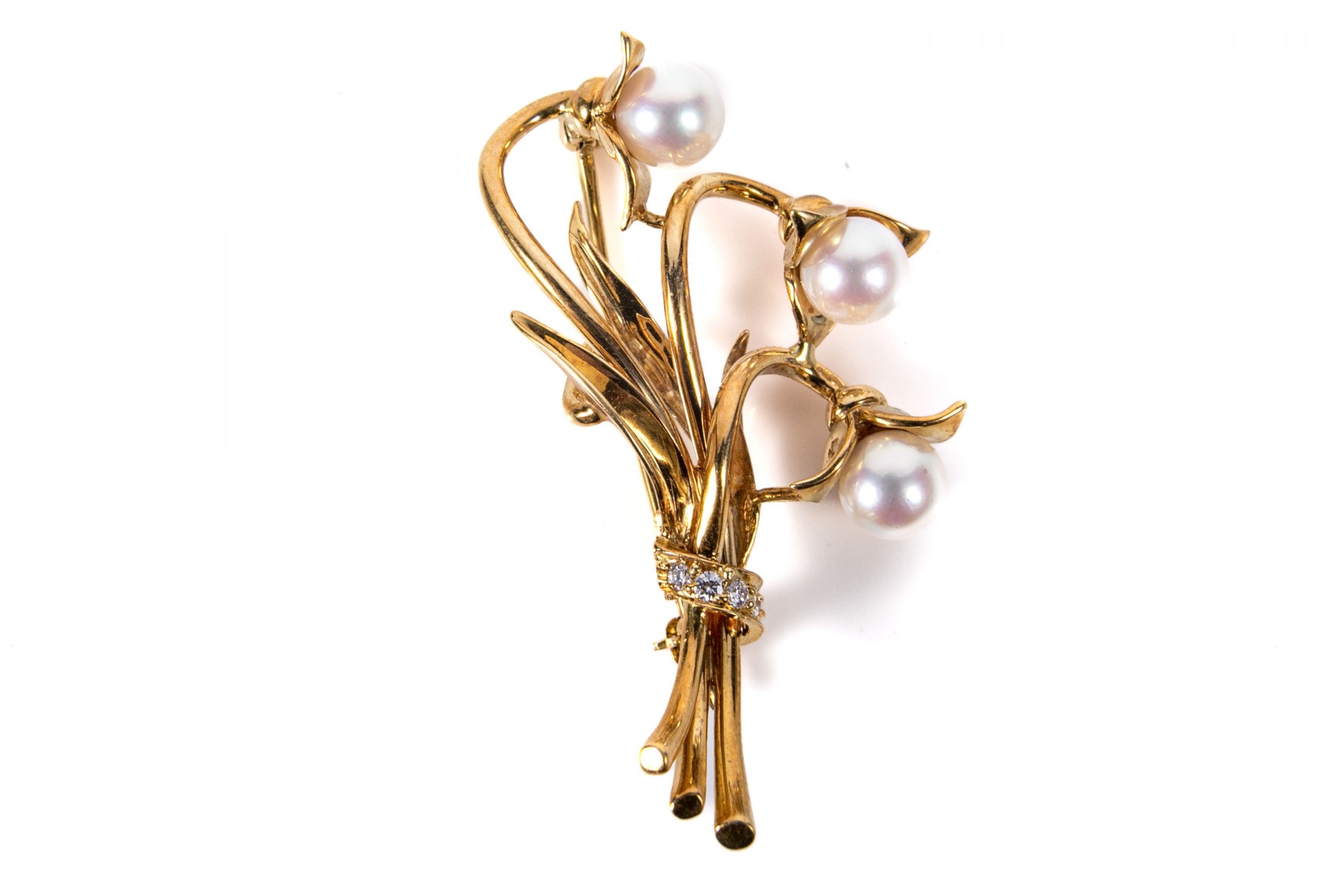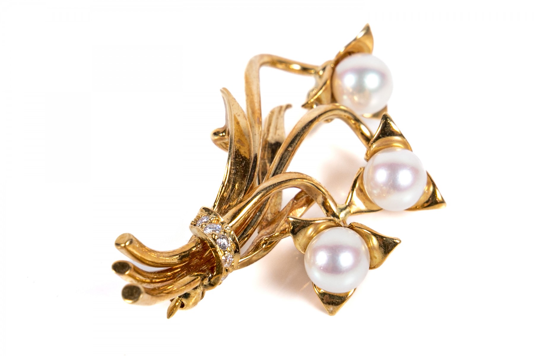 Tiffany & Co. 18K yellow gold, diamond and cultured pearl brooch. Depicting three long stemmed flowers with cultured pearl buds wrapped in a diamond encrusted ribbon at the center. With bar pin. Marked "T & Co." and "750" on the reverse.