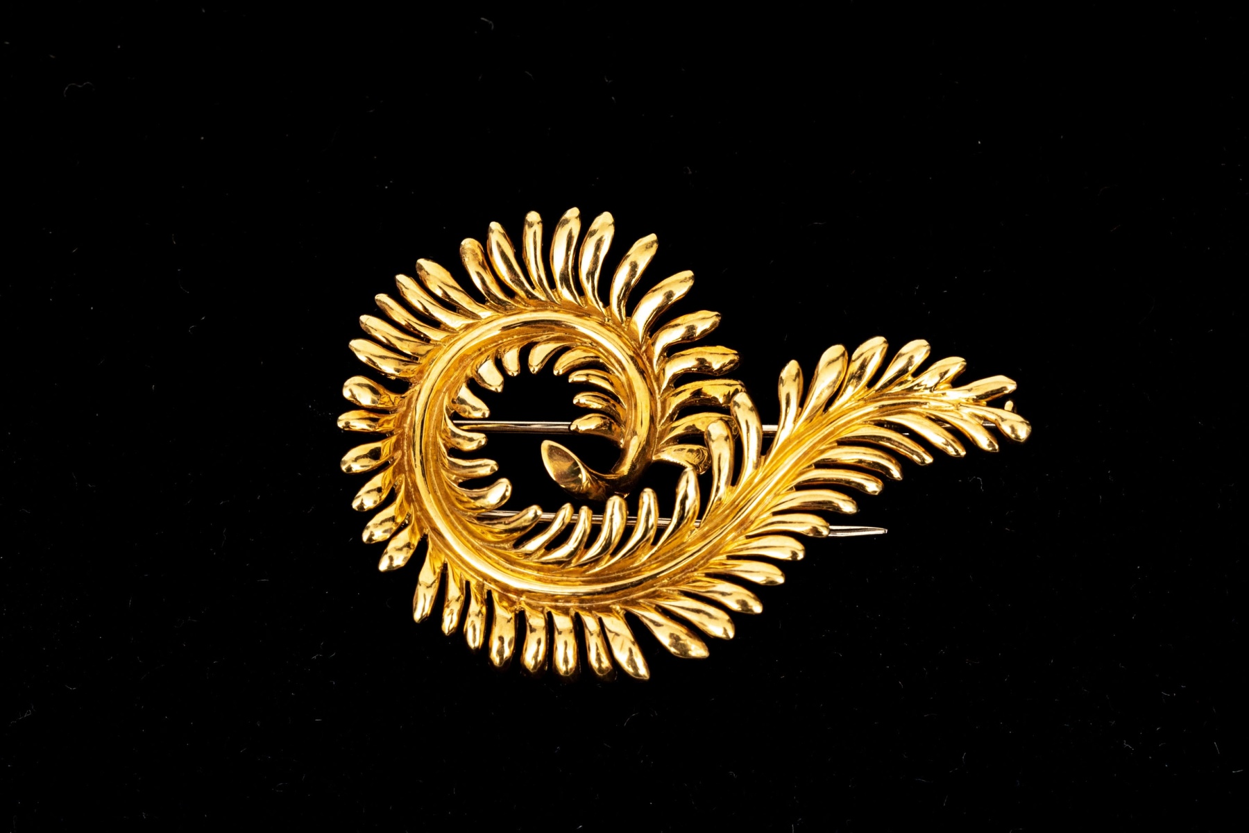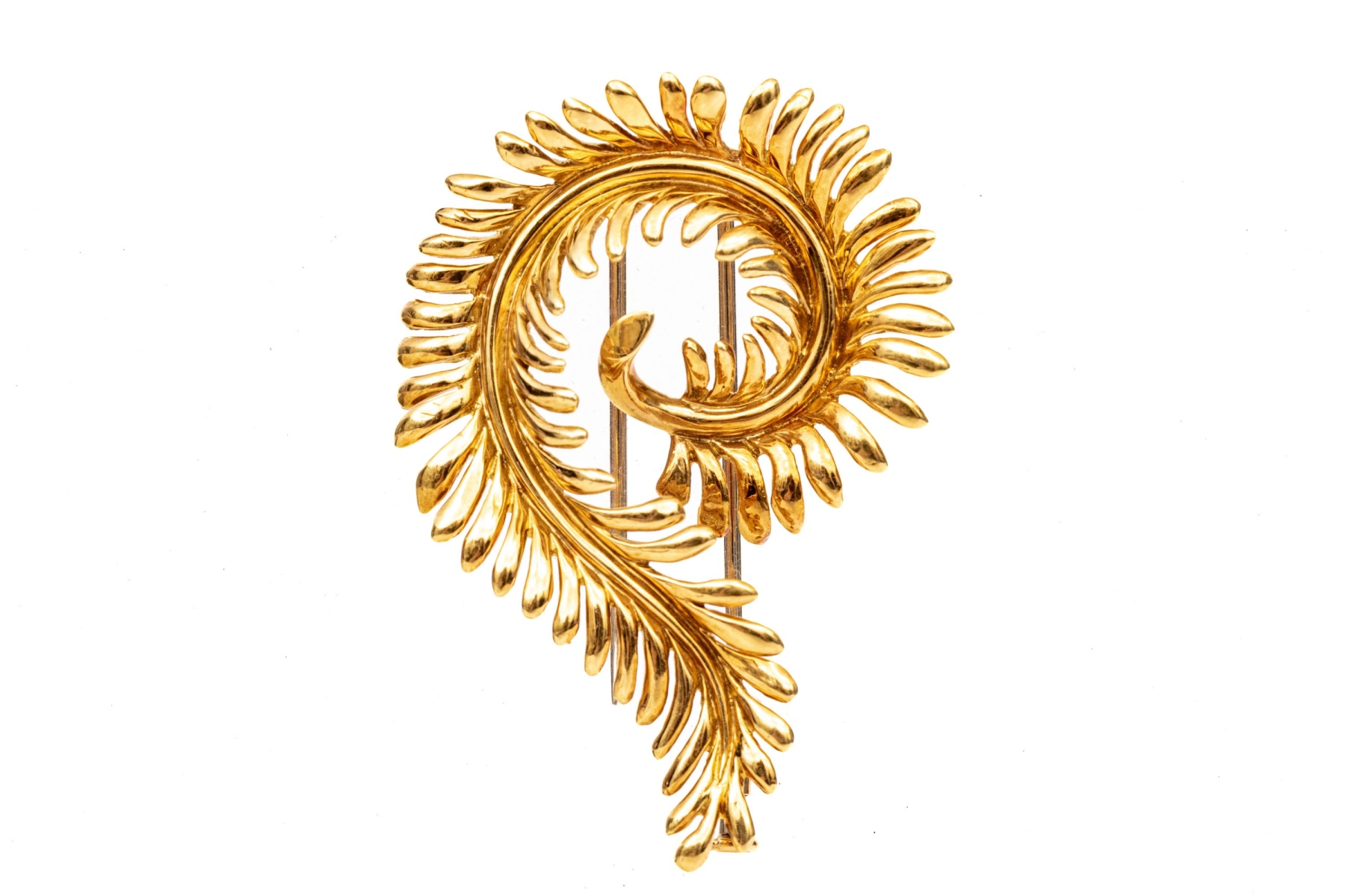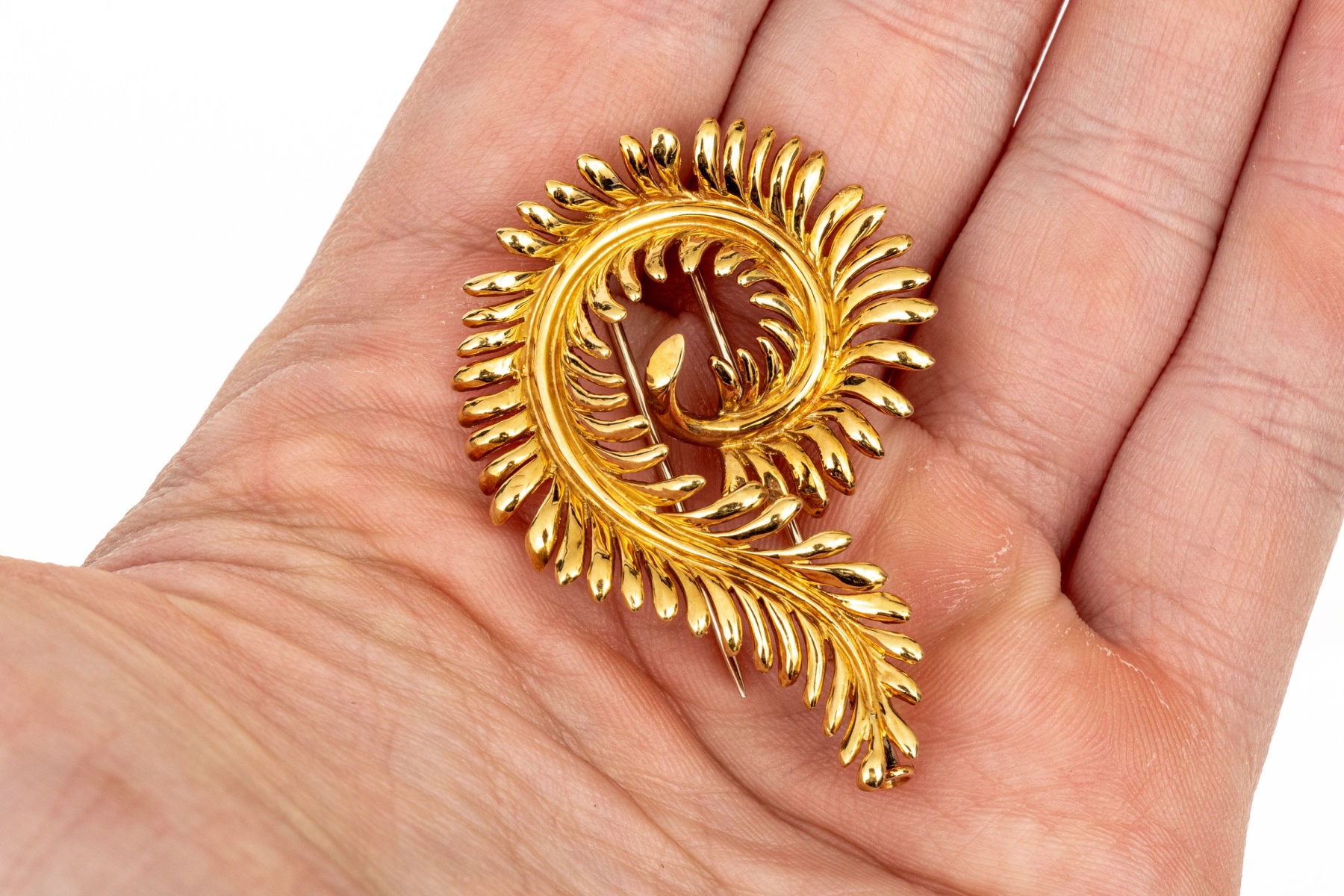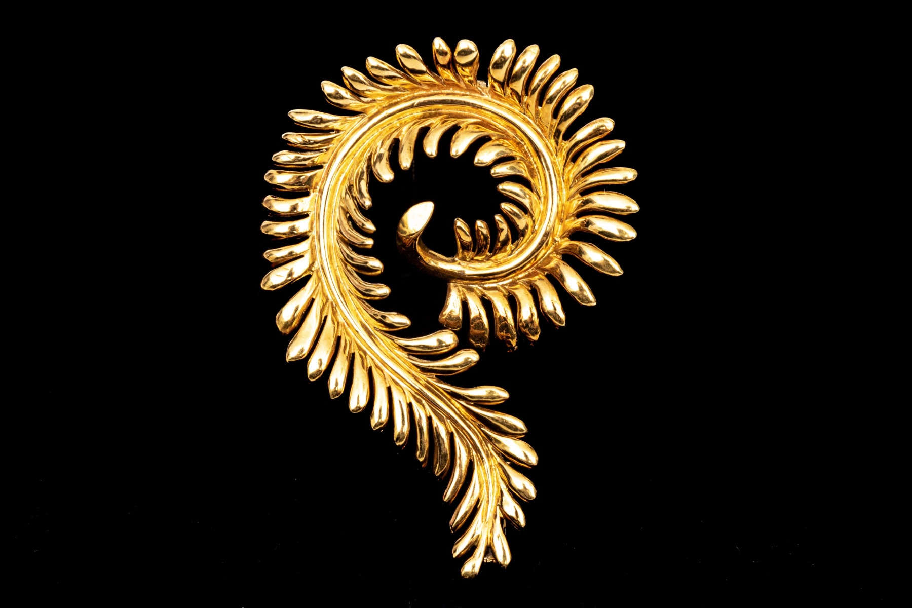Tiffany & Co. 18k yellow gold Schlumberger magnificent stylized furling feather brooch. This fabulous brooch takes inspiration from the question mark, studded with rounded, high polished tendrils and finished with a double pronged brooch closure.