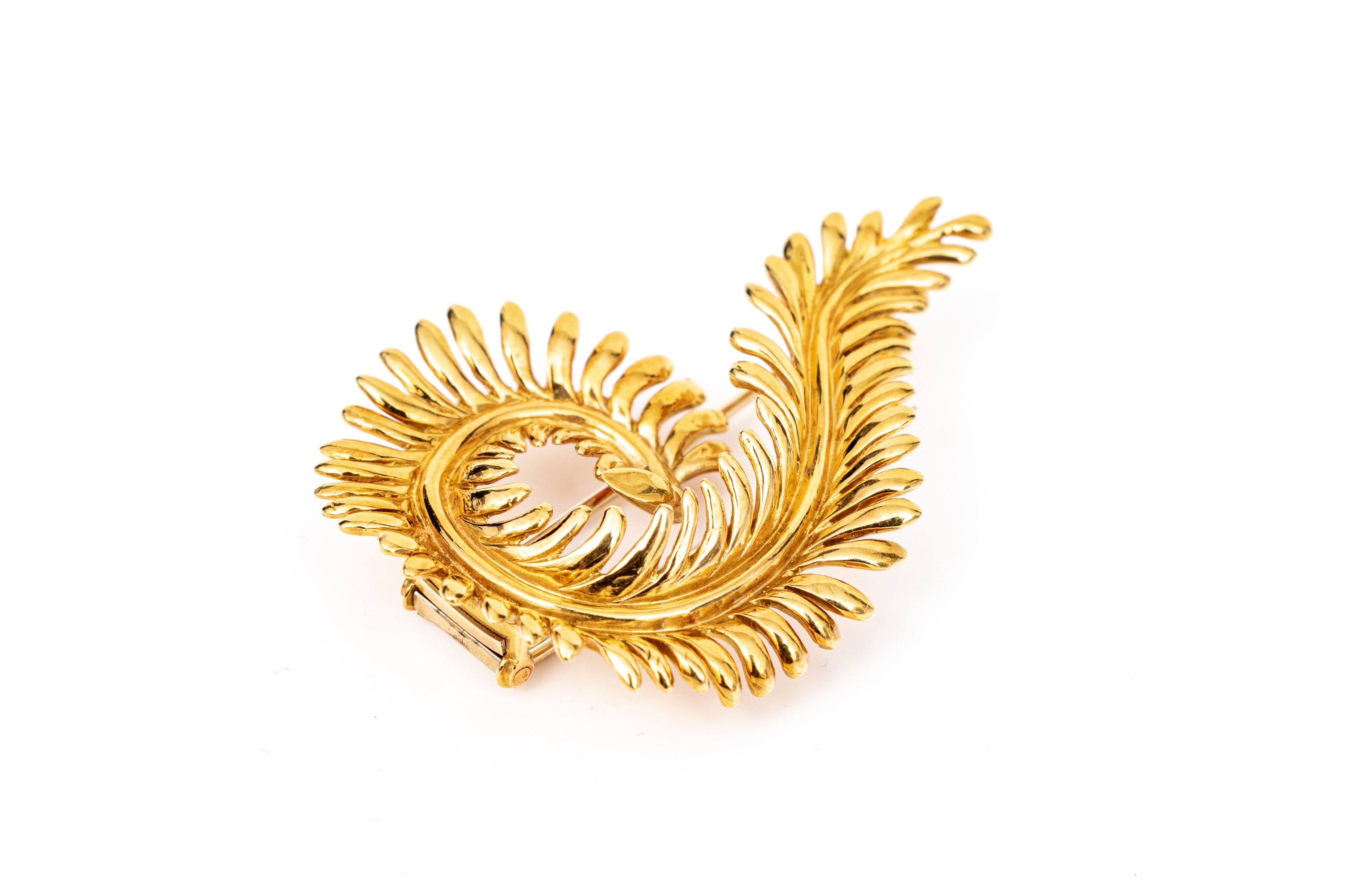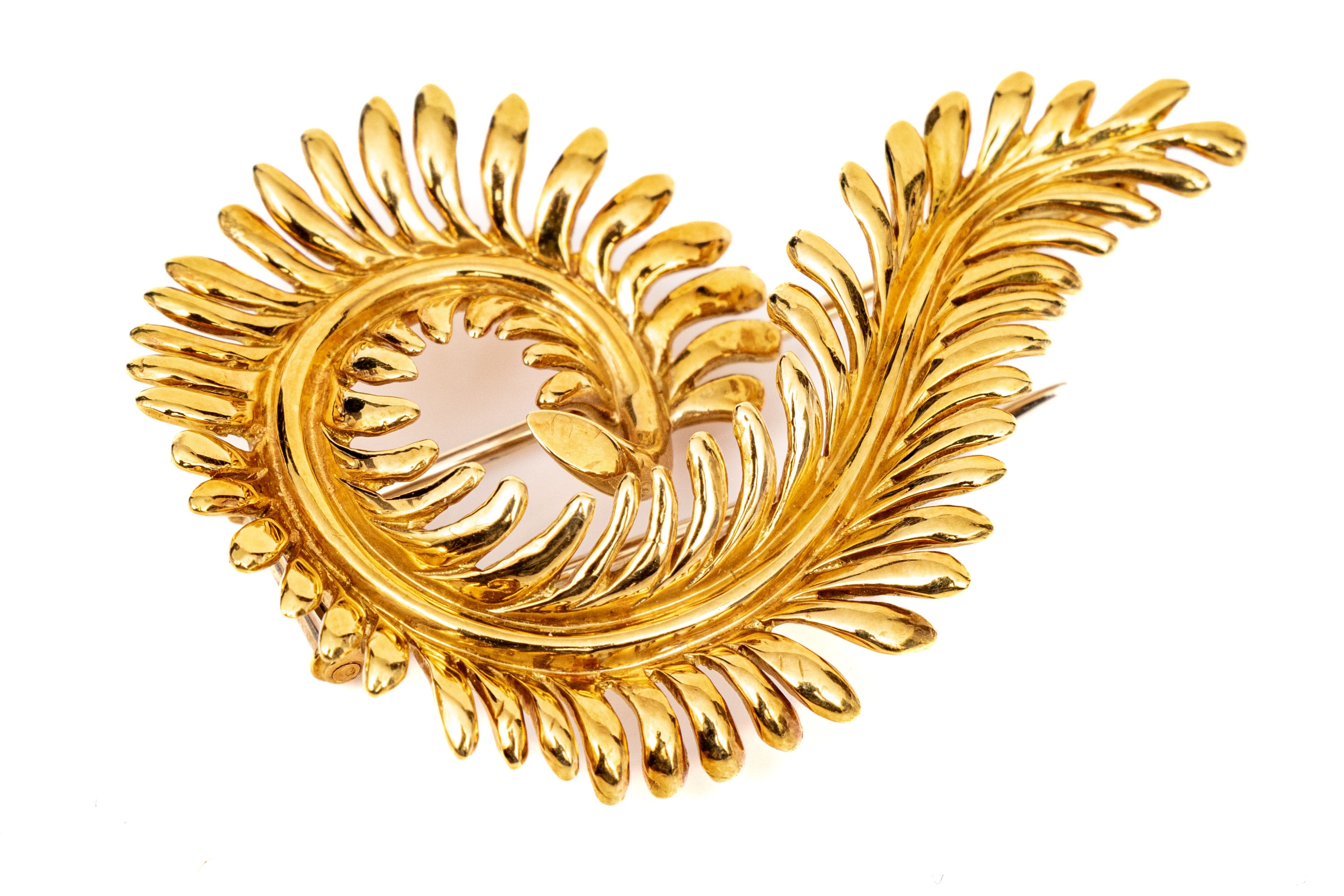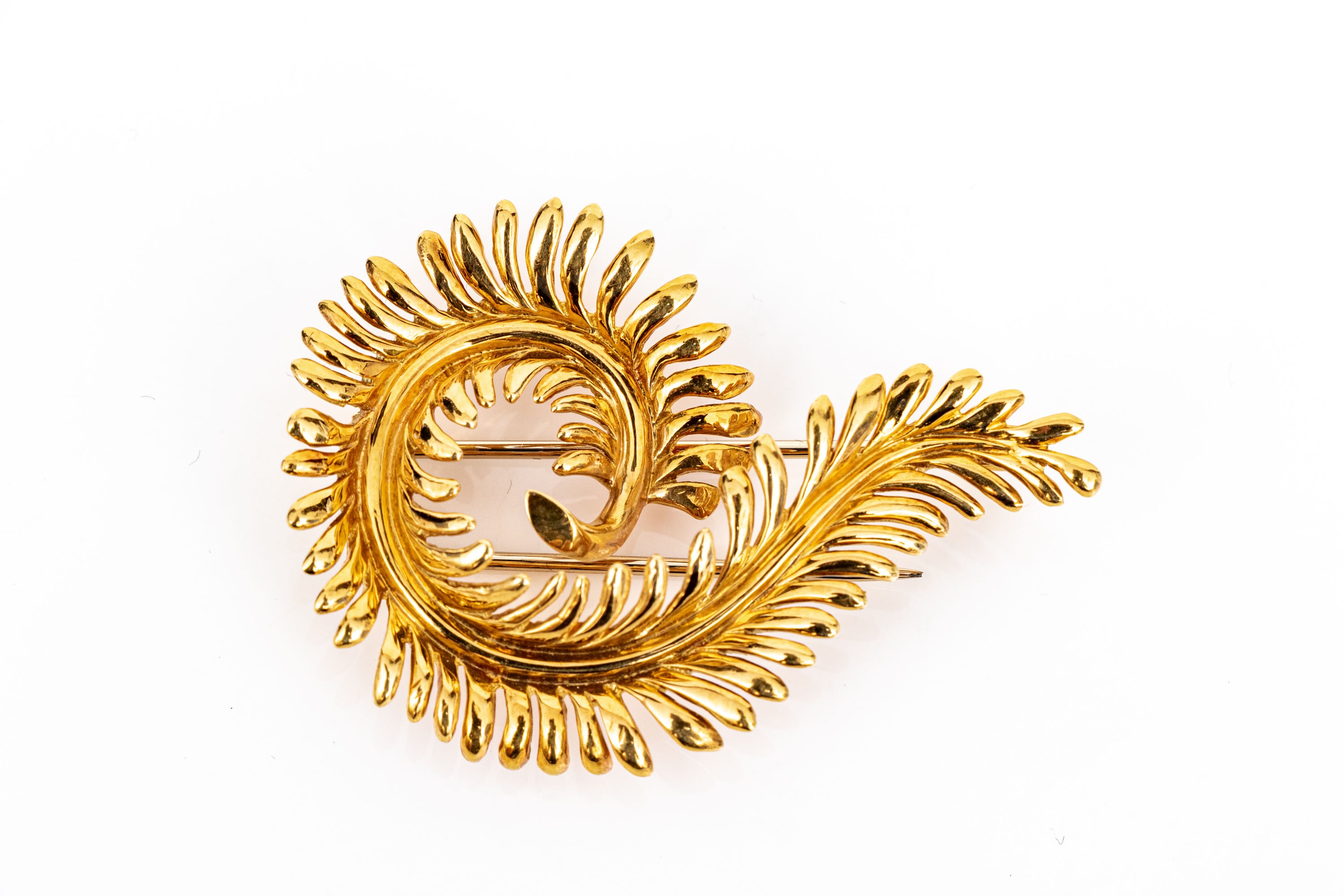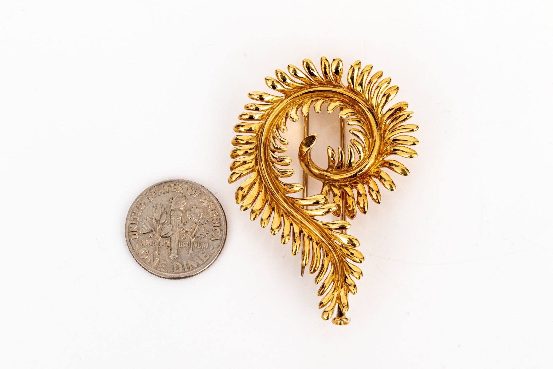 Tiffany & Co. 18k yellow gold Schlumberger magnificent stylized furling feather brooch. This fabulous brooch takes inspiration from the question mark, studded with rounded, high polished tendrils and finished with a double pronged brooch closure.