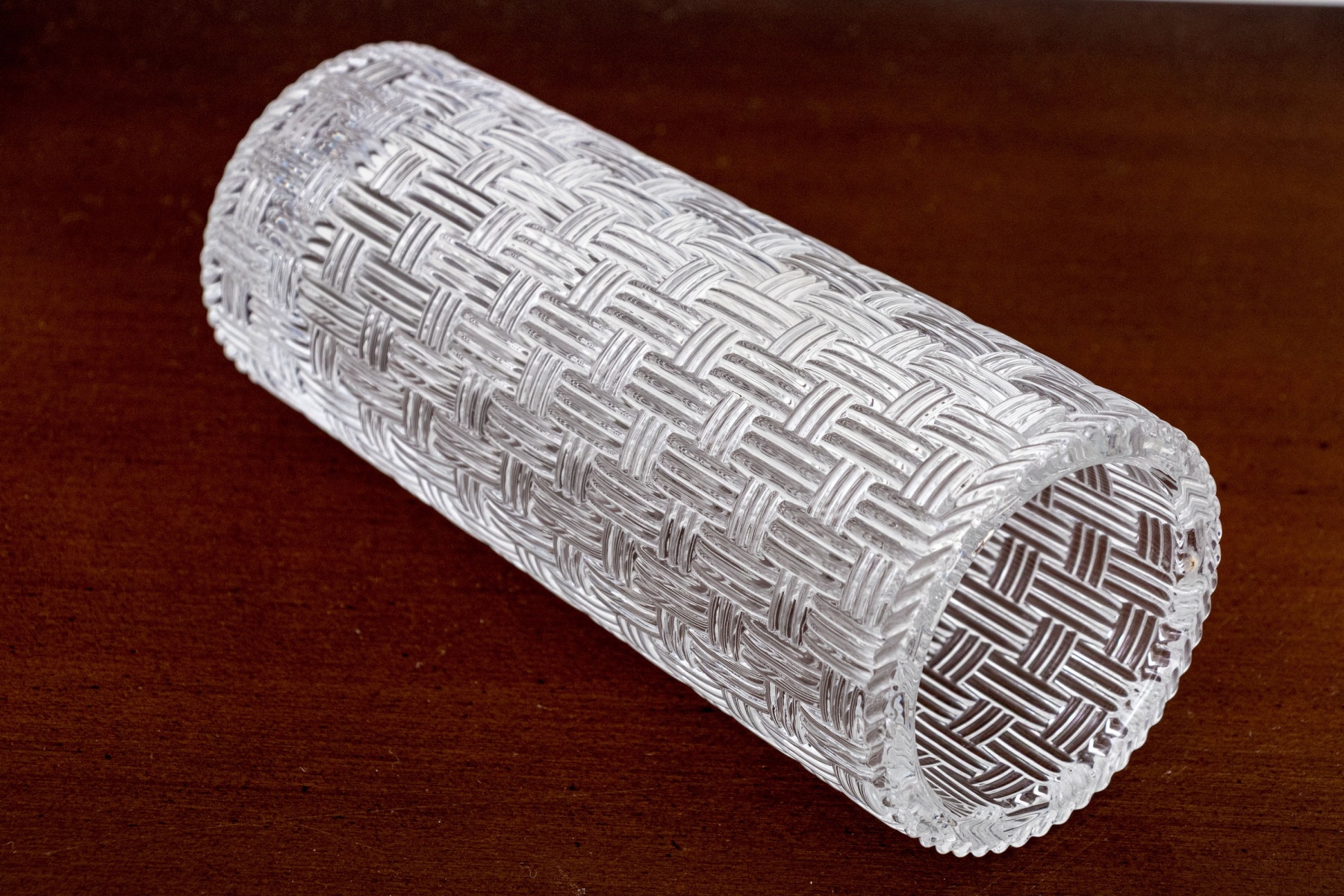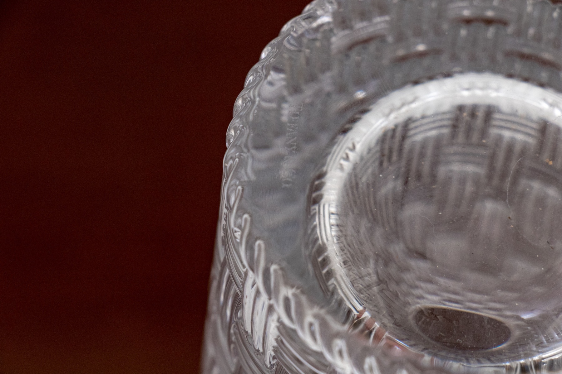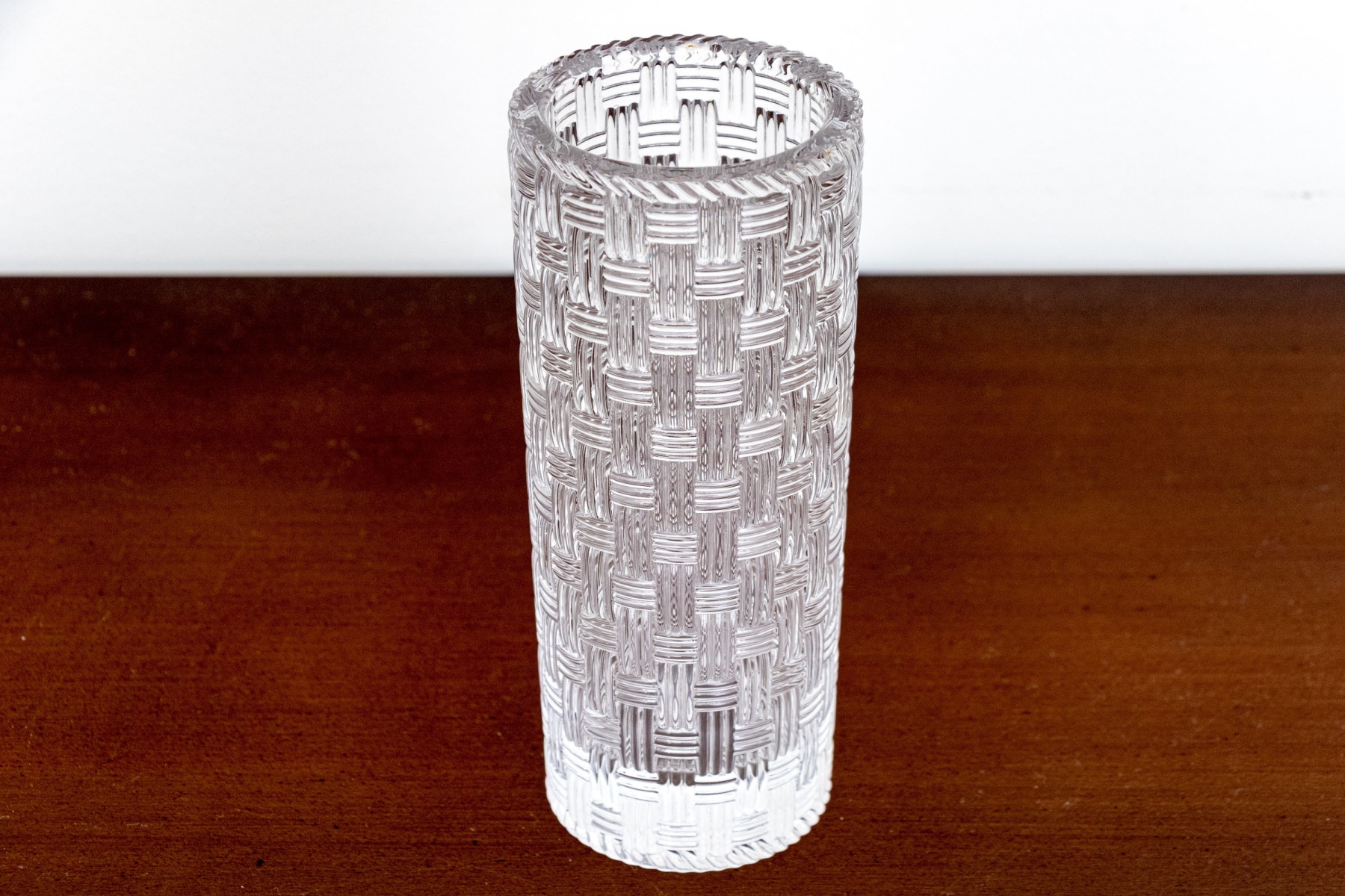 A high quality Tiffany & Co. crystal vase in cylindrical form with a "Basket Weave" motif to the exterior lending wonderful texture. Faintly marked underfoot.
