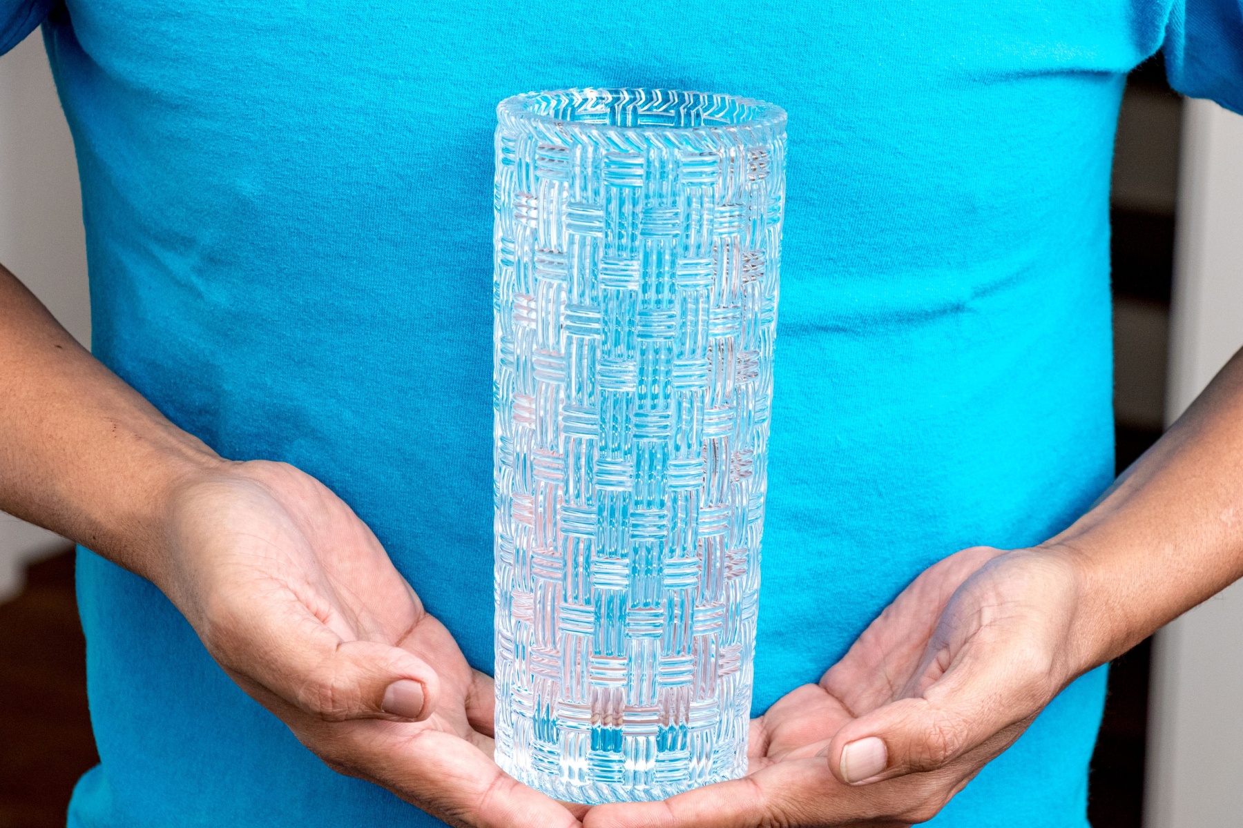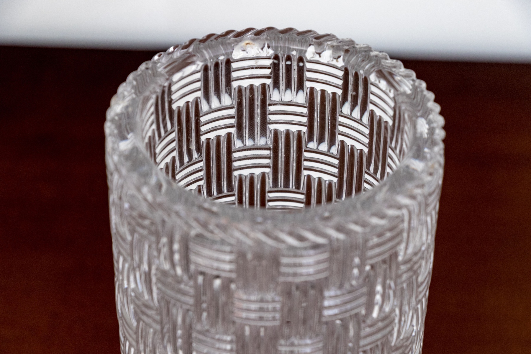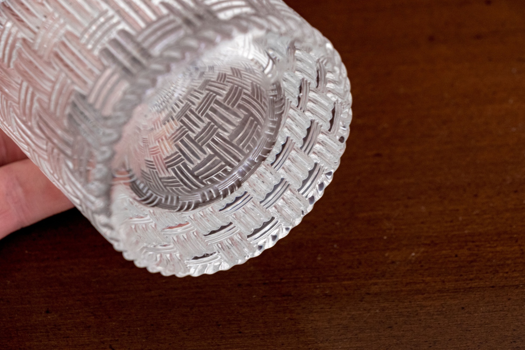 A high quality Tiffany & Co. crystal vase in cylindrical form with a "Basket Weave" motif to the exterior lending wonderful texture. Faintly marked underfoot.