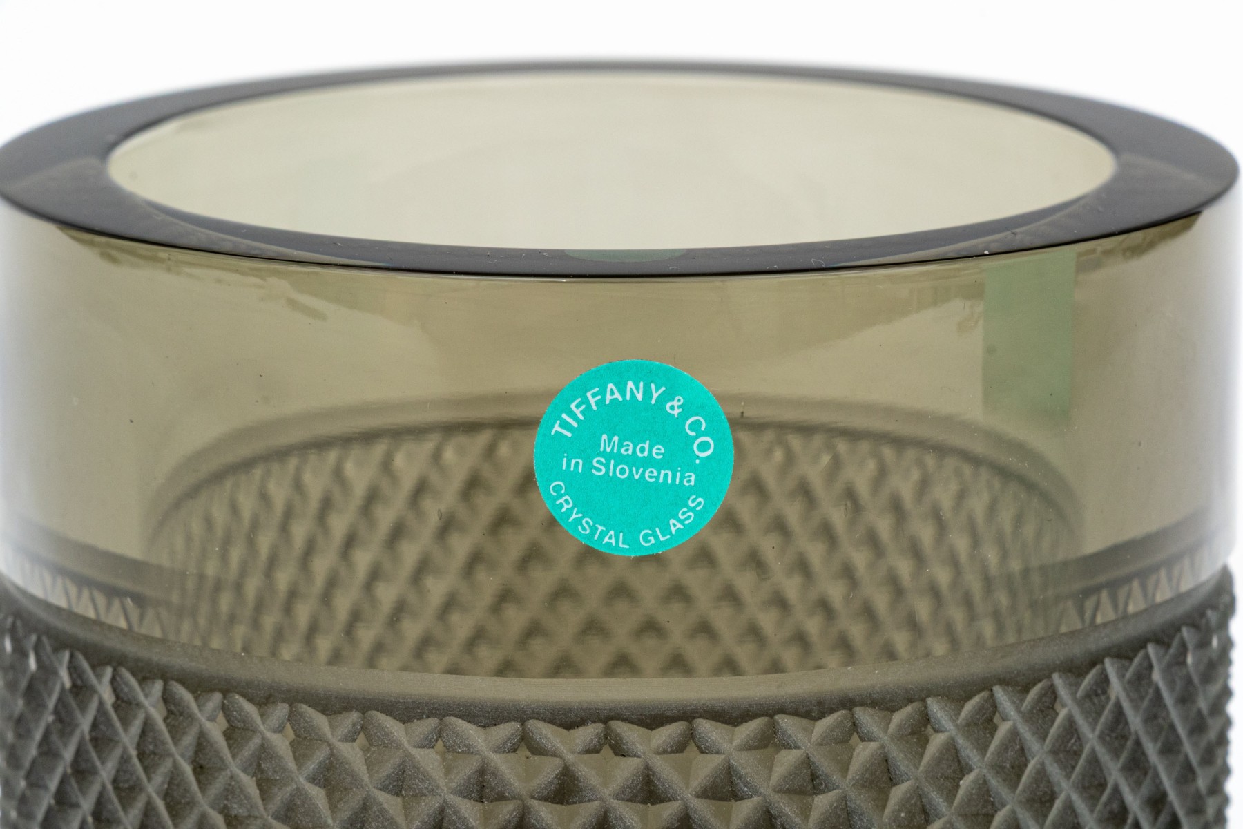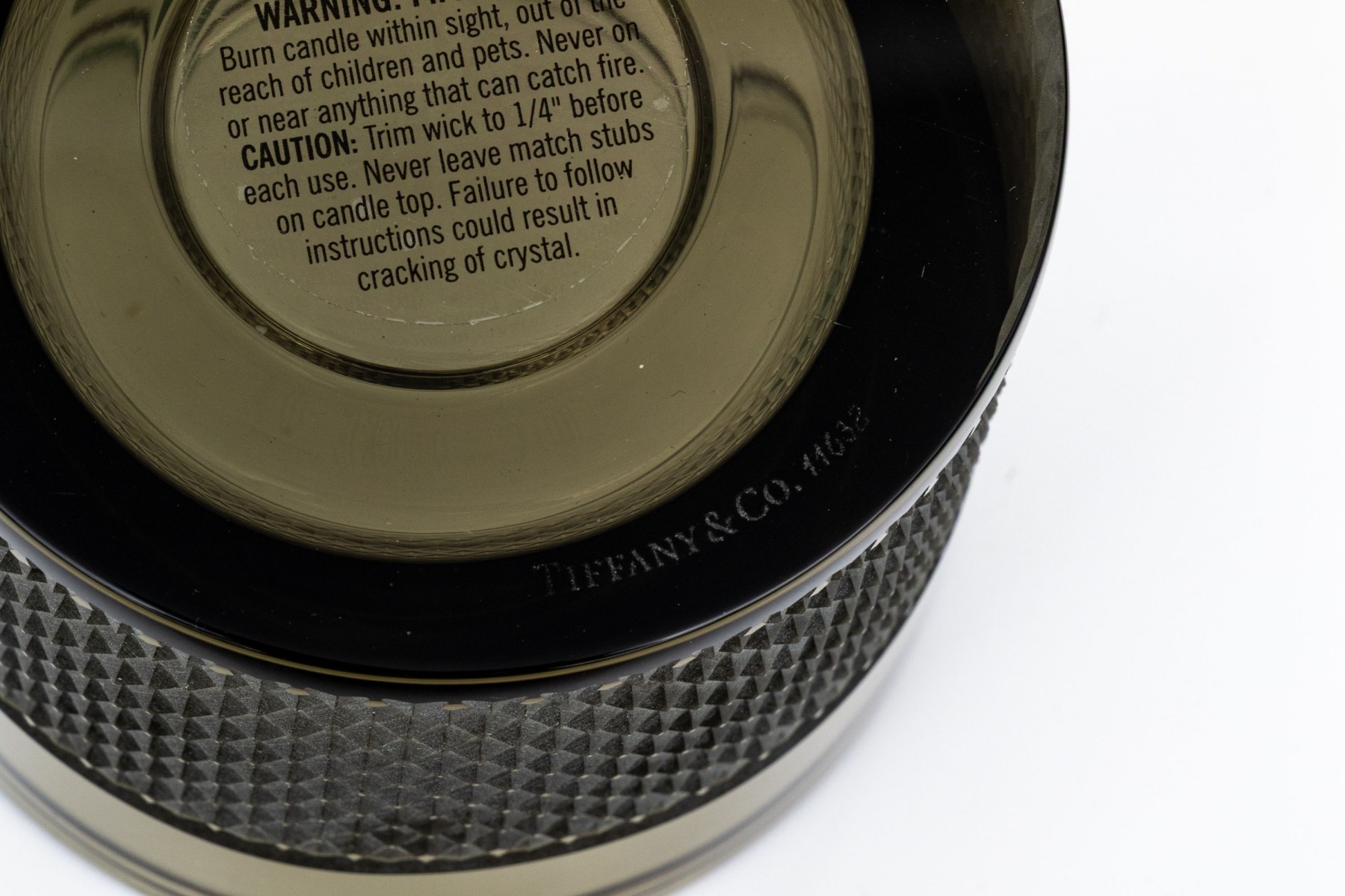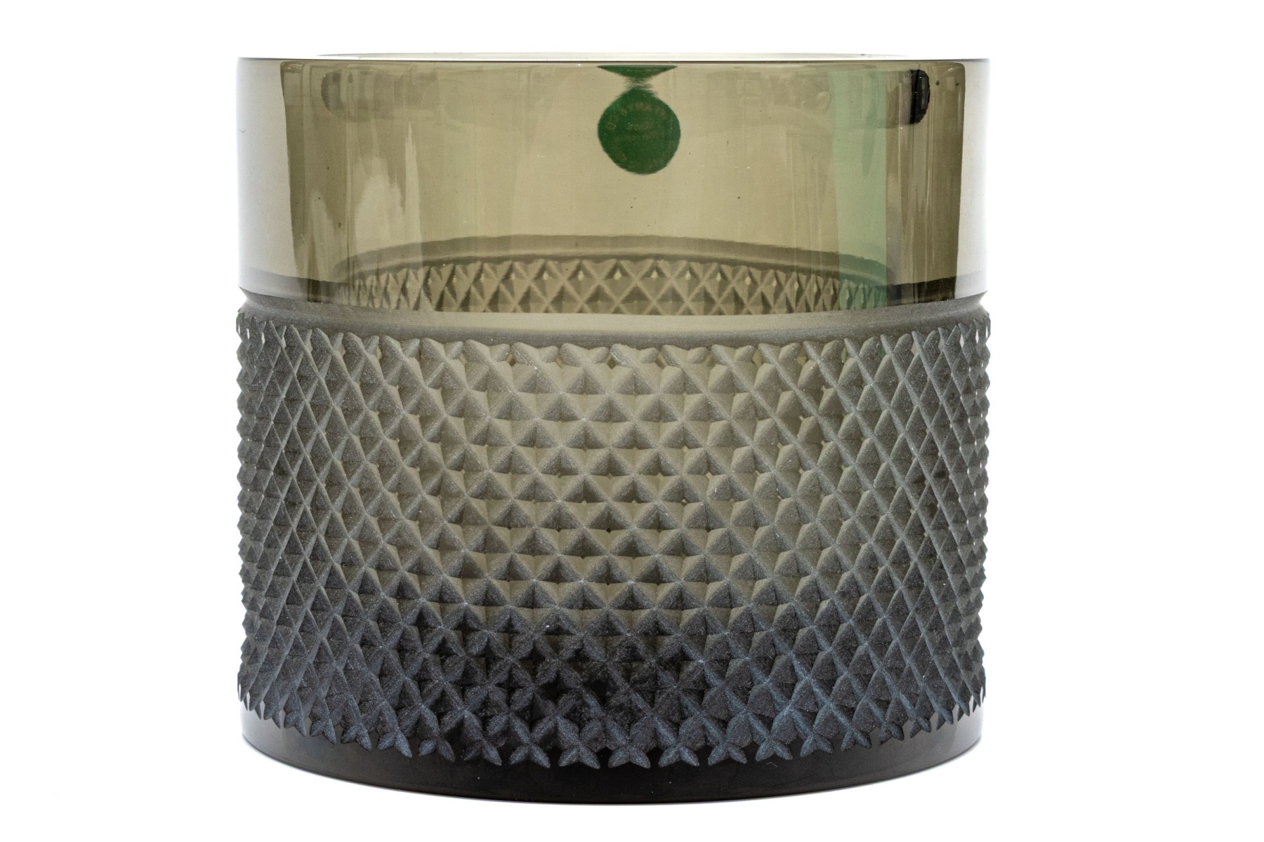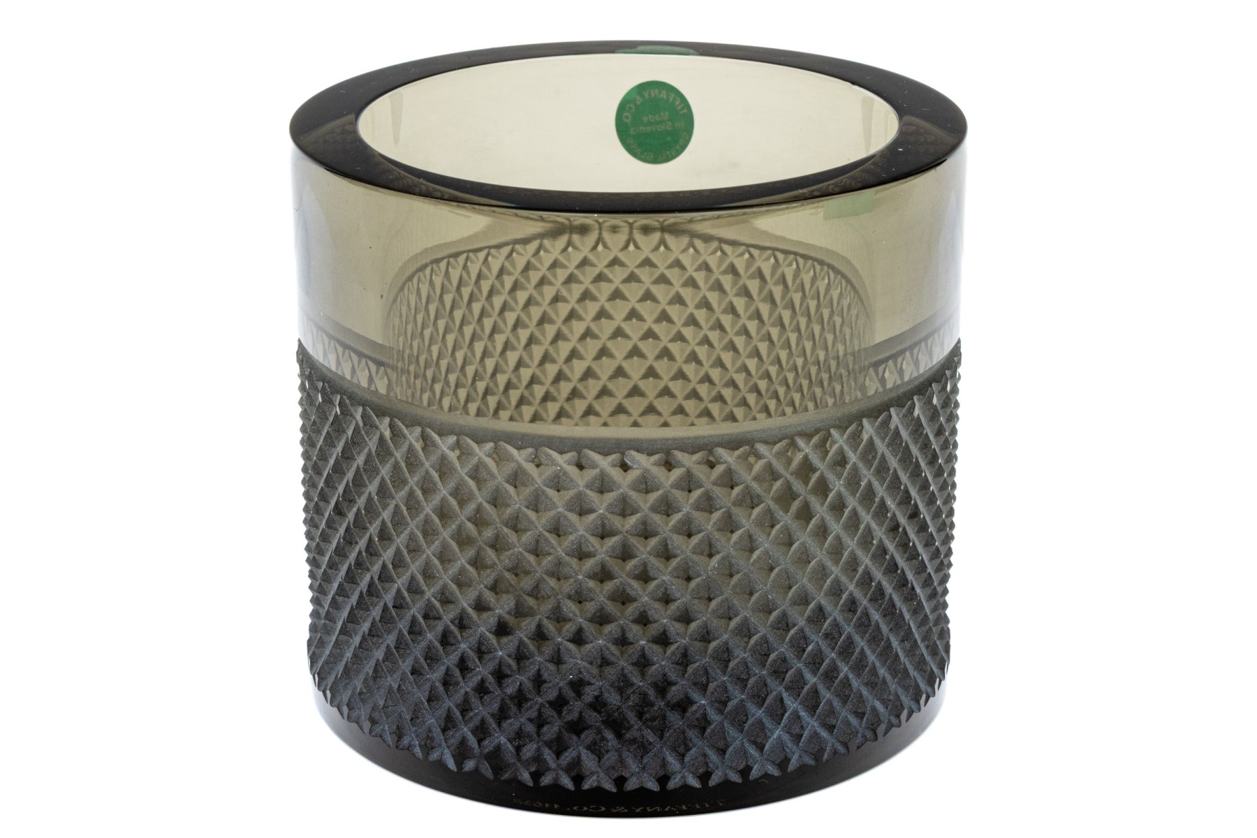 A smoky crystal pillar candle holder with a textured gray tone lower side. With the original sticker, made in Slovenia. Presented in the iconic blue box.