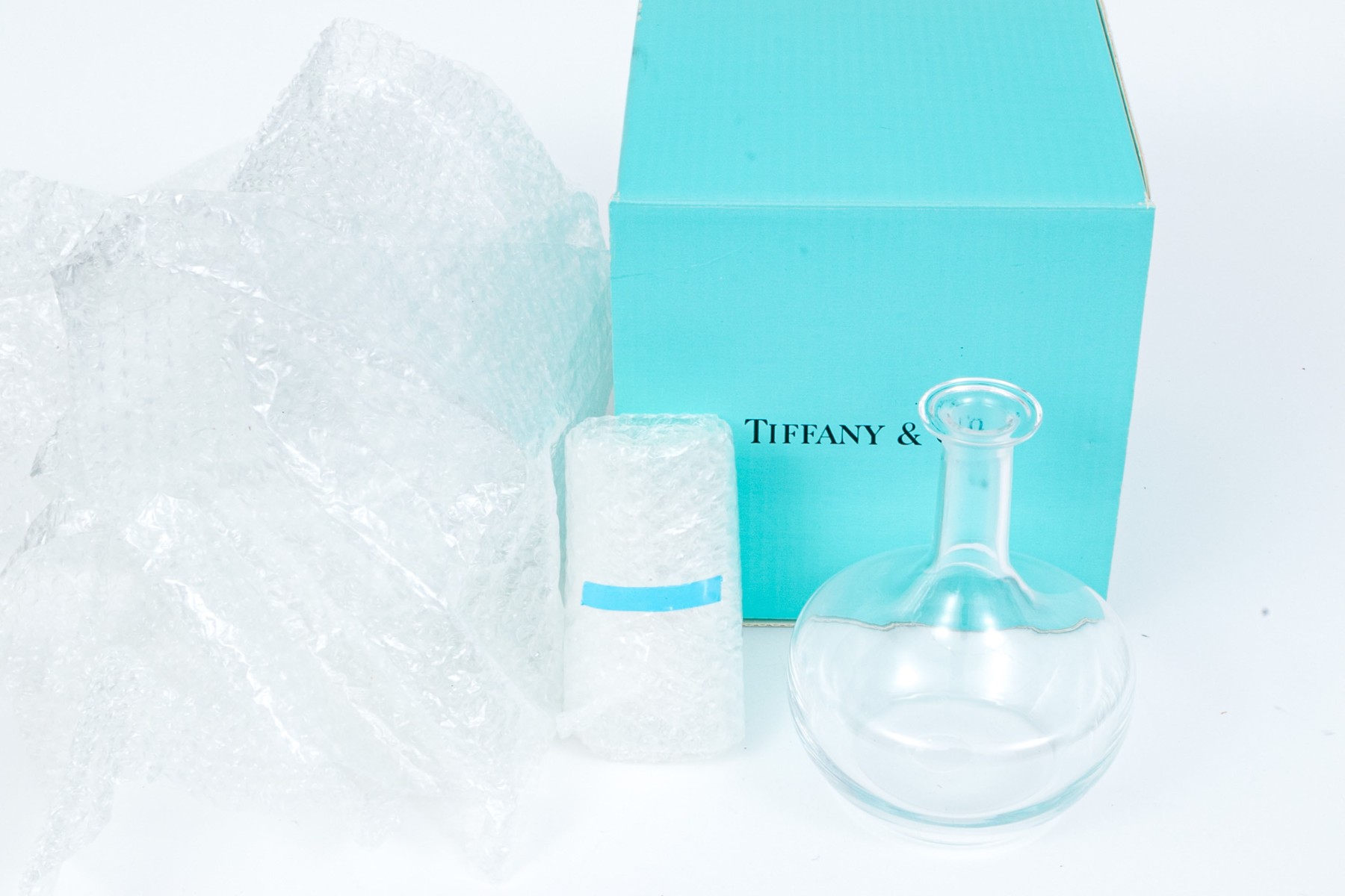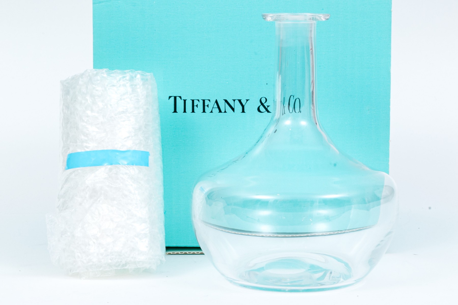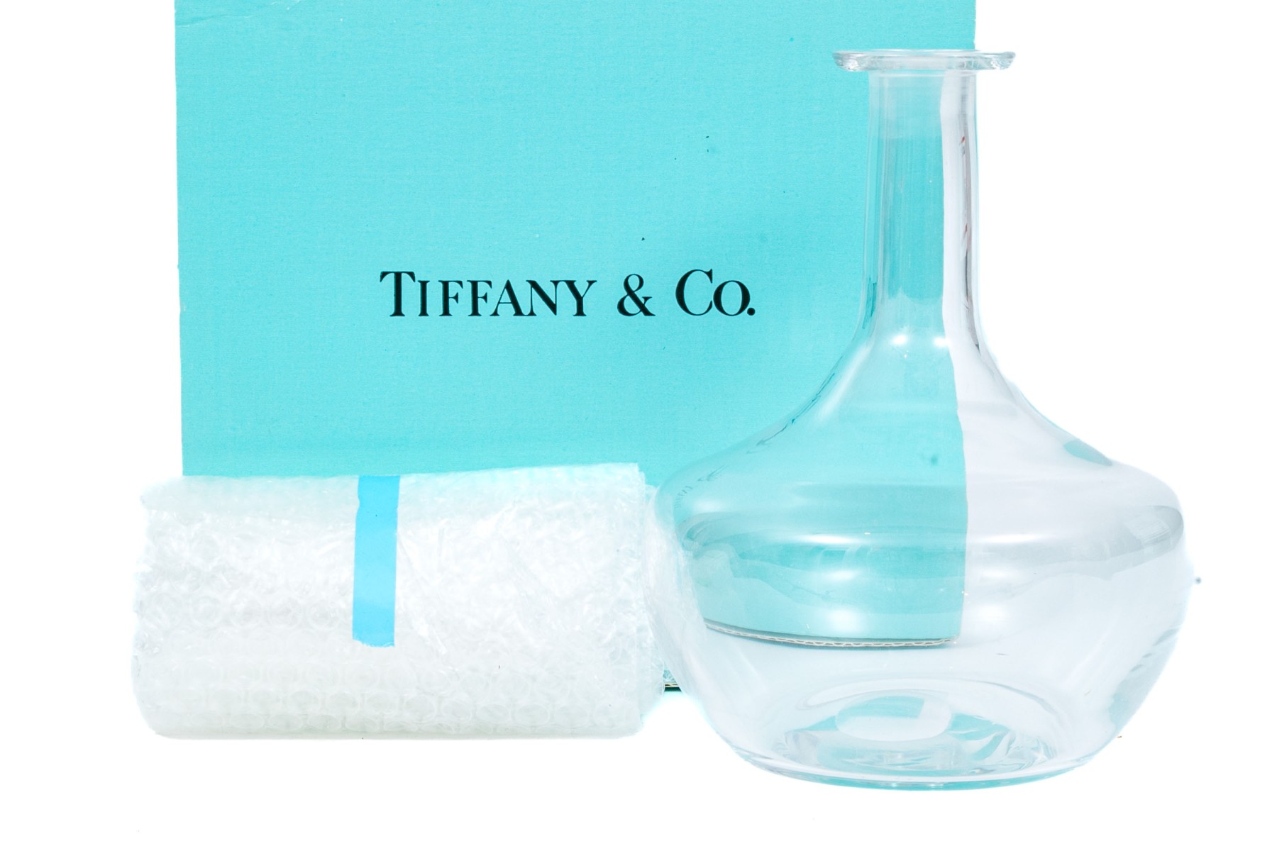 Contemporary styled glass decanter with stopper by Tiffany & Co.. The decanter comes in Tiffany & Co. box.