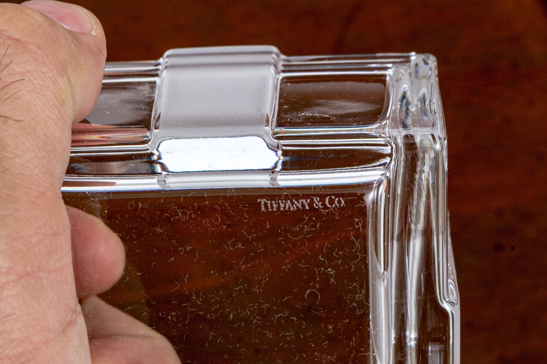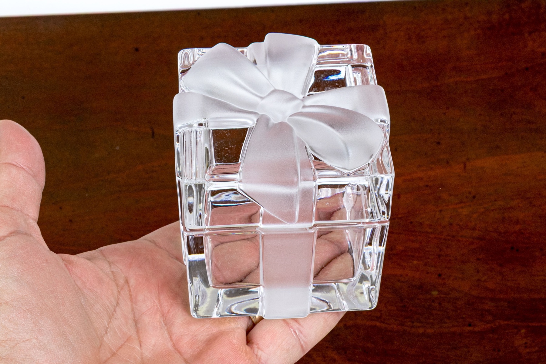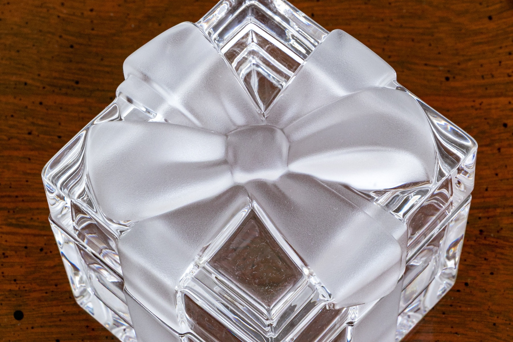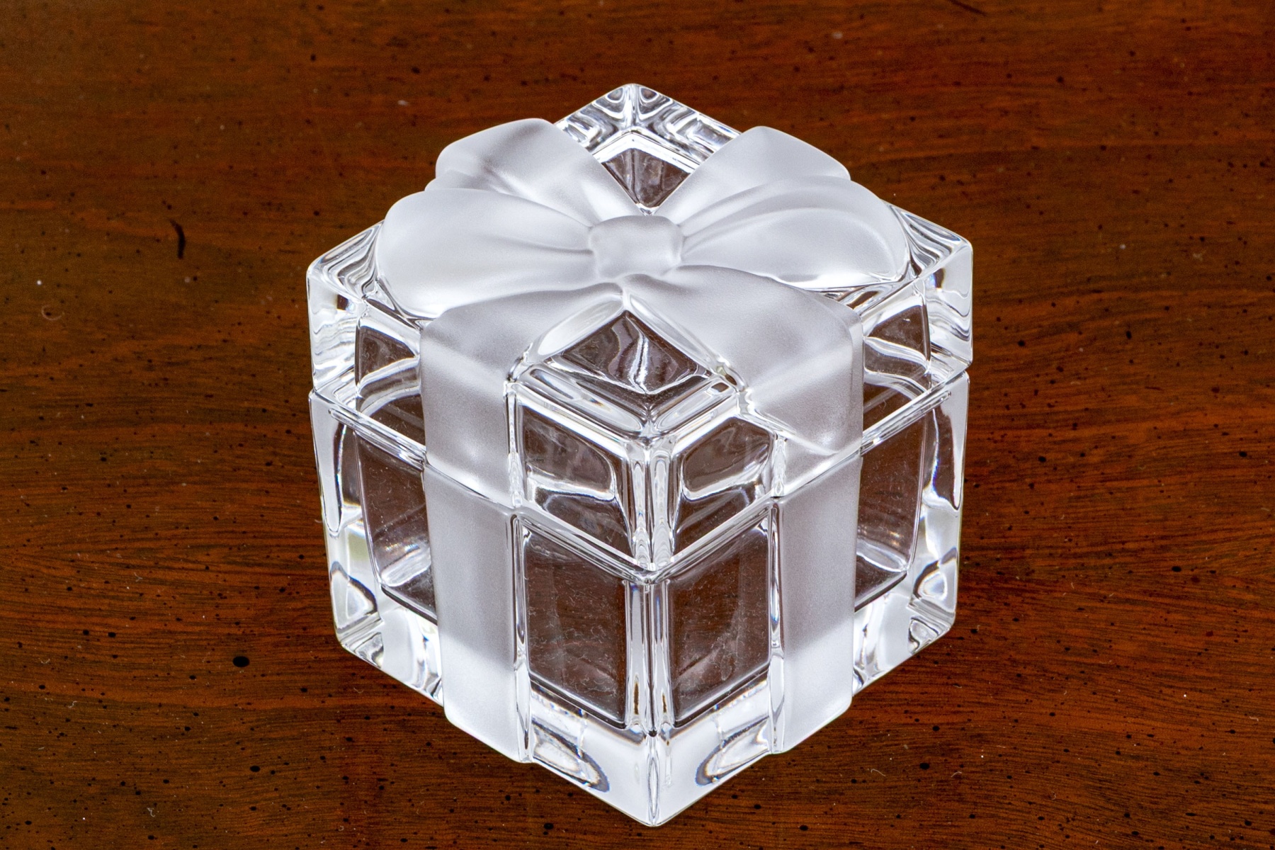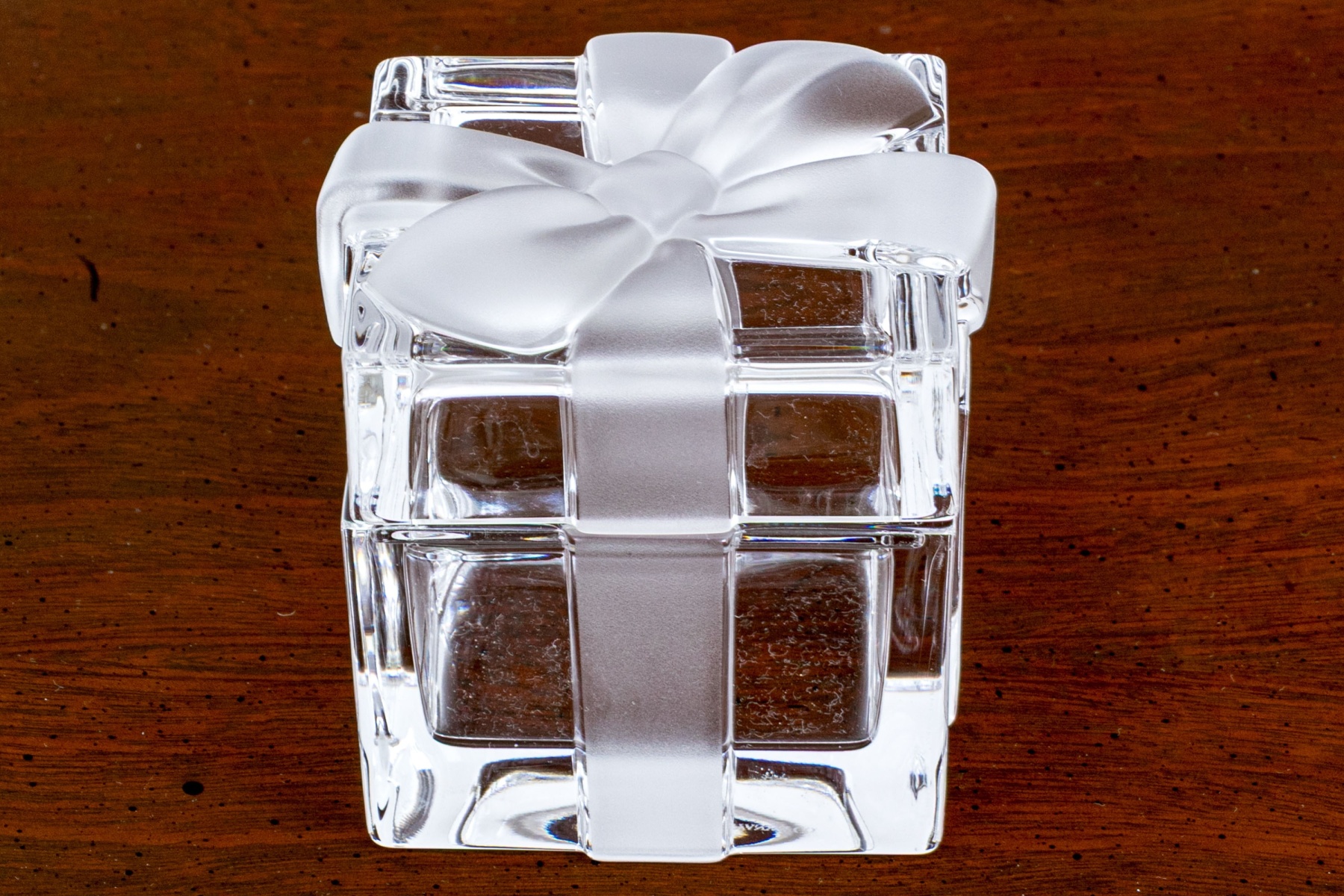 A fun and elegant Tiffany & Co. crystal box in the form of a present with a frosted bow motif across the lid and extending down the sides.