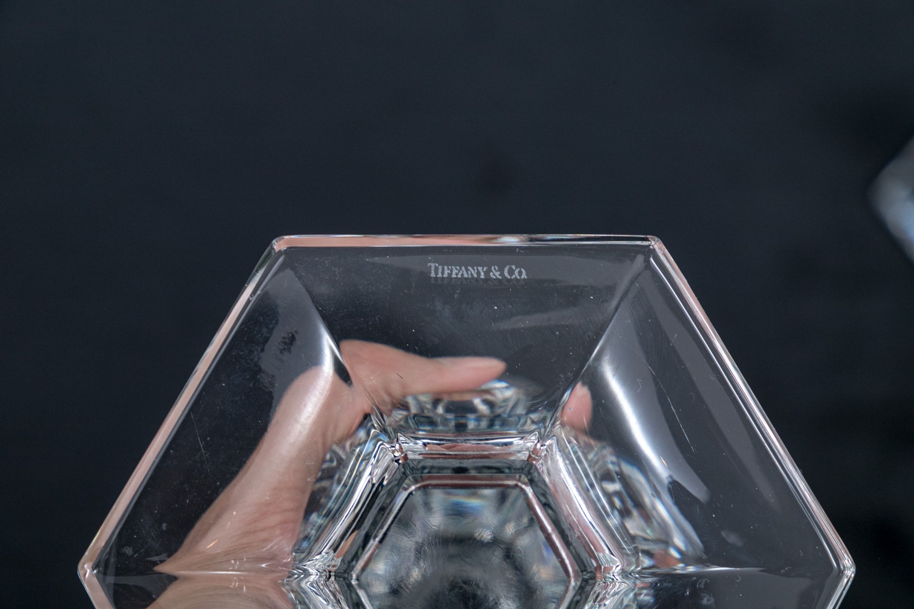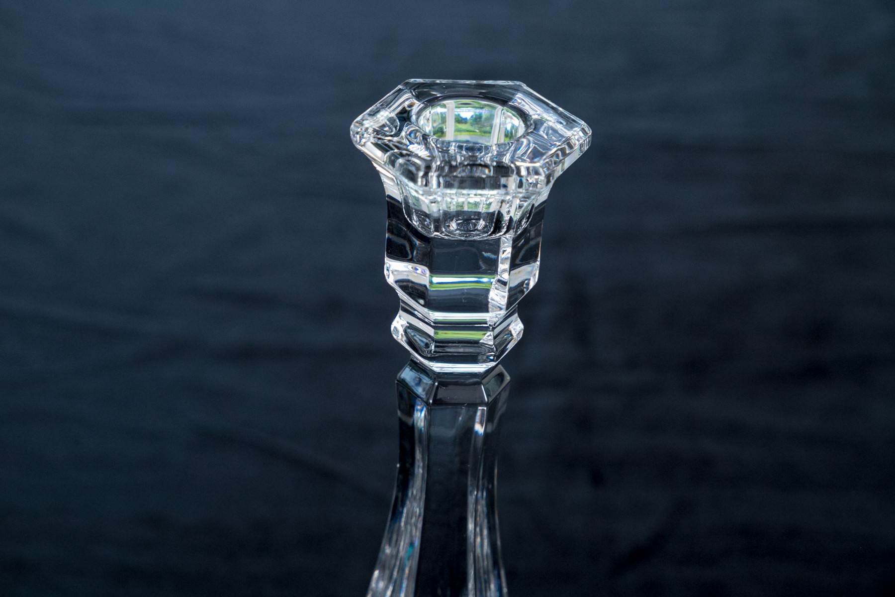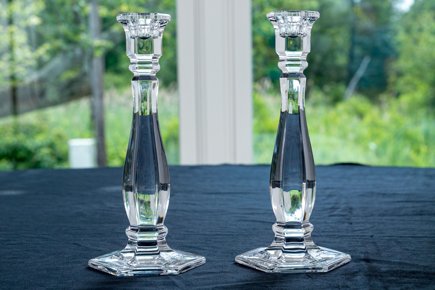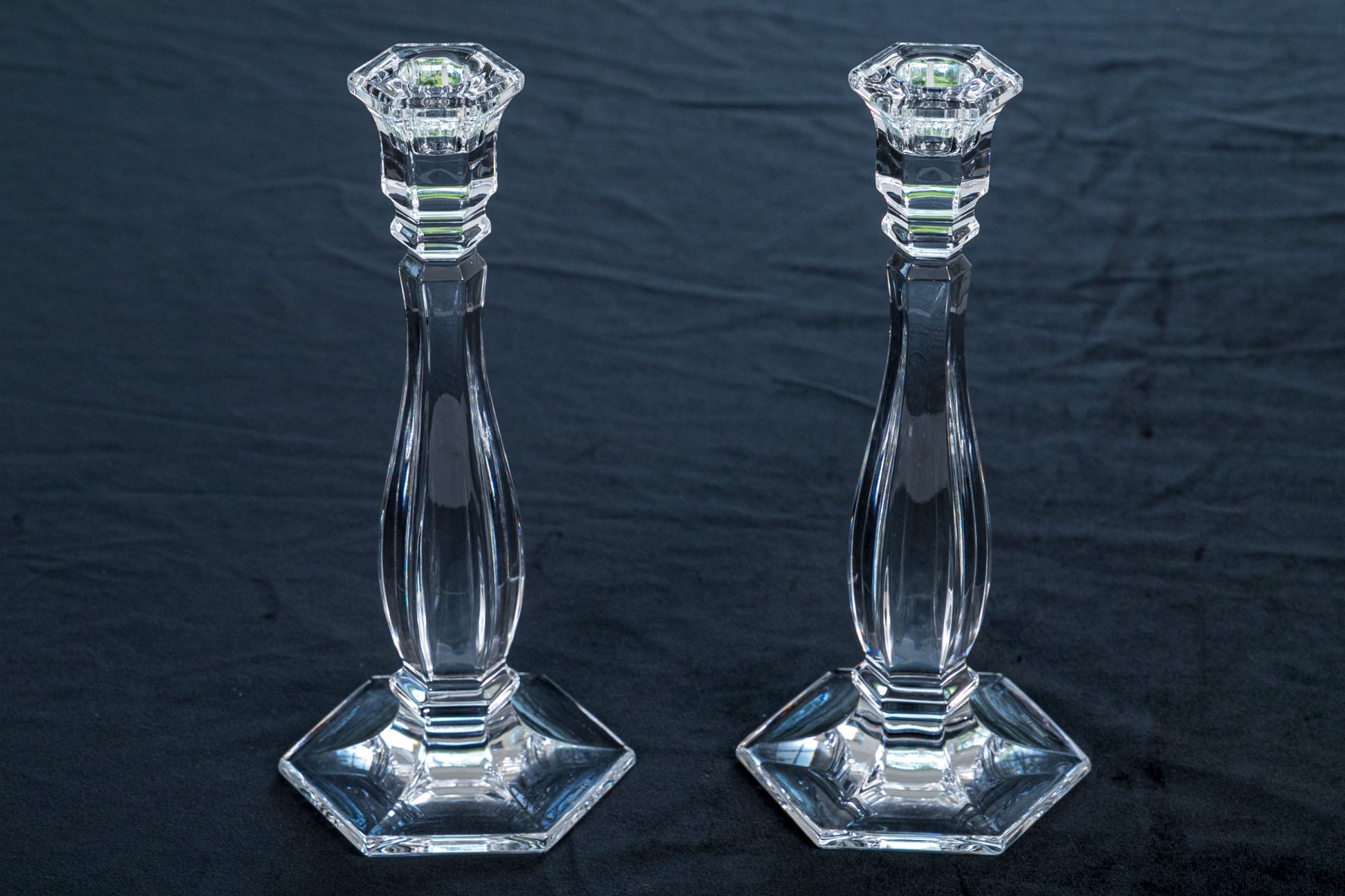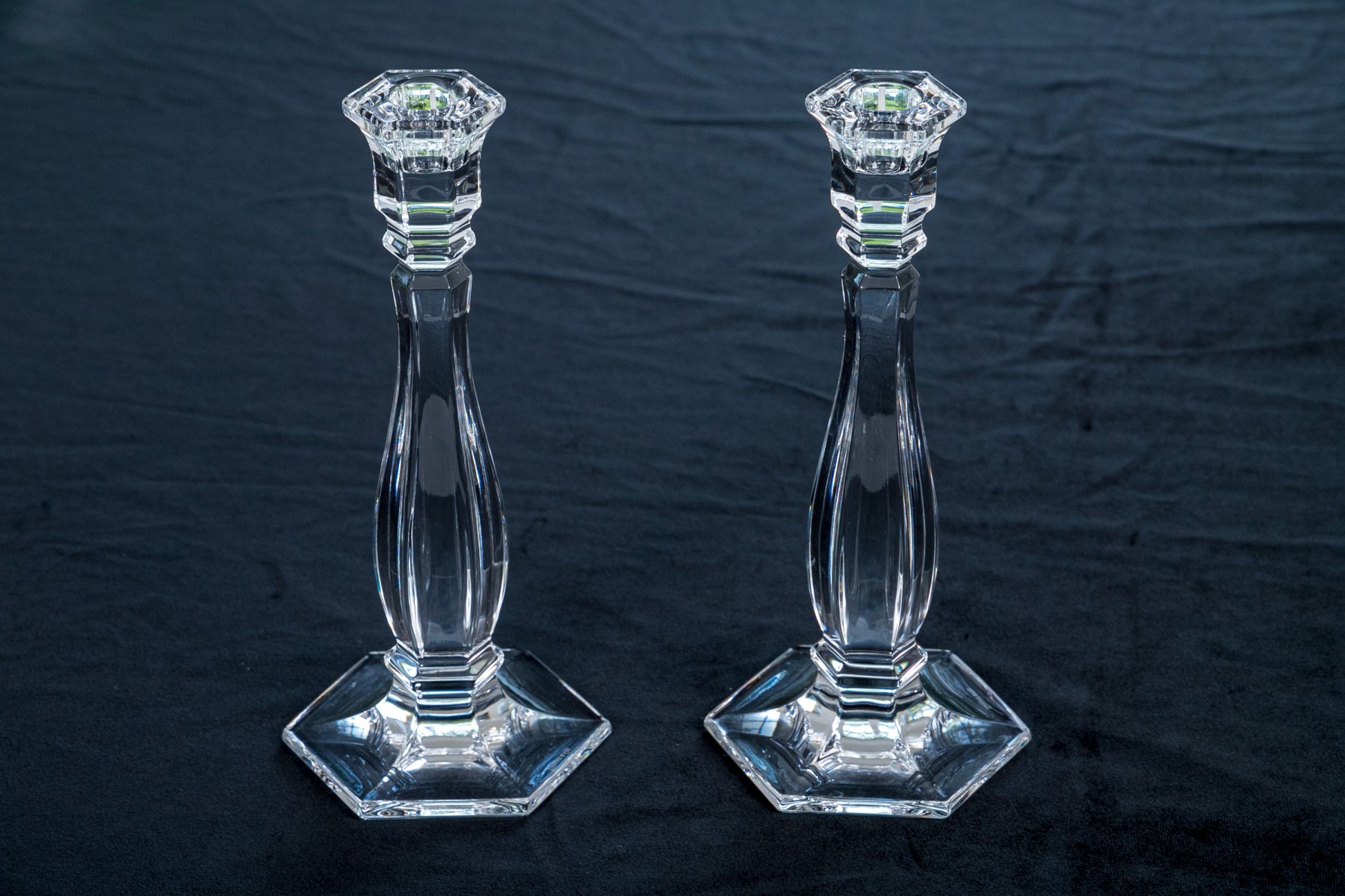 Pair of Tiffany & Co. crystal candlesticks with traditional baluster form, faceted base. Acid etched on verso.