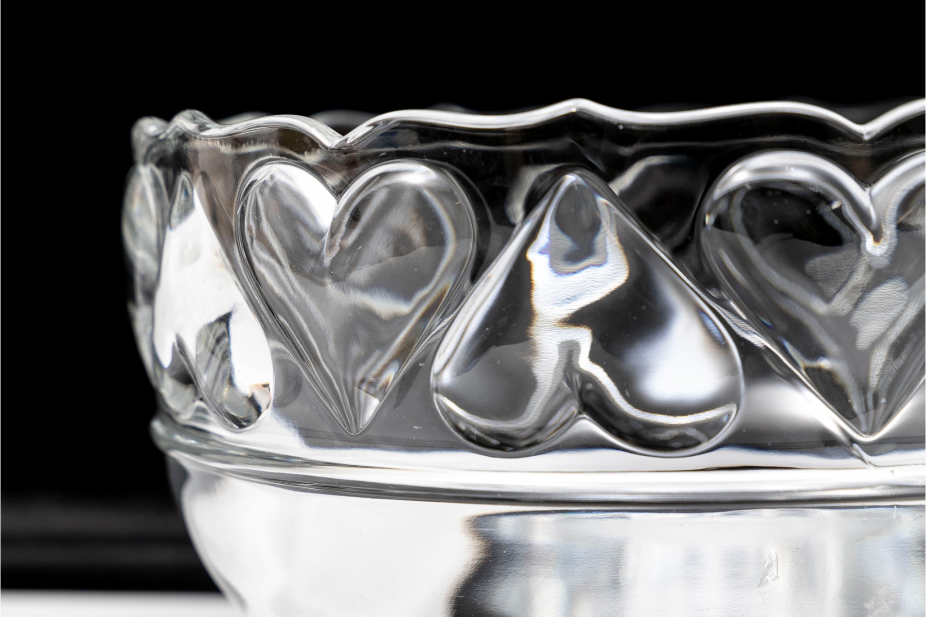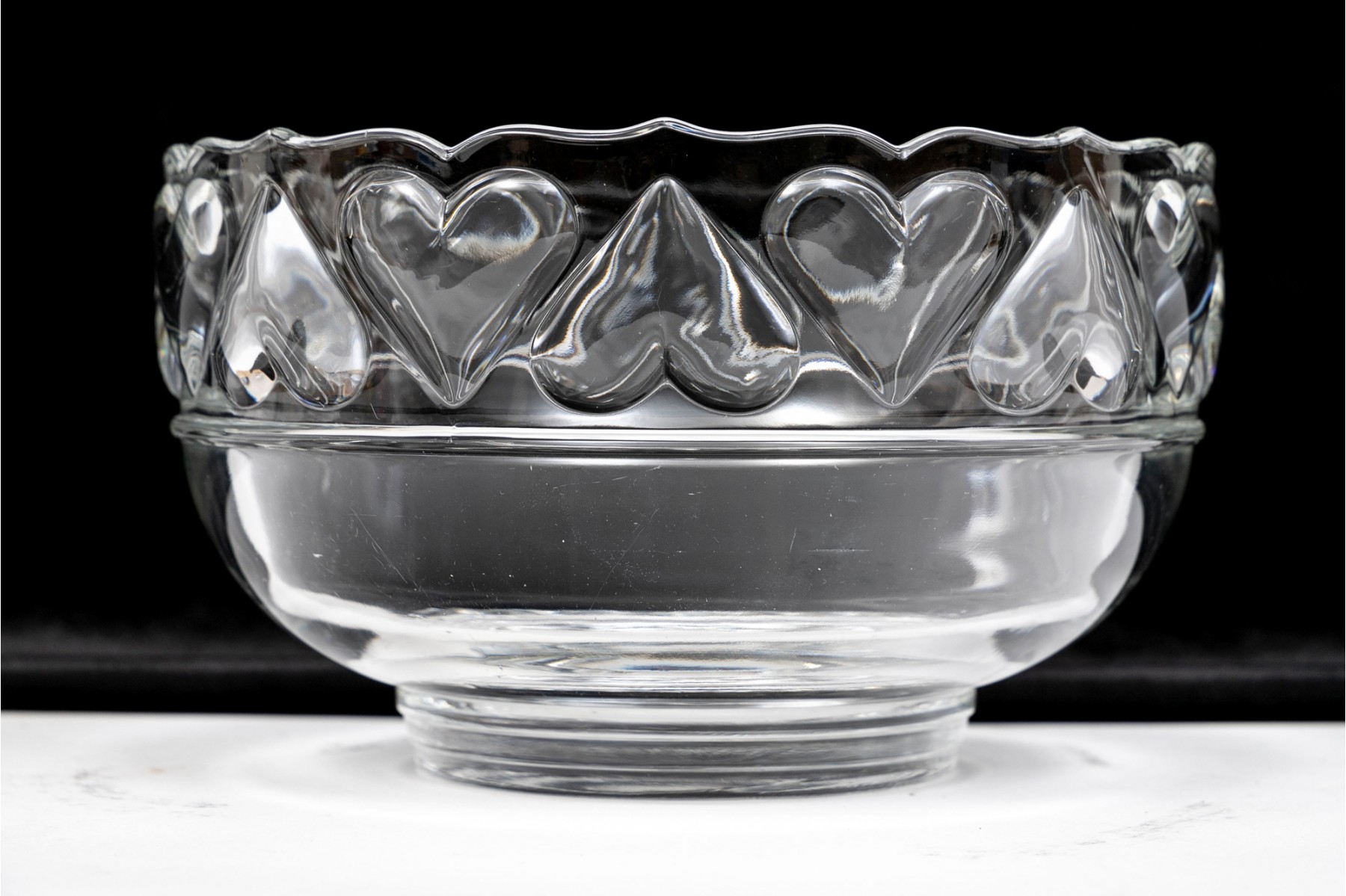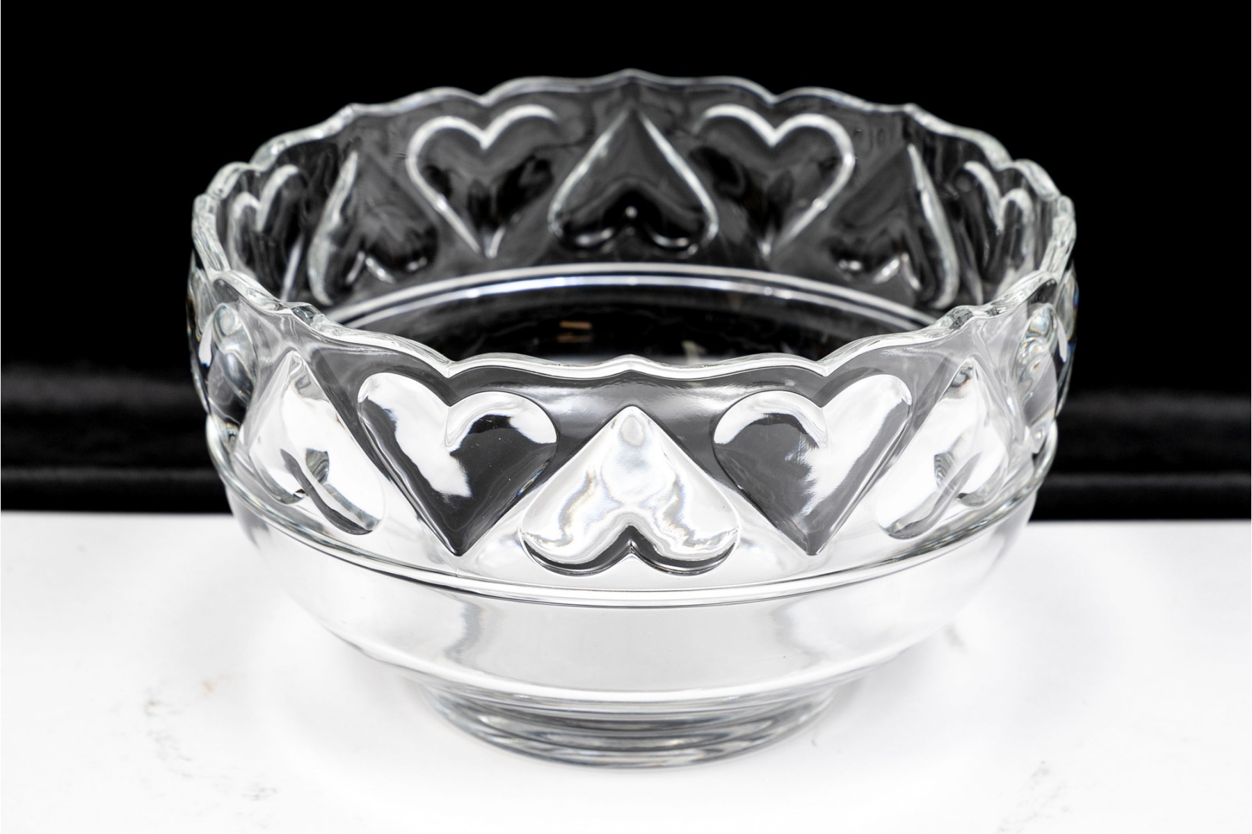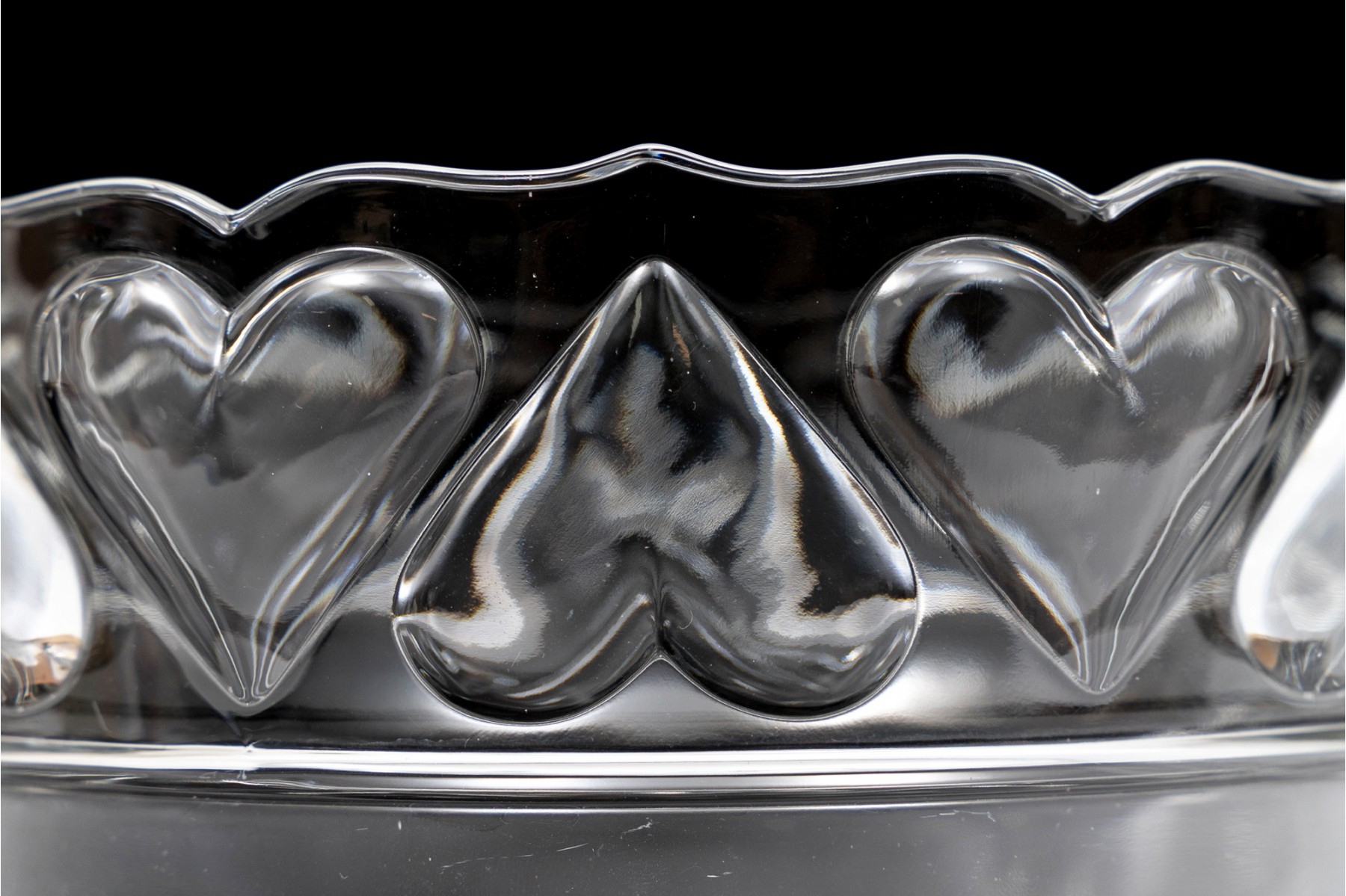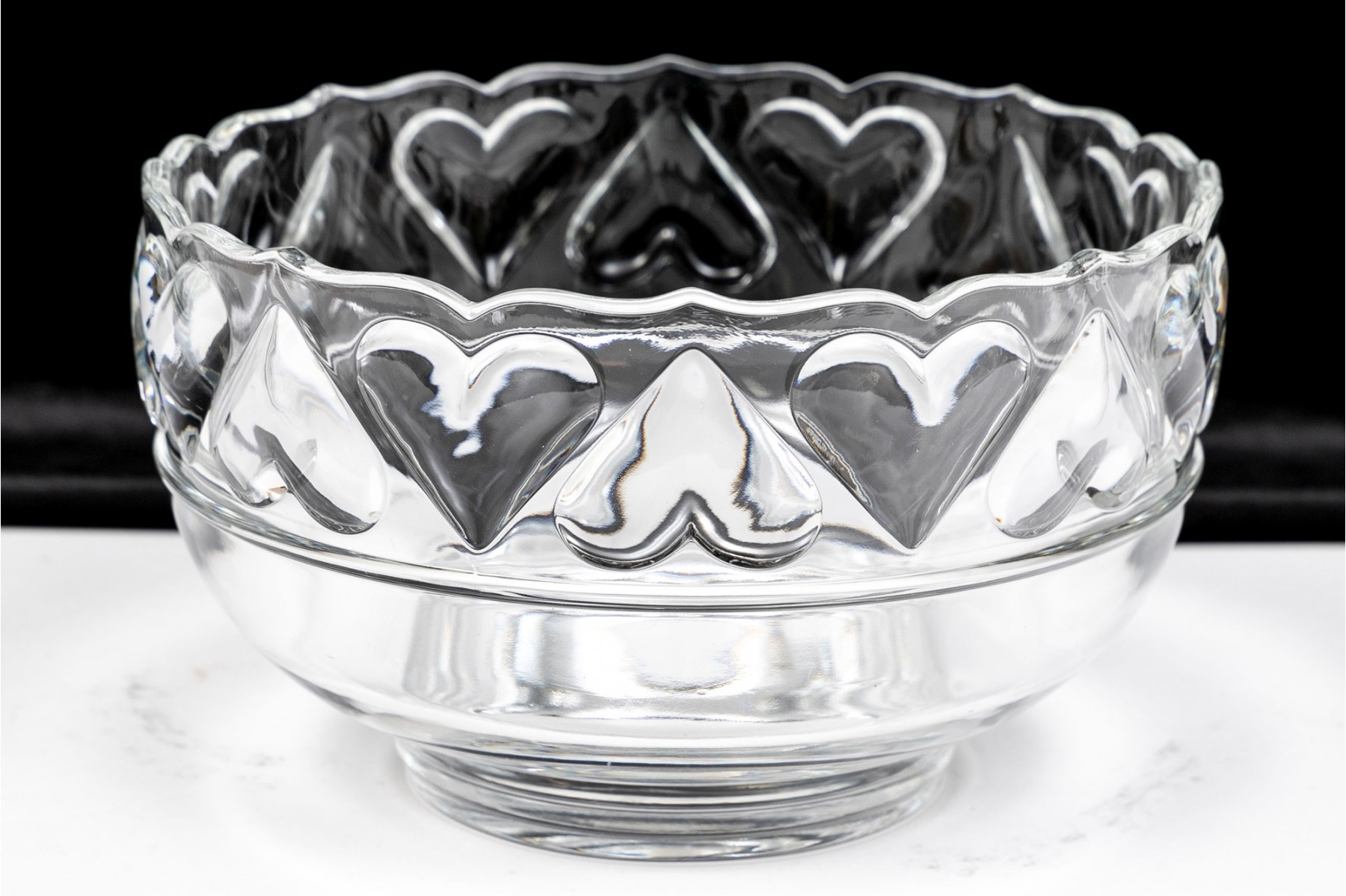 The Tiffany classic "Hearts" bowl with a band of hearts in relief around the scalloped rim. Raised on a stepped ring base.