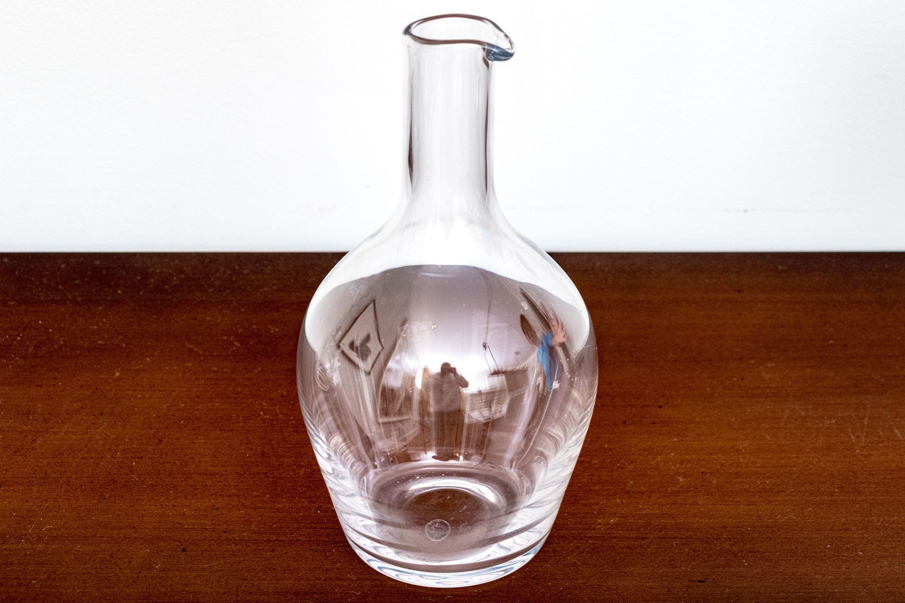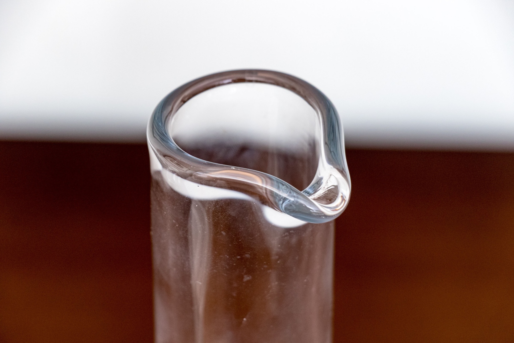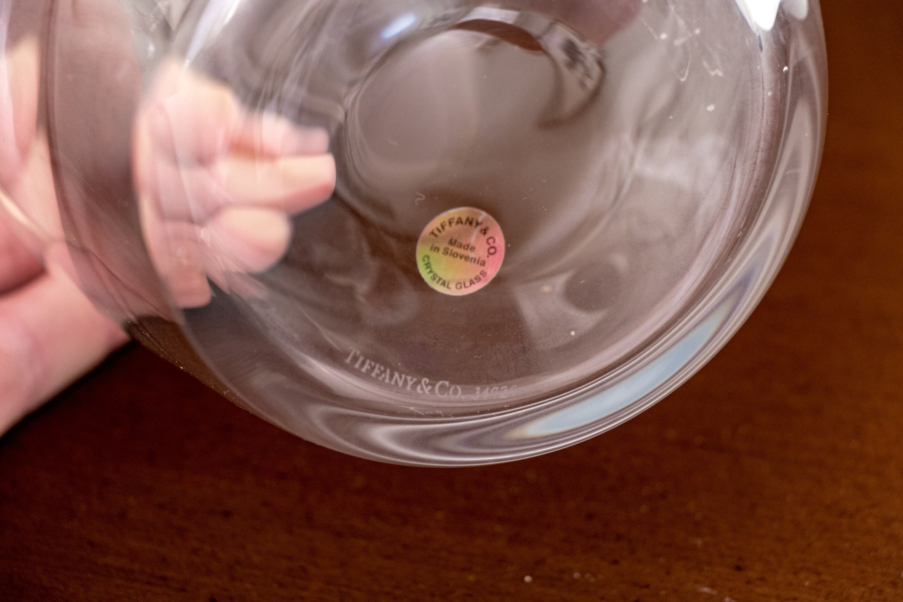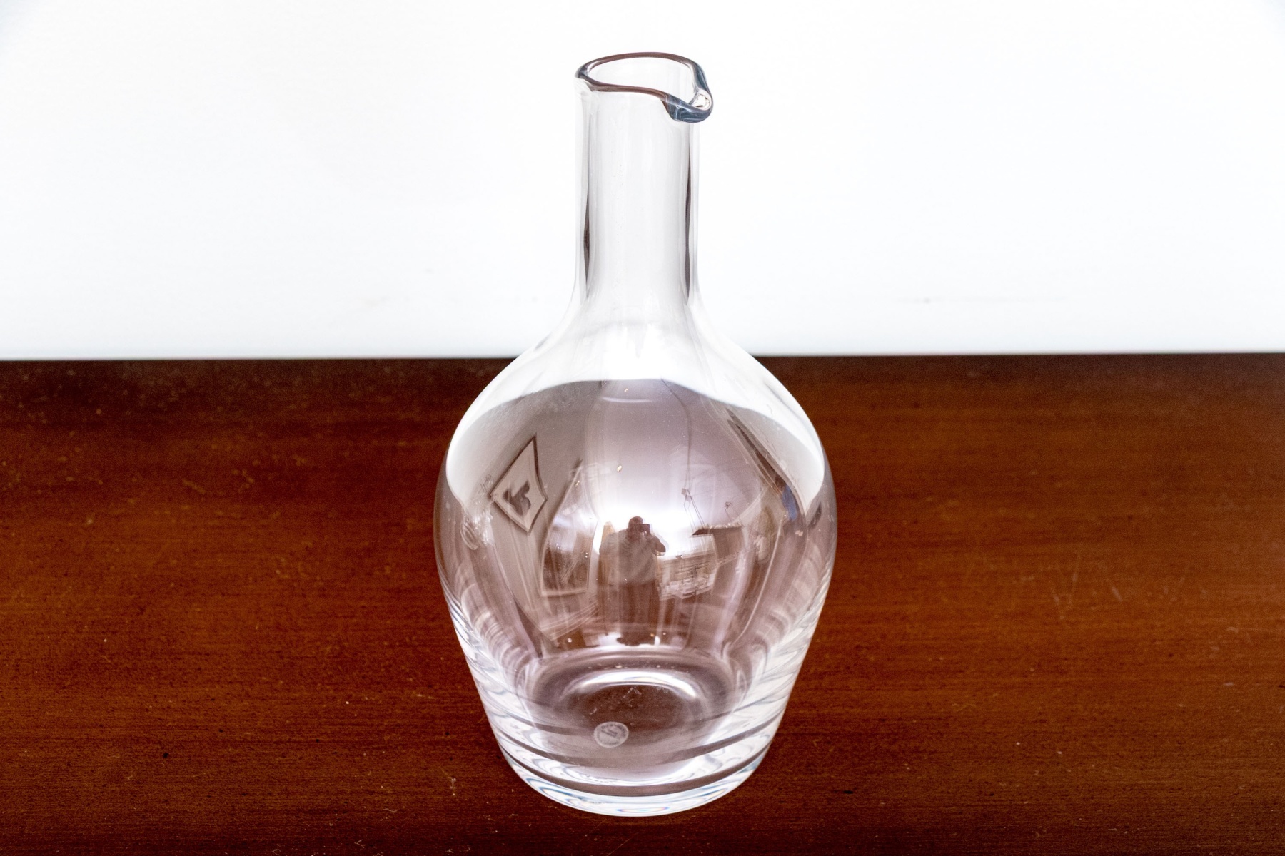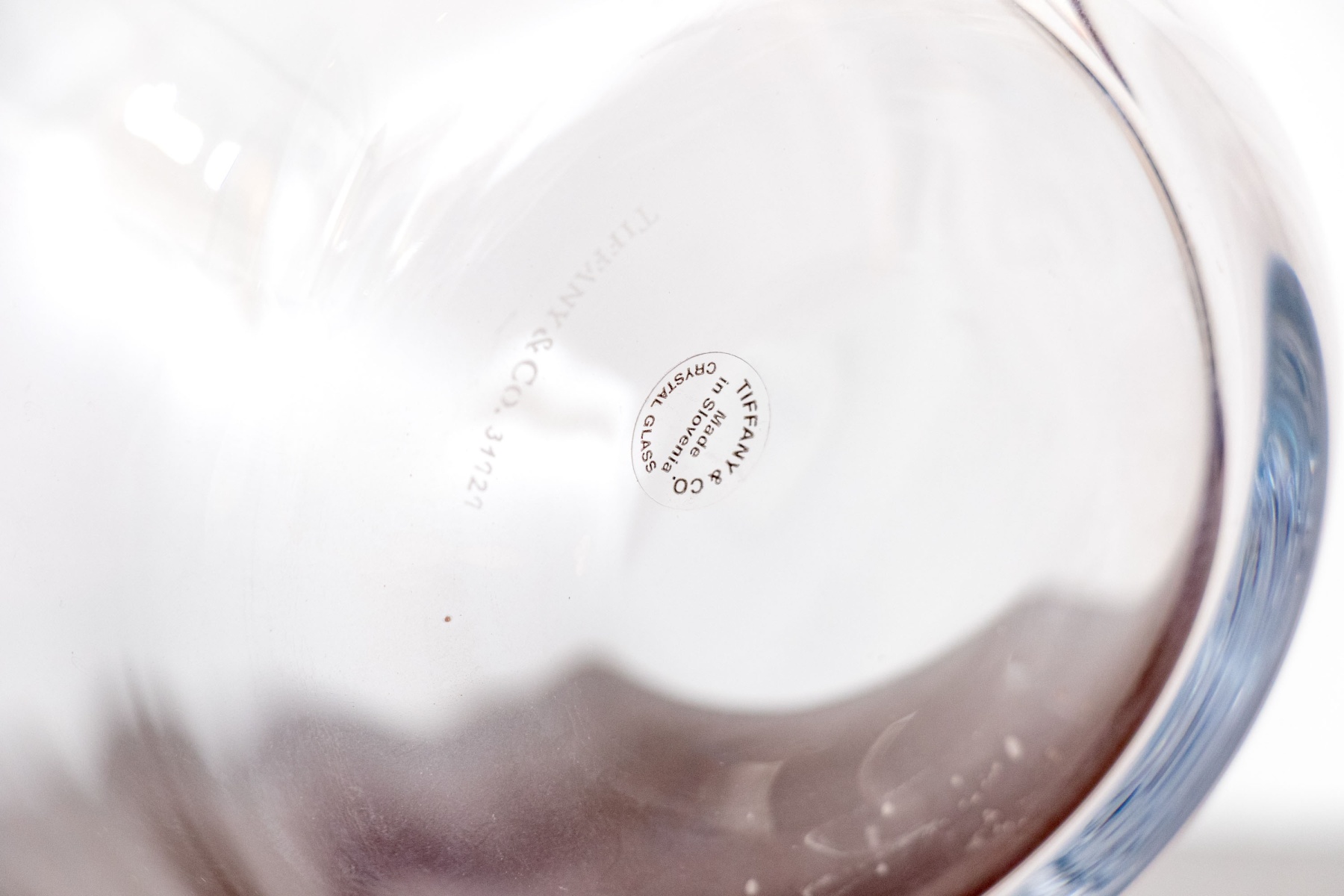 An elegant Tiffany & Co. crystal bottle form decanter, showcasing a tall cylindrical neck with a nicely formed spout to the mouth rim. Standing on a flat foot, the decanter is marked underfoot.