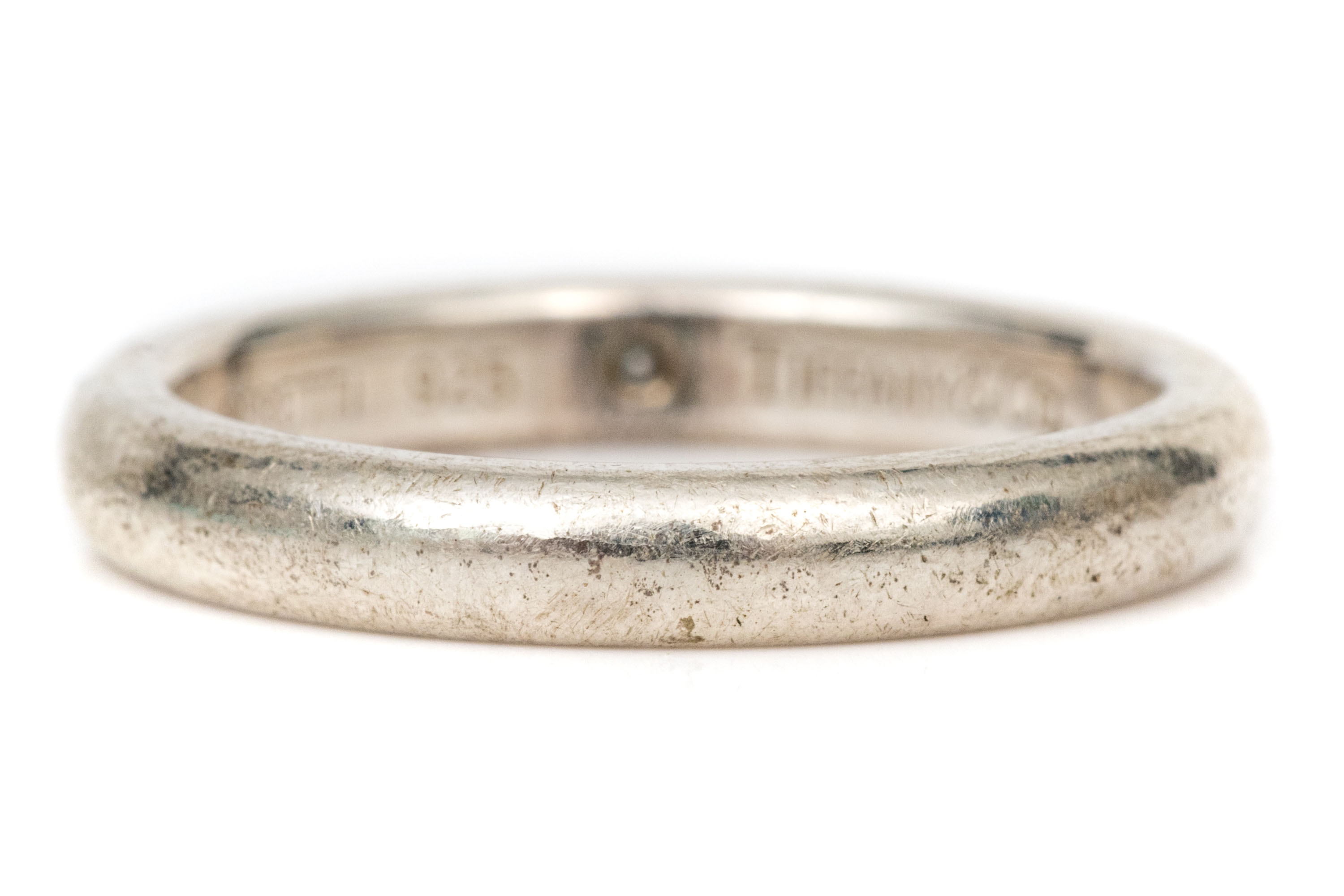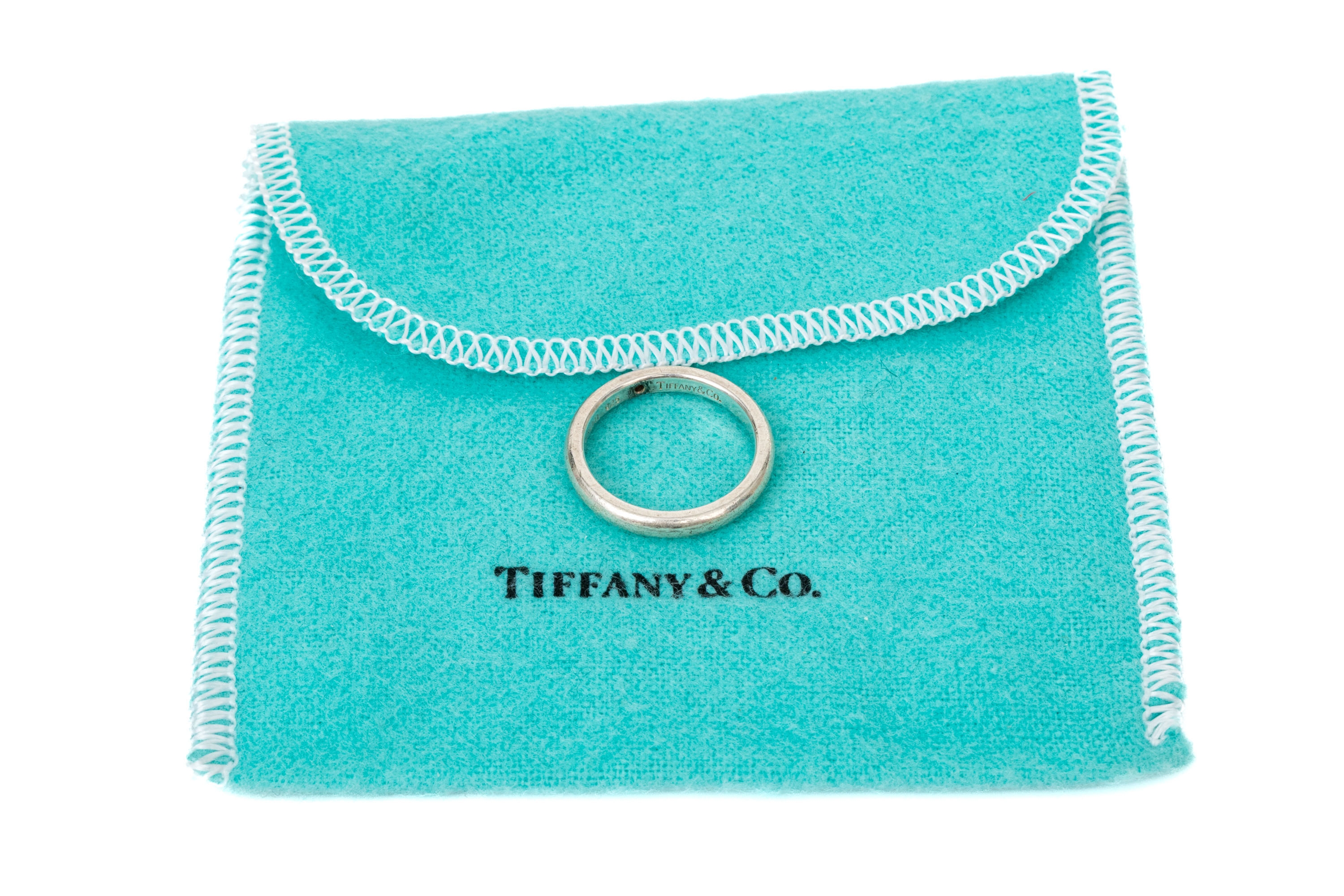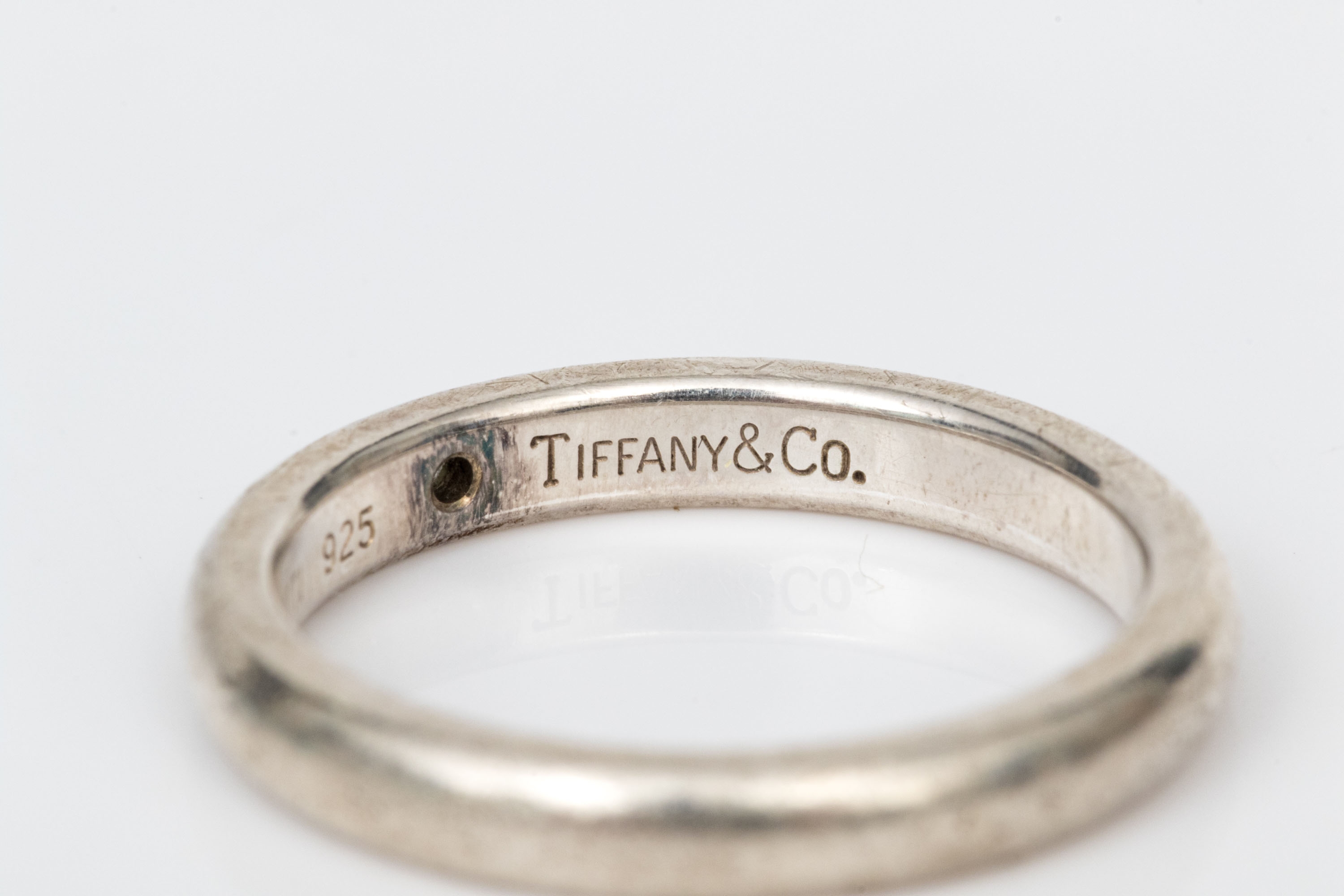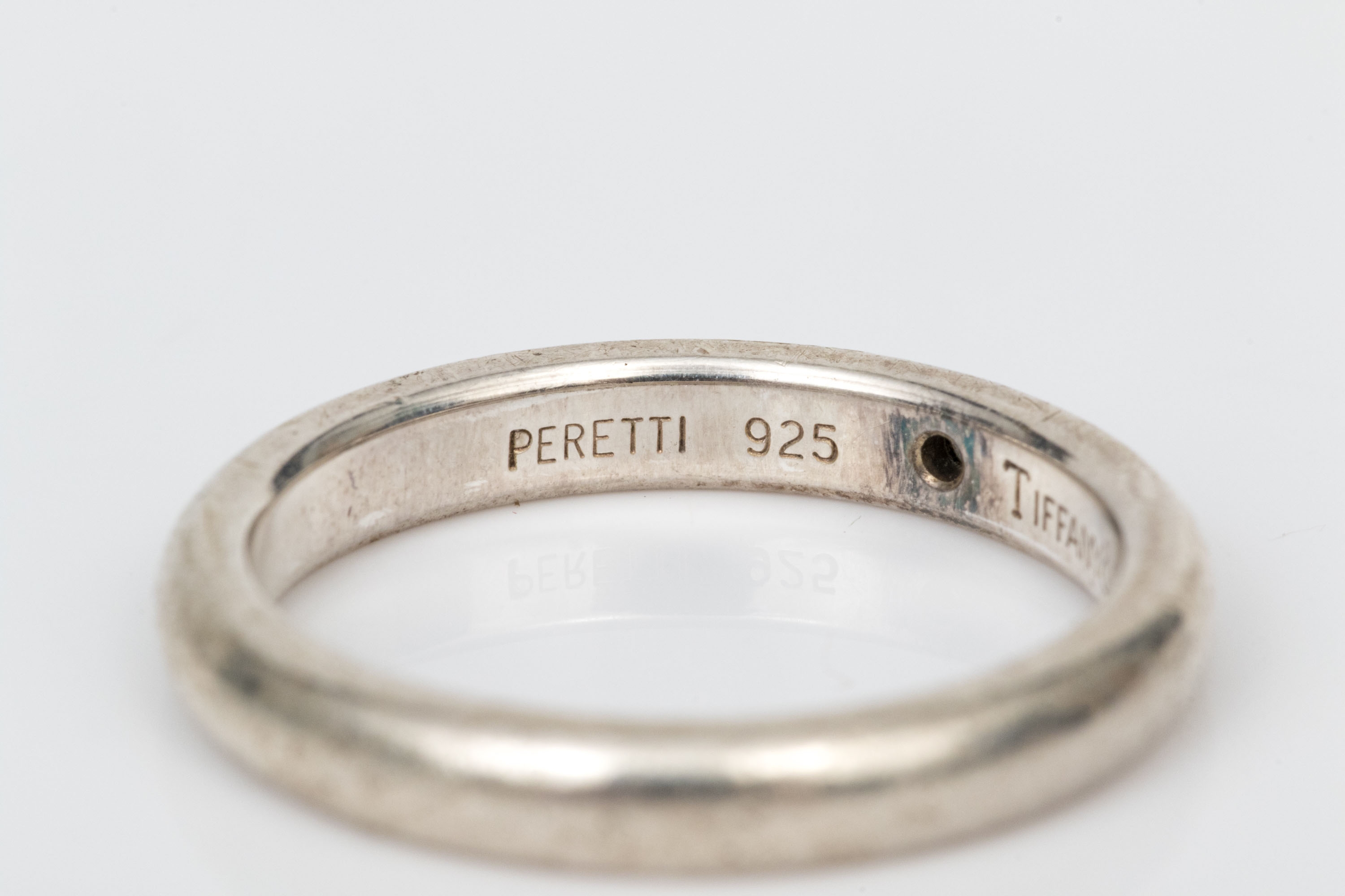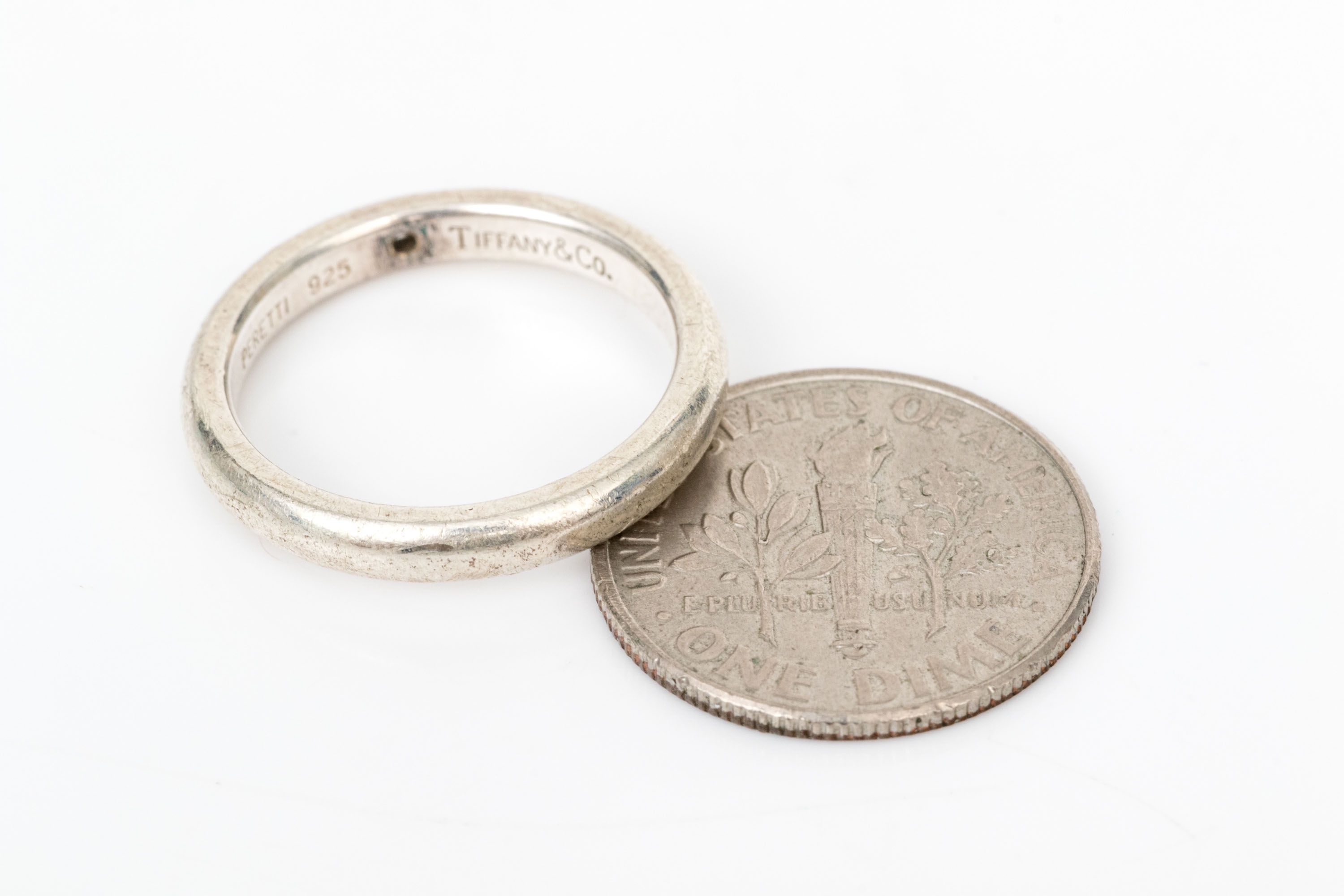 Sterling silver ring. This handsome ring by Tiffany & Co. is a simple, high polished sterling silver band style, by Elsa Peretti. The pendant is accompanied by a Tiffany felt.