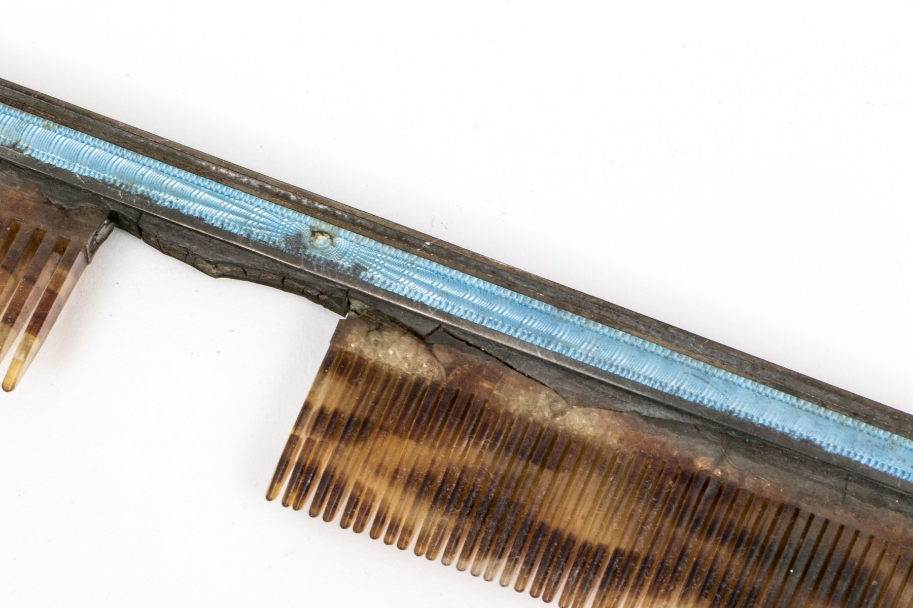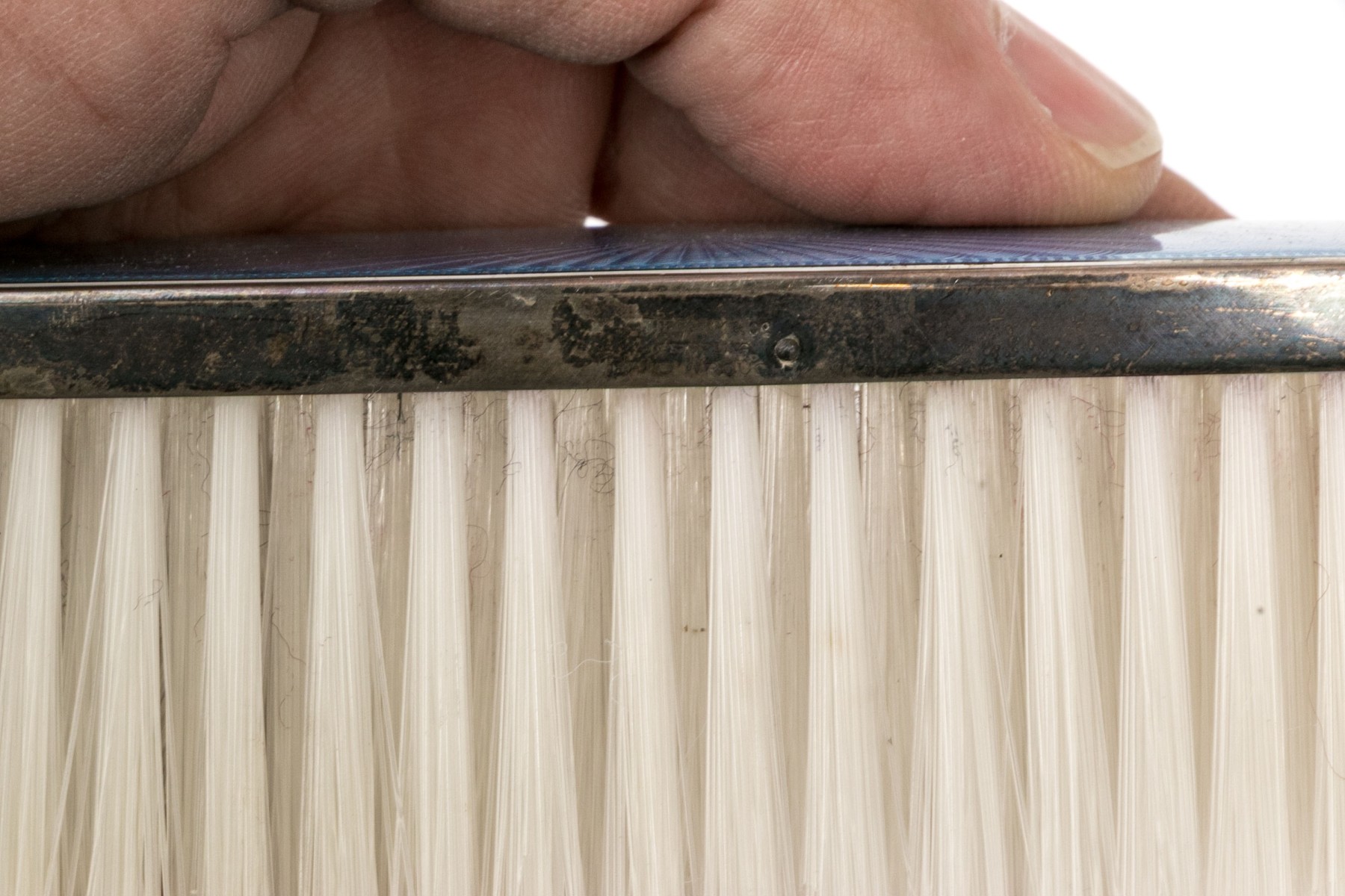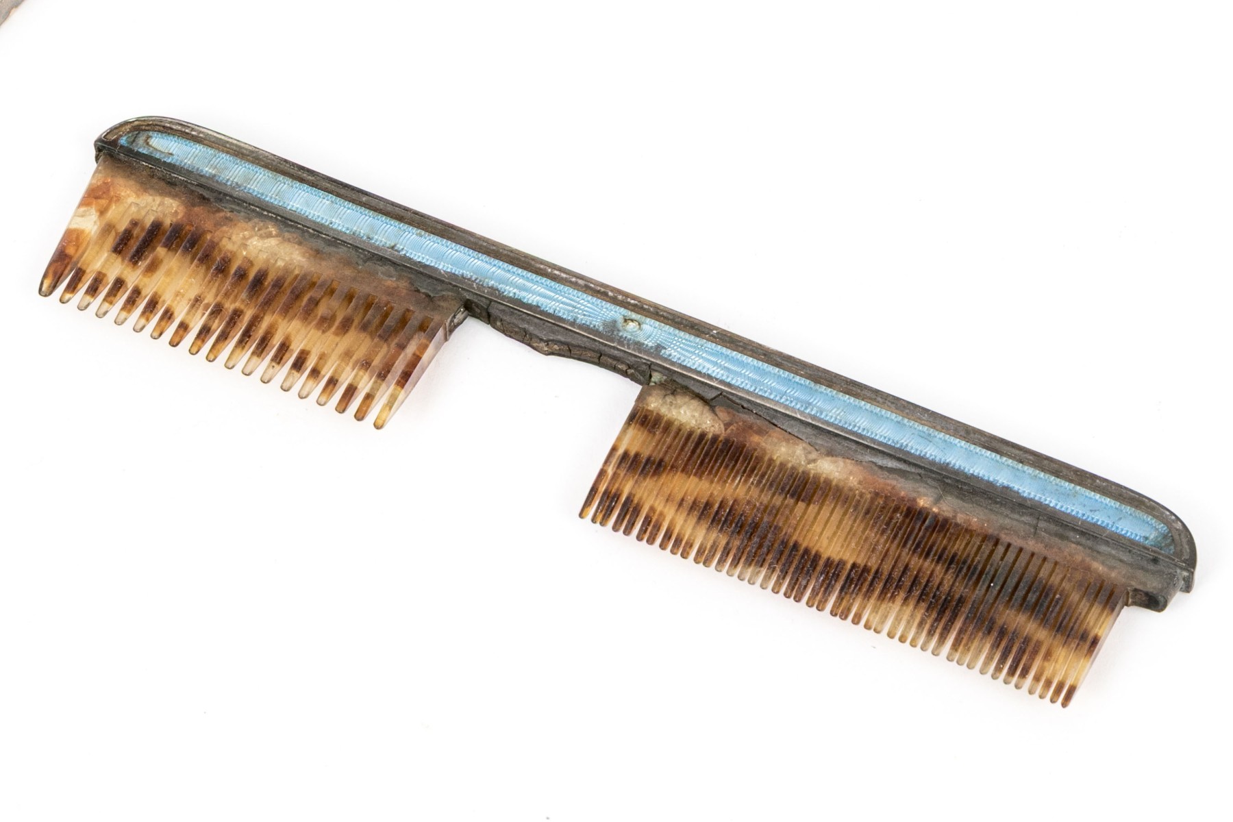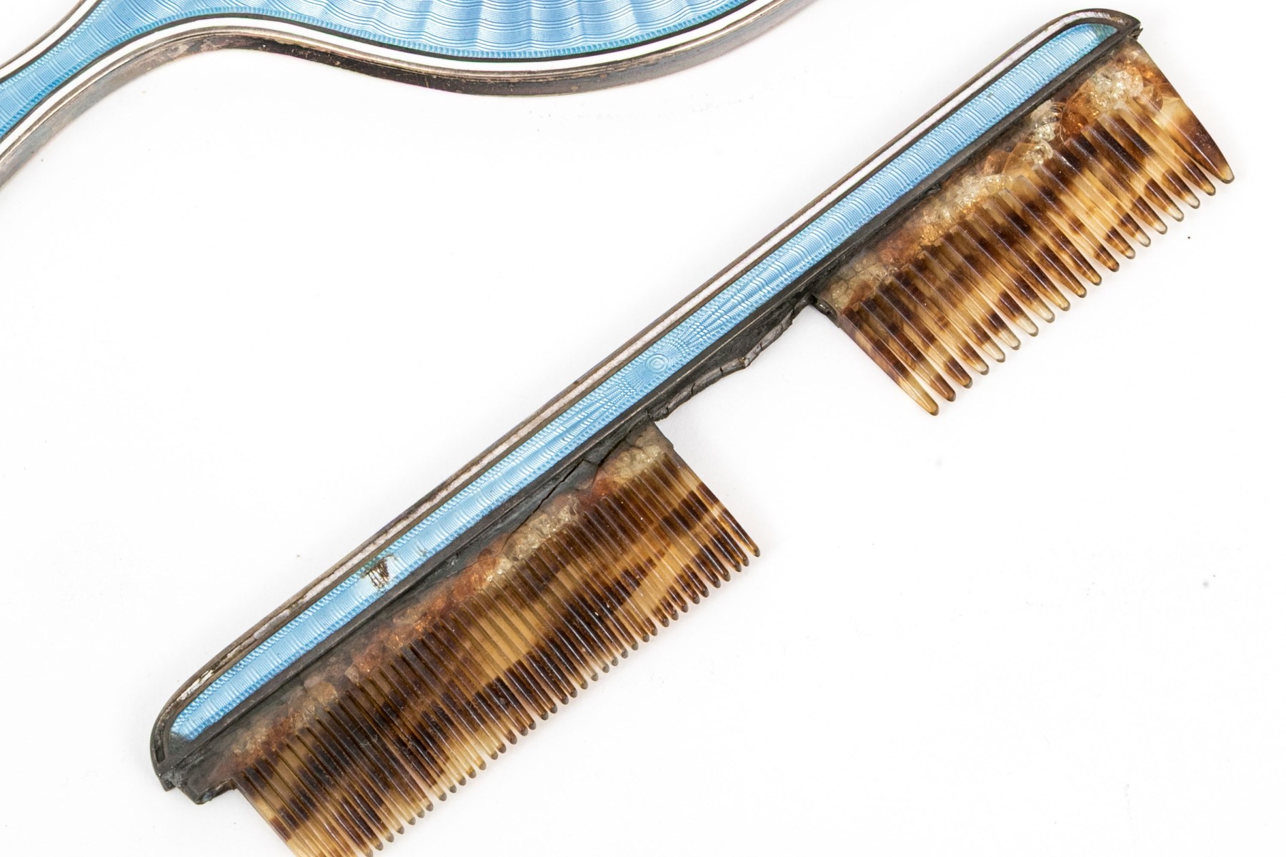 Missing spines to the comb and wear to the silvered mounts and enamel commensurate with age and handling. Some damage to the enamel along the edges that can be seen in the photos.