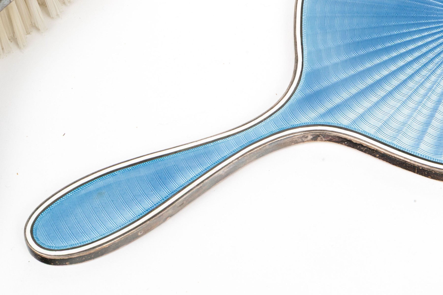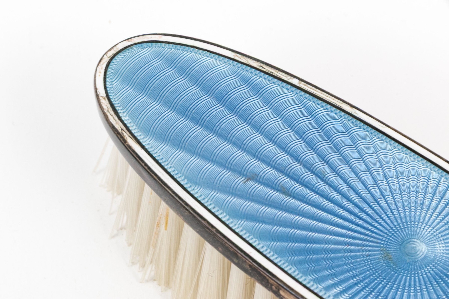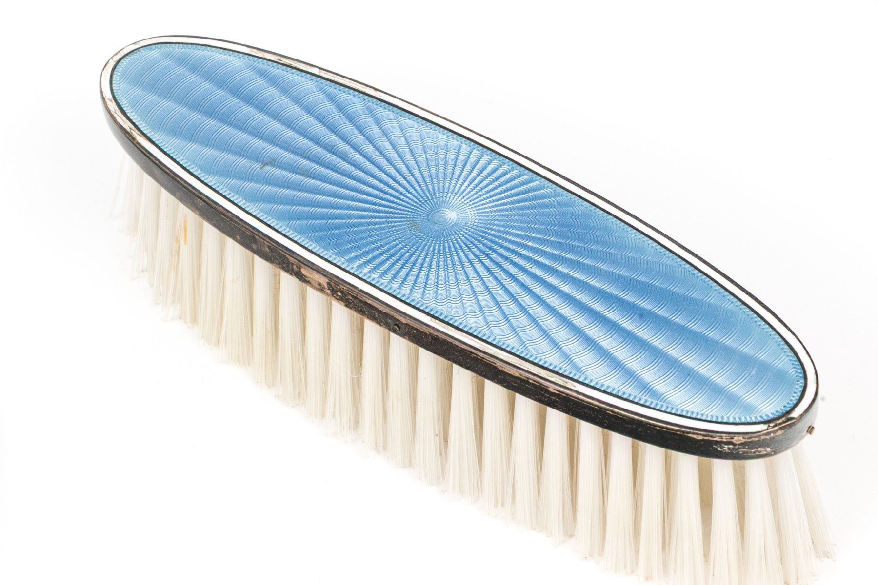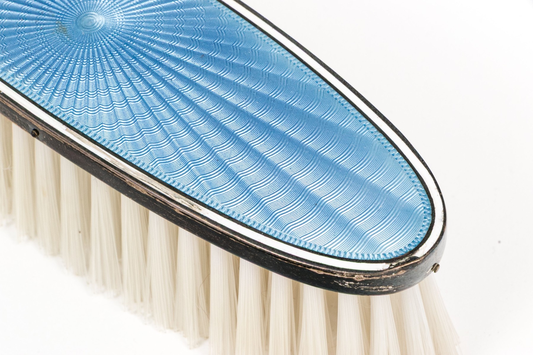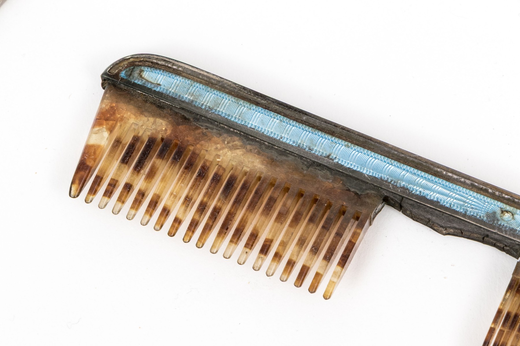 Missing spines to the comb and wear to the silvered mounts and enamel commensurate with age and handling. Some damage to the enamel along the edges that can be seen in the photos.