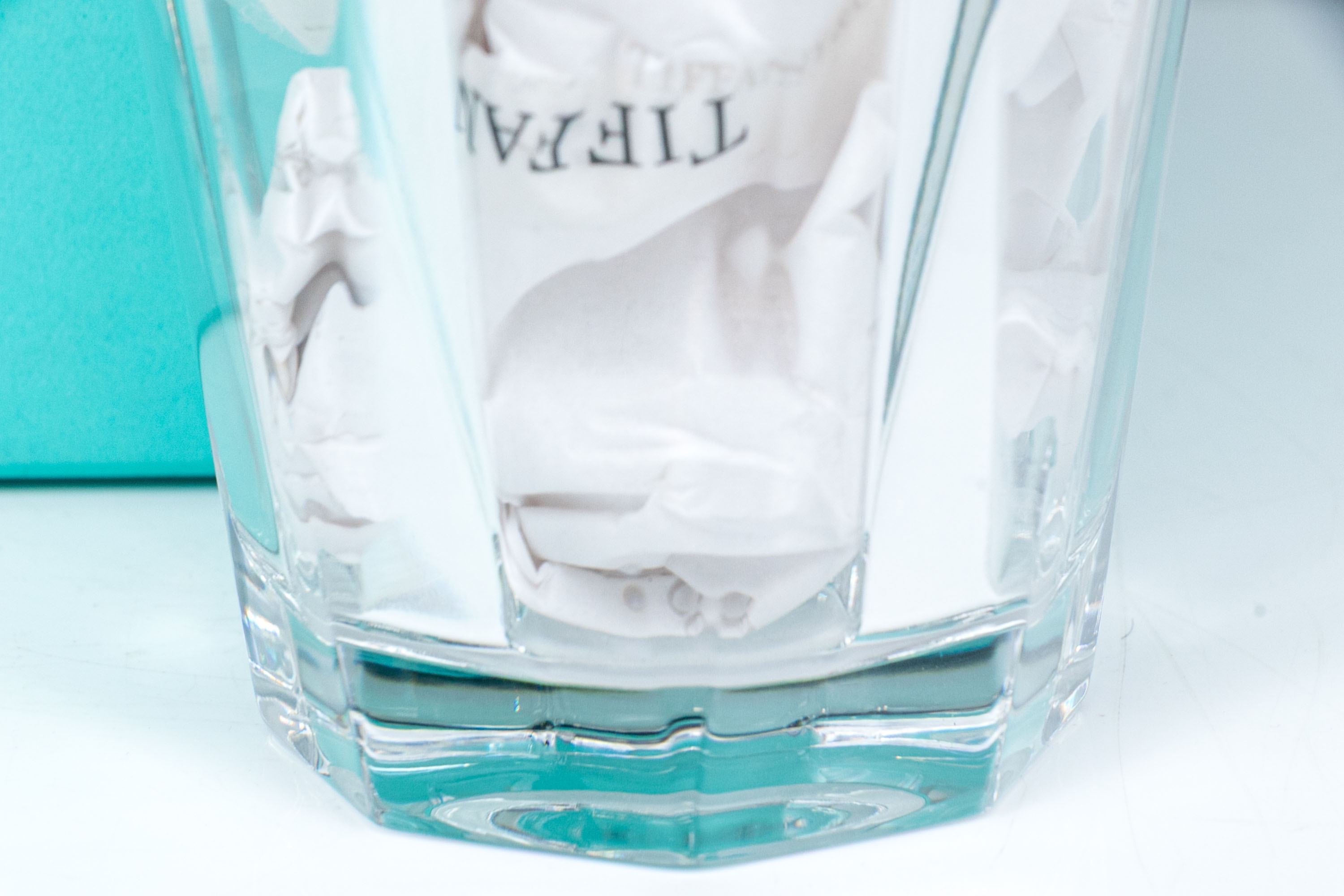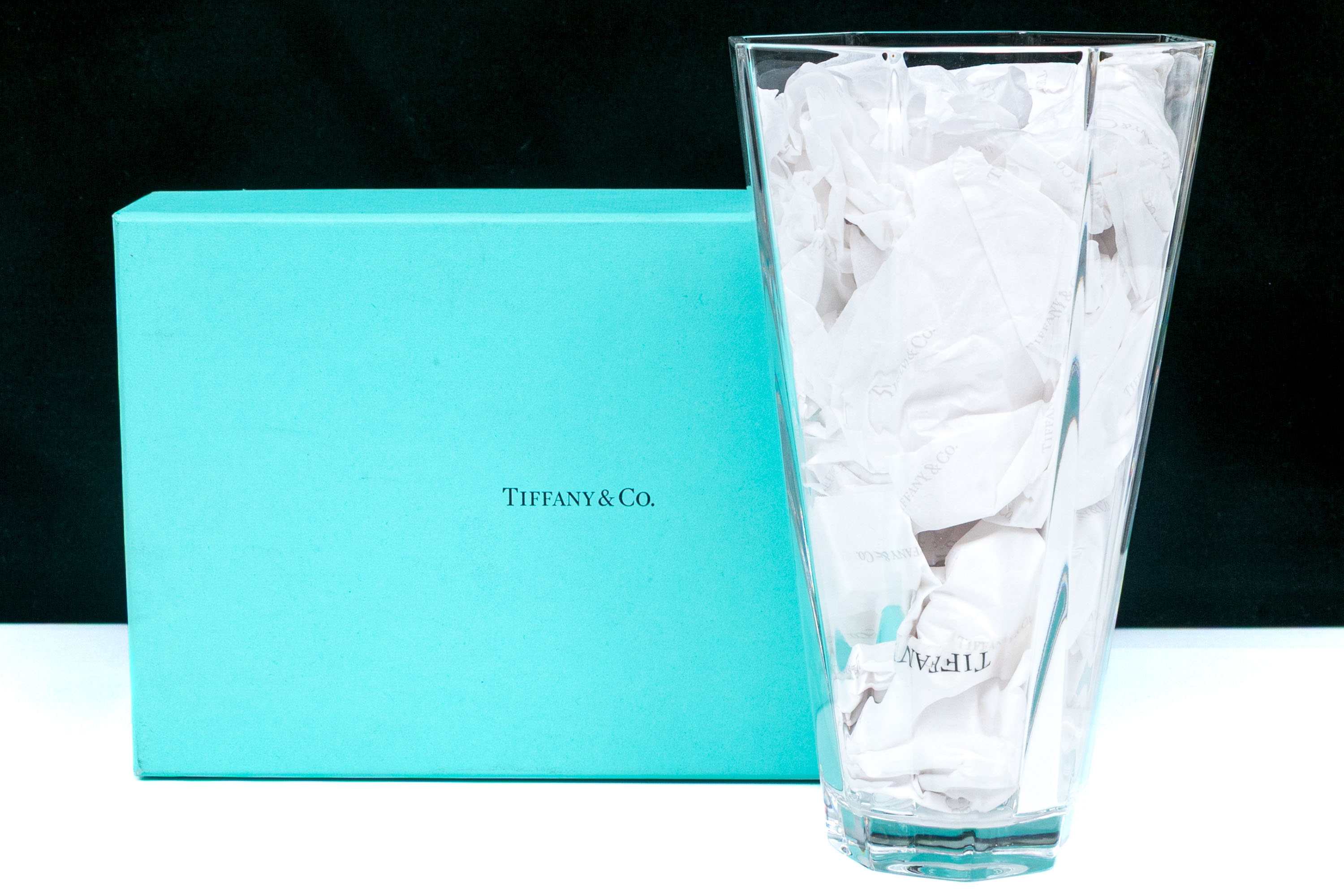 Signed. Their fine octagonal heavy crystal vase presented in their iconic blue box.