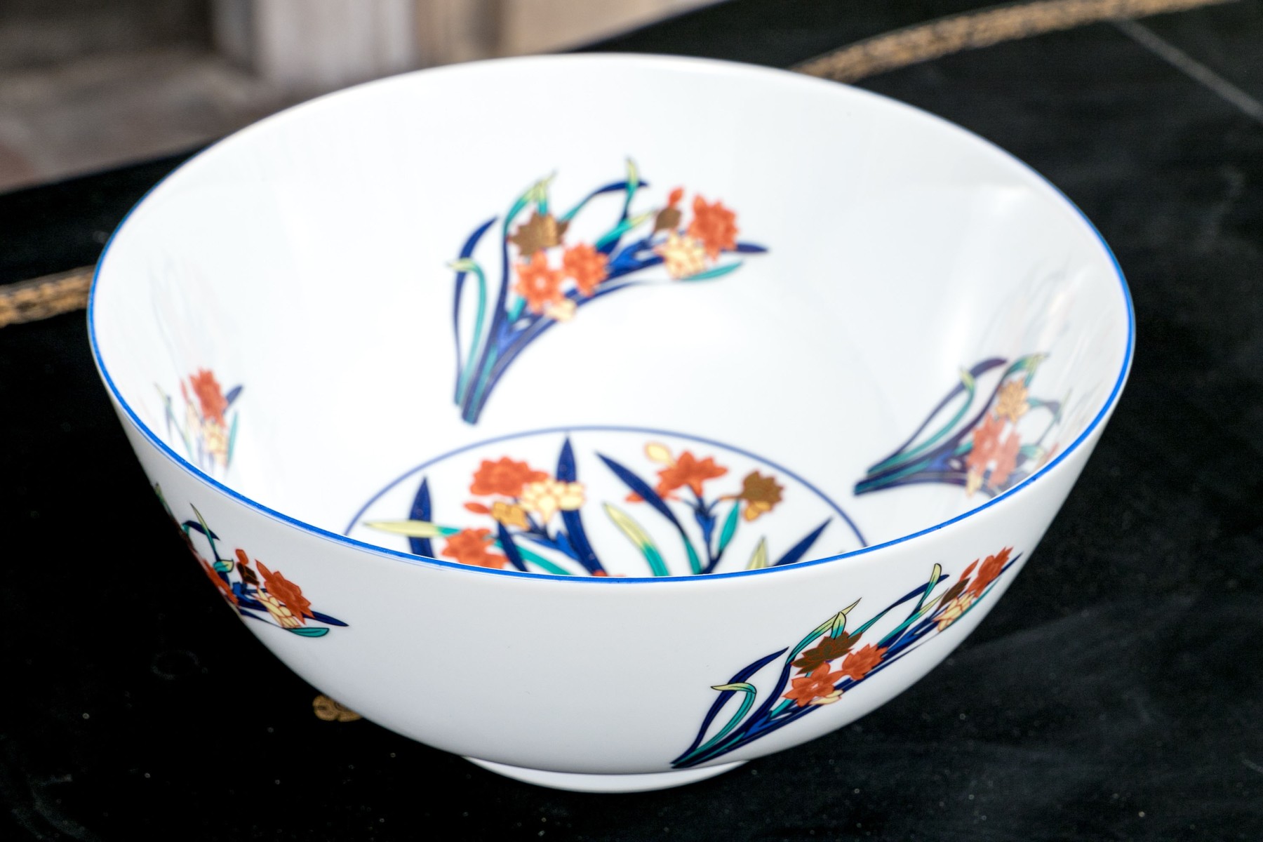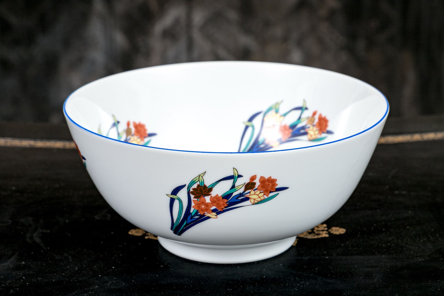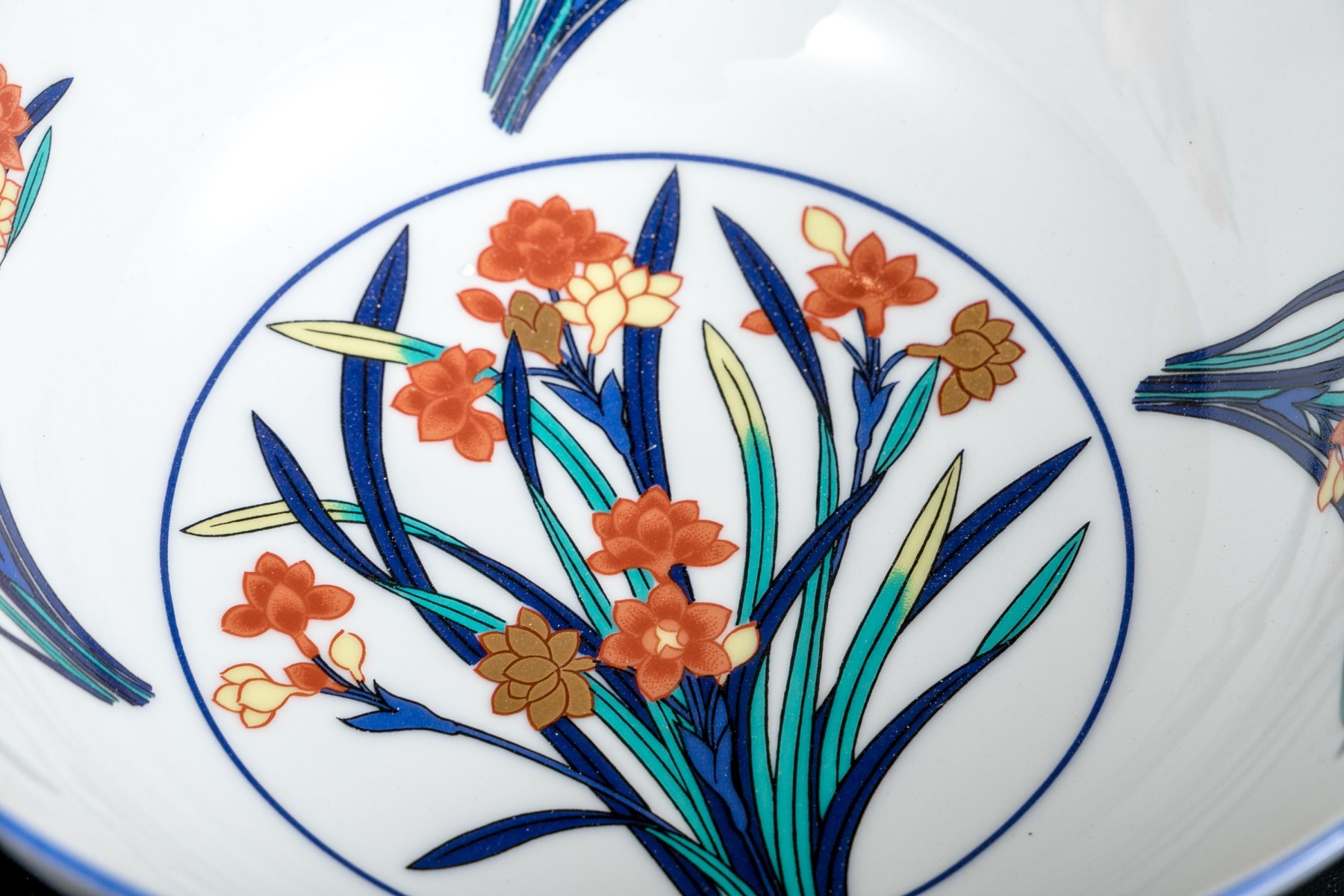 A gorgeous Tiffany & Co. "Freesia" porcelain centerpiece bowl in bright white with vibrant enameled floral sprays in blue, teal, yellow, and orange.