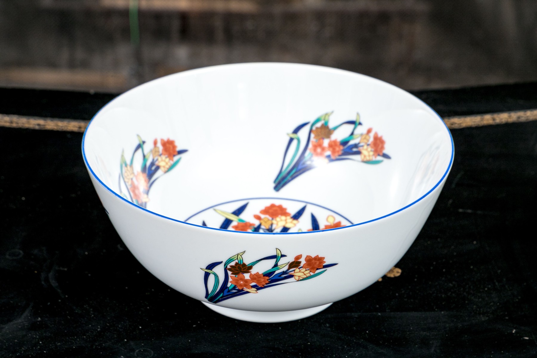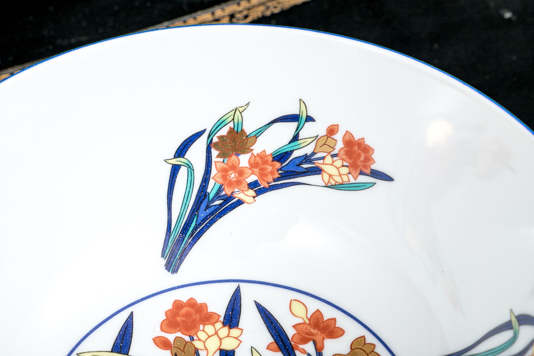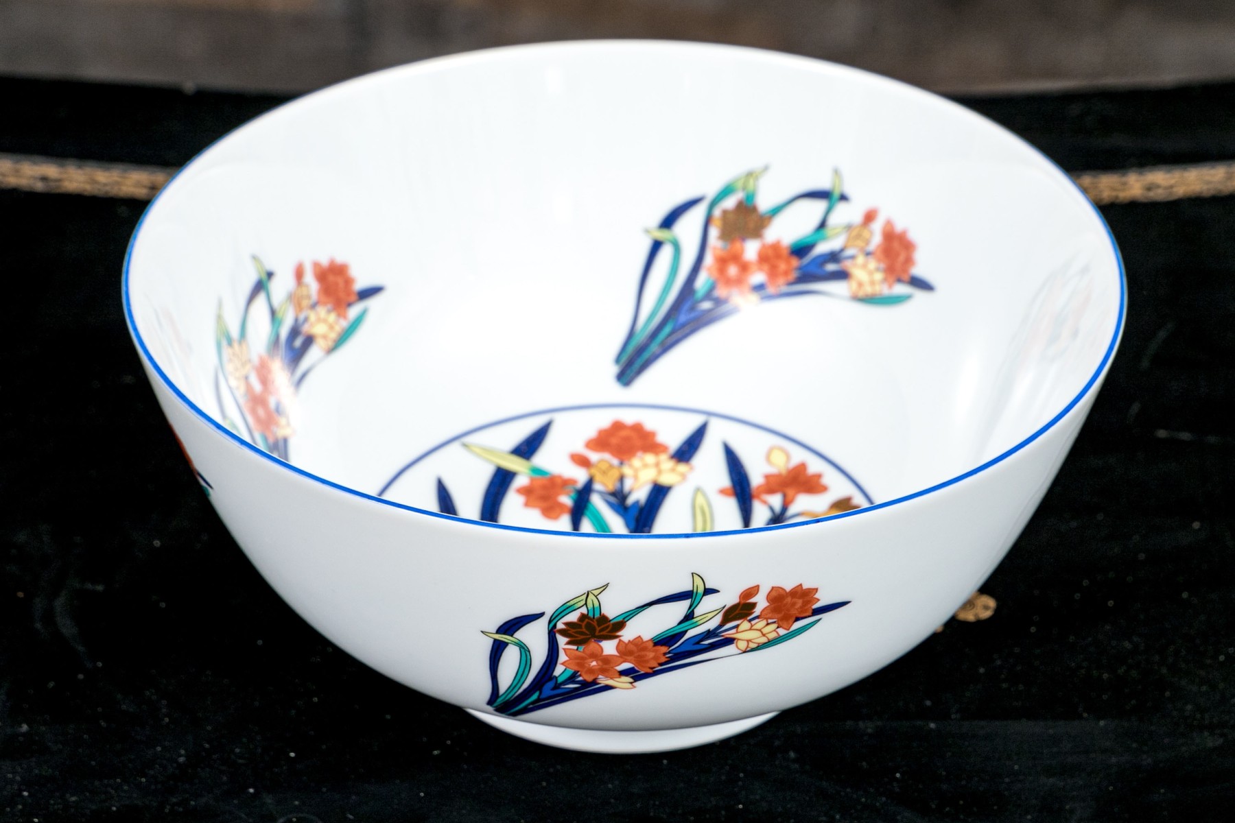 A gorgeous Tiffany & Co. "Freesia" porcelain centerpiece bowl in bright white with vibrant enameled floral sprays in blue, teal, yellow, and orange.